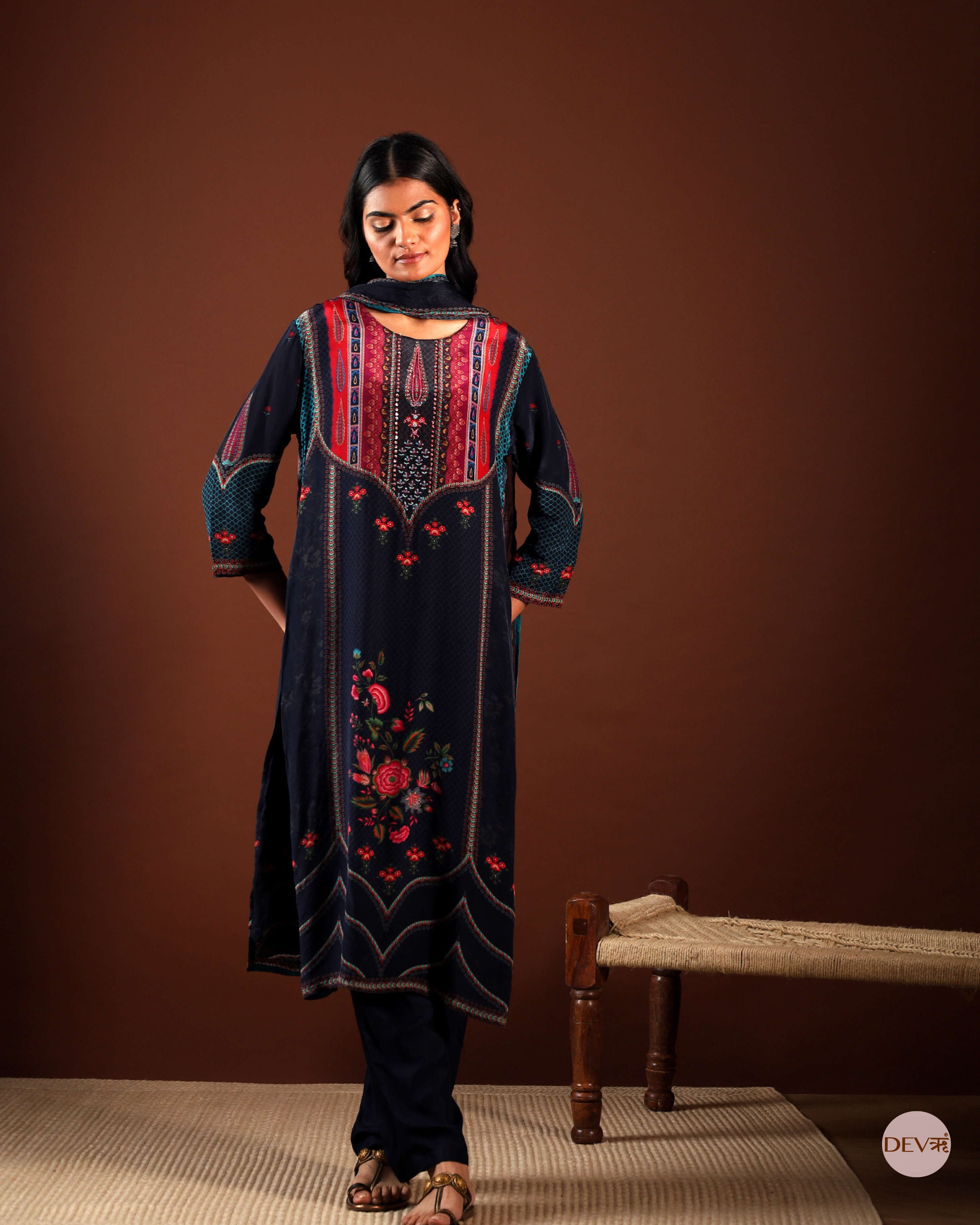 Vibrant Blue Silk Stiched Embroidered -Set Of 3