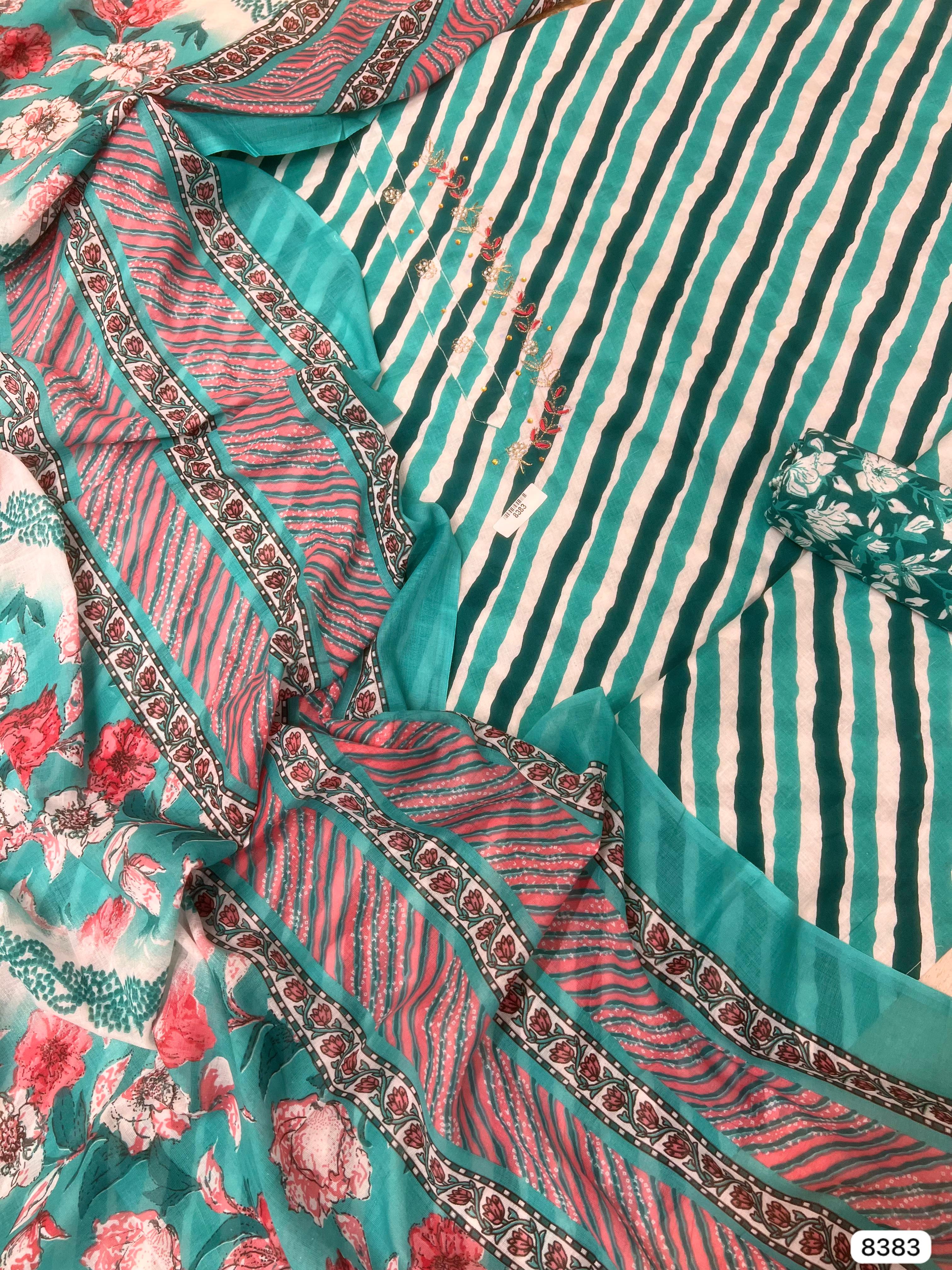 Zarveen Muslin teal and muted grey Printed 3-Piece Set (Devri – D.No 2019)