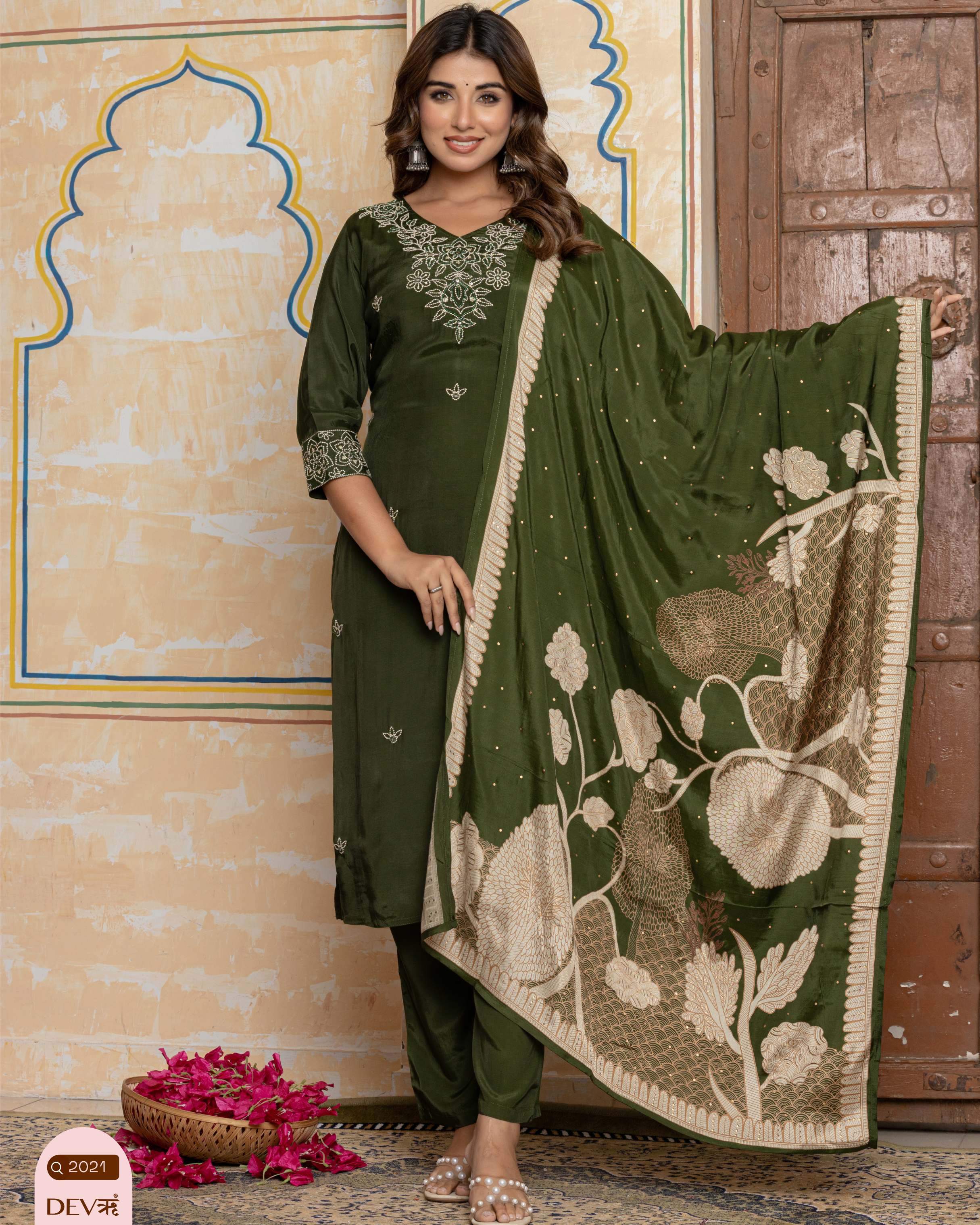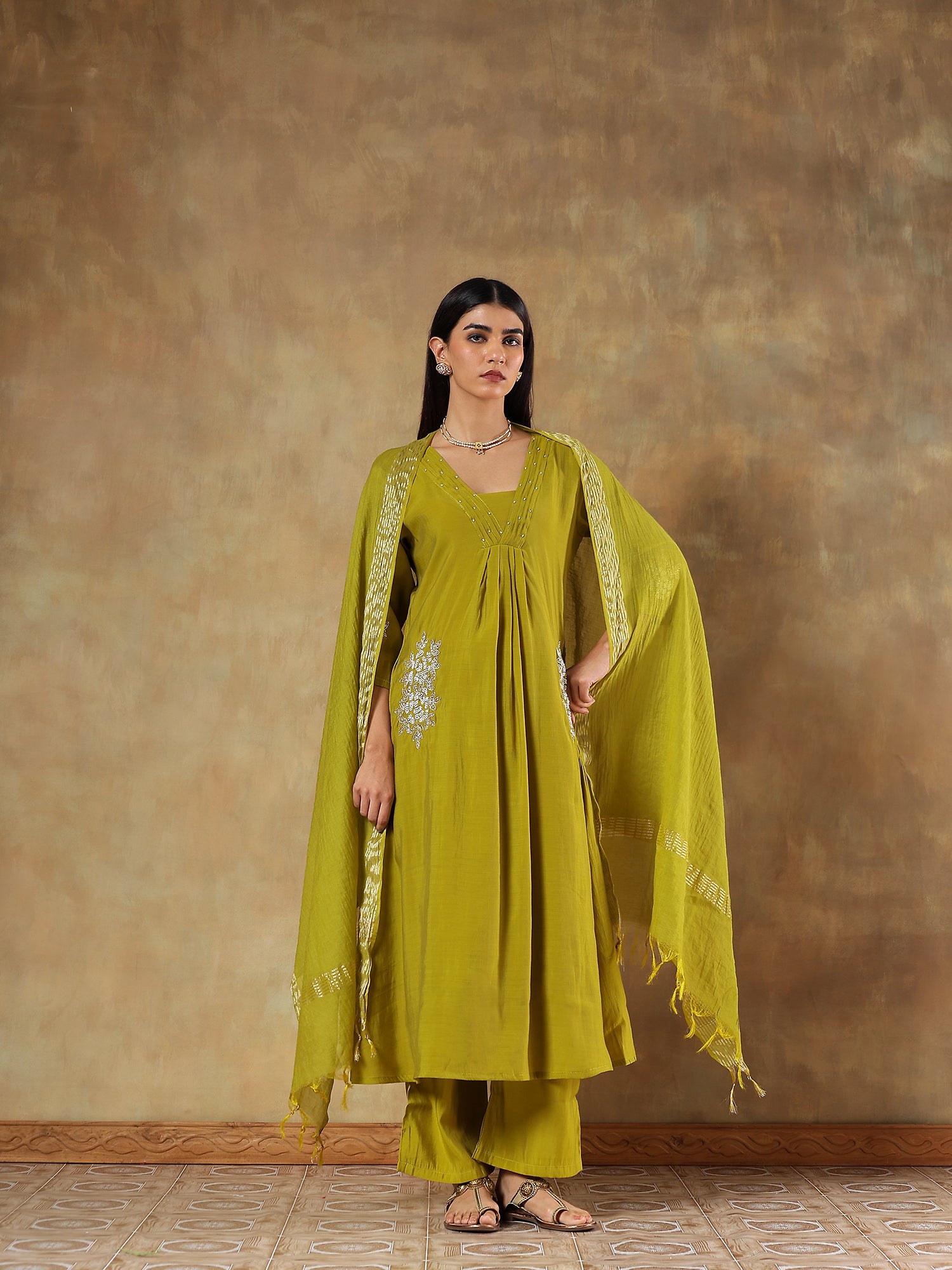 Ishani Olive Mul Chanderi Embroidered 3-Piece Set - {1072/M}