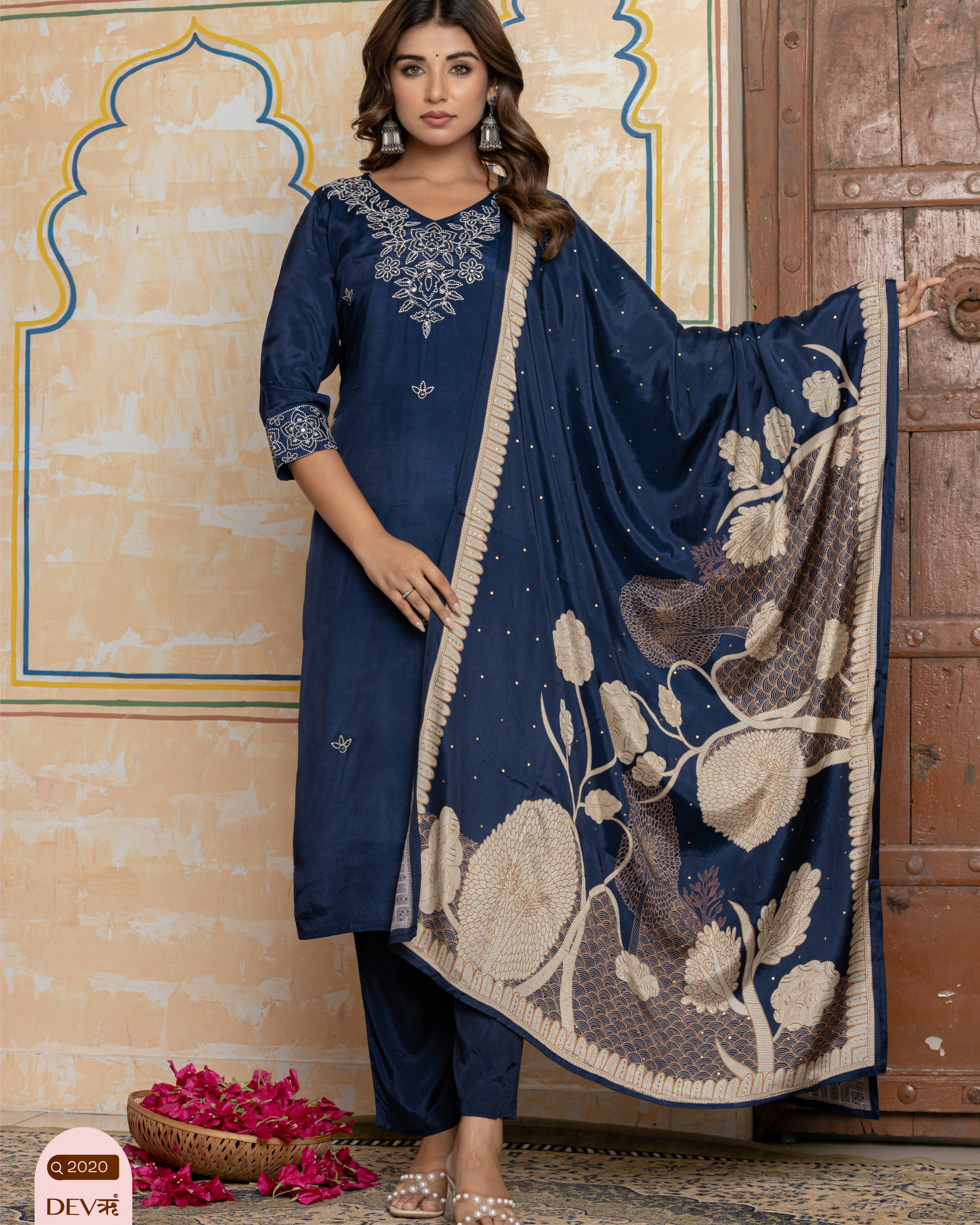 Vanya Mul Chanderi Hand-Embroidered 3-Piece Set (Devri – D.No 1078)