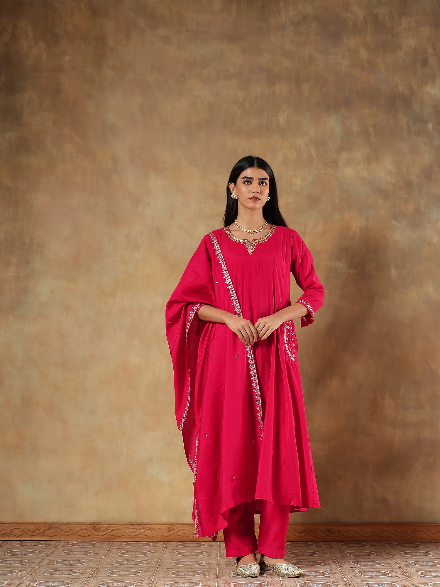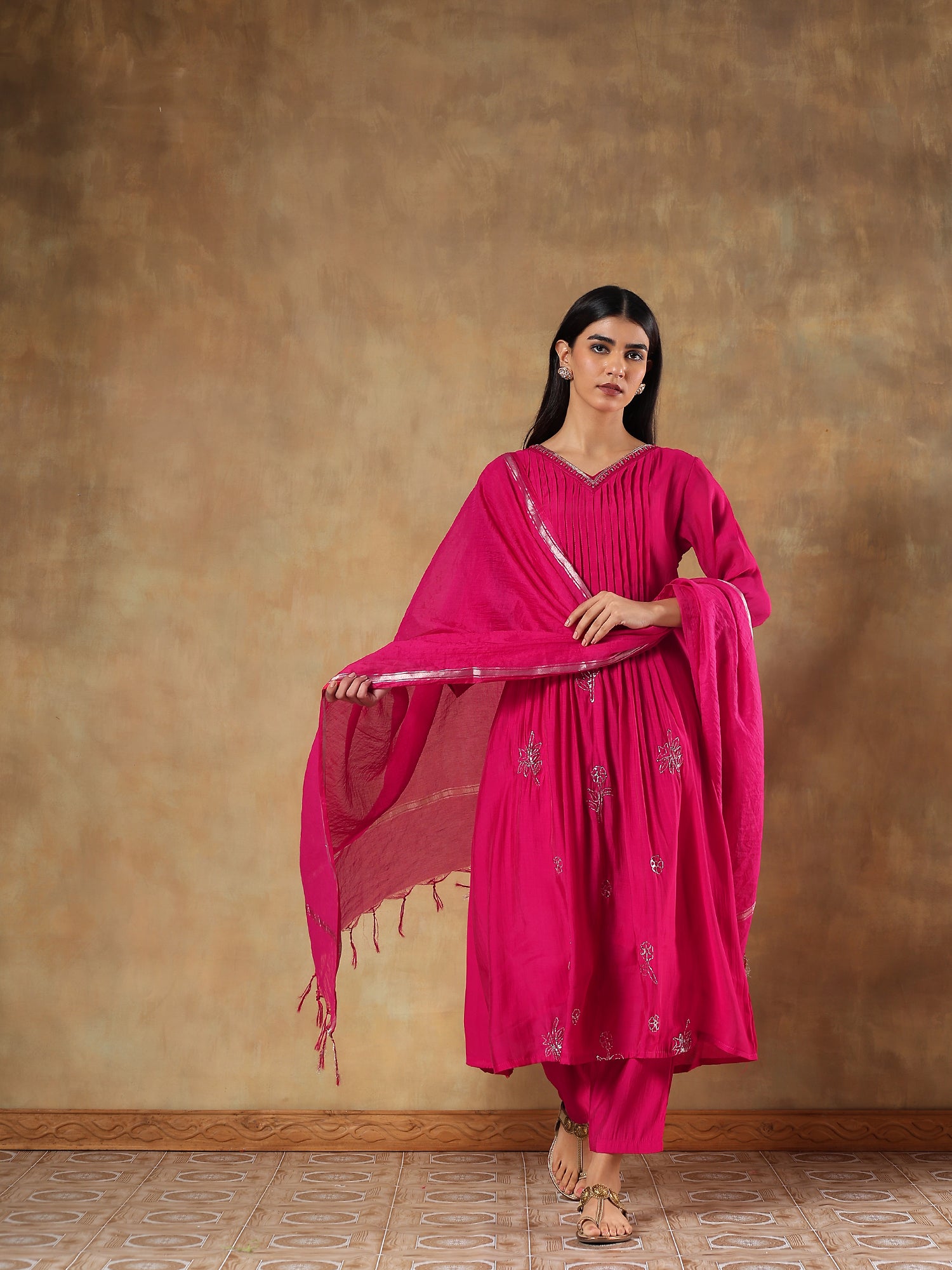 Aarini Fuchsia Mul Chanderi Embroidered 3-Piece Set - {1071/M}