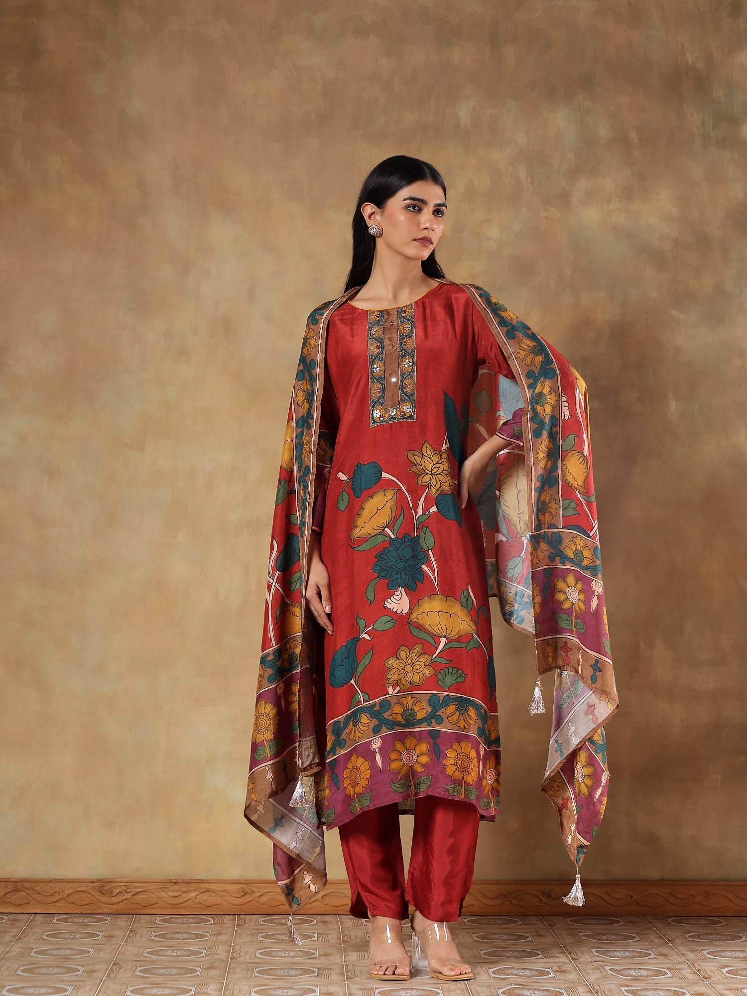 Nayantara Crimson Russian Silk Embroidered 3-Piece Set - {1073/M}