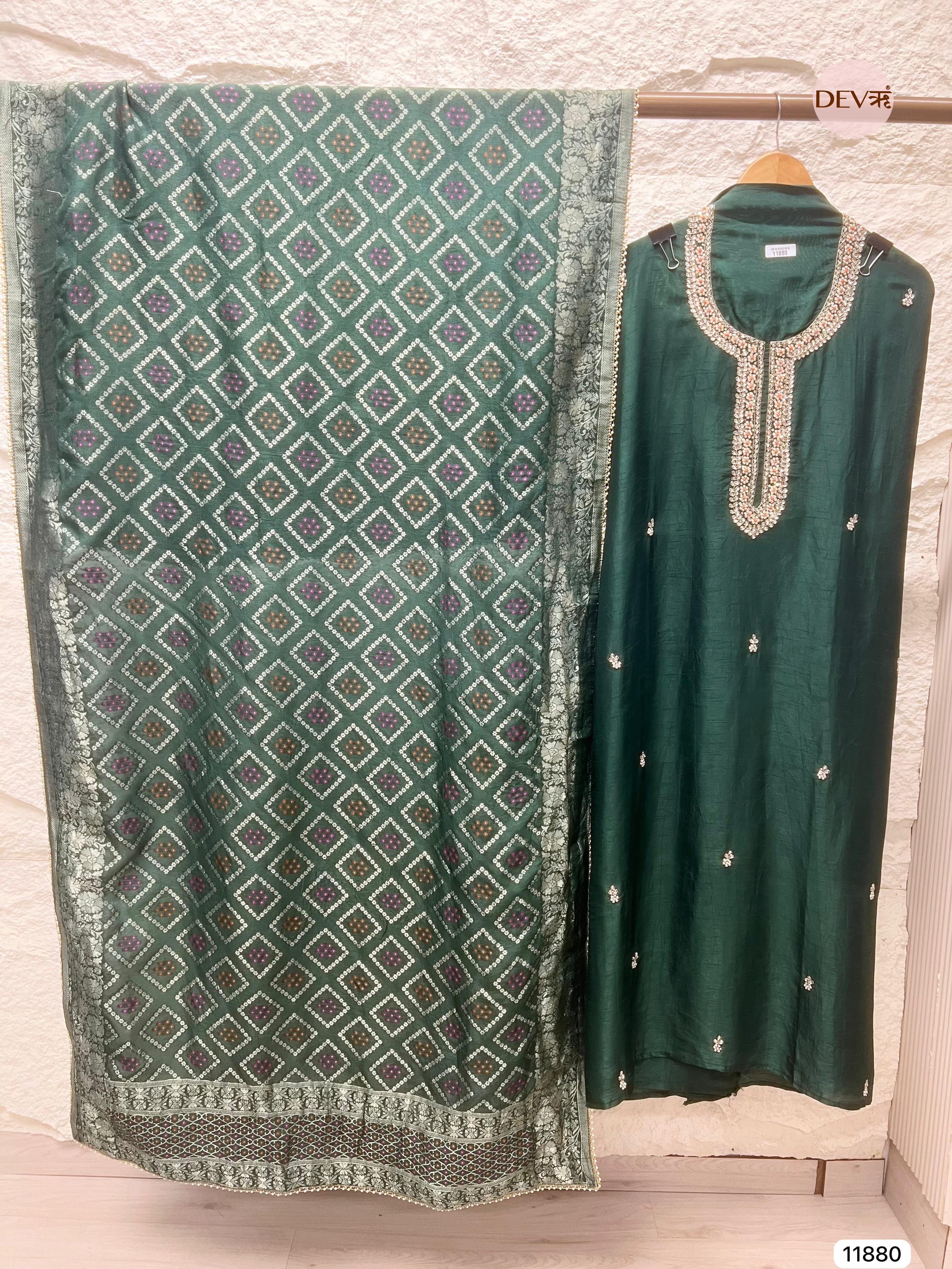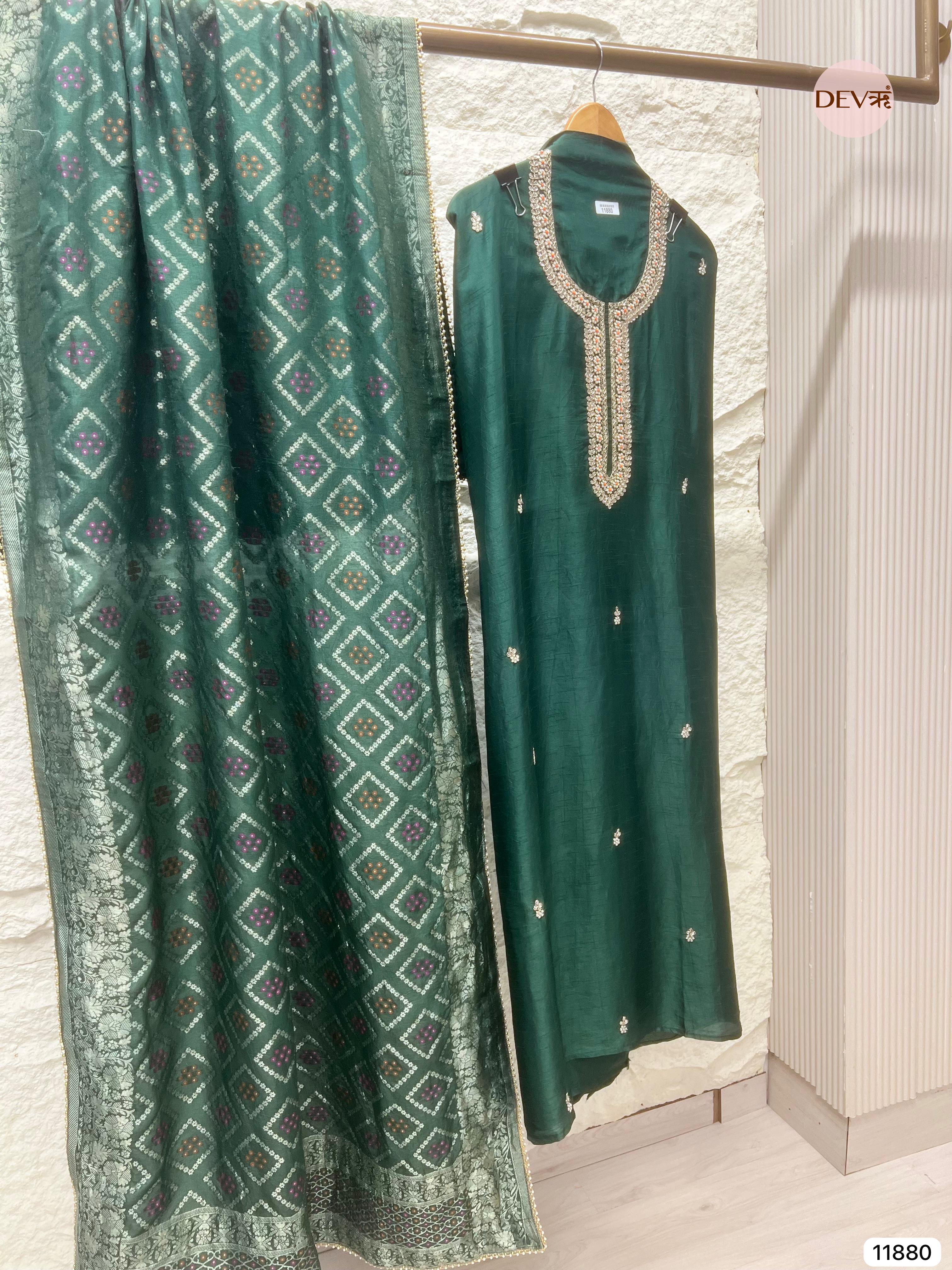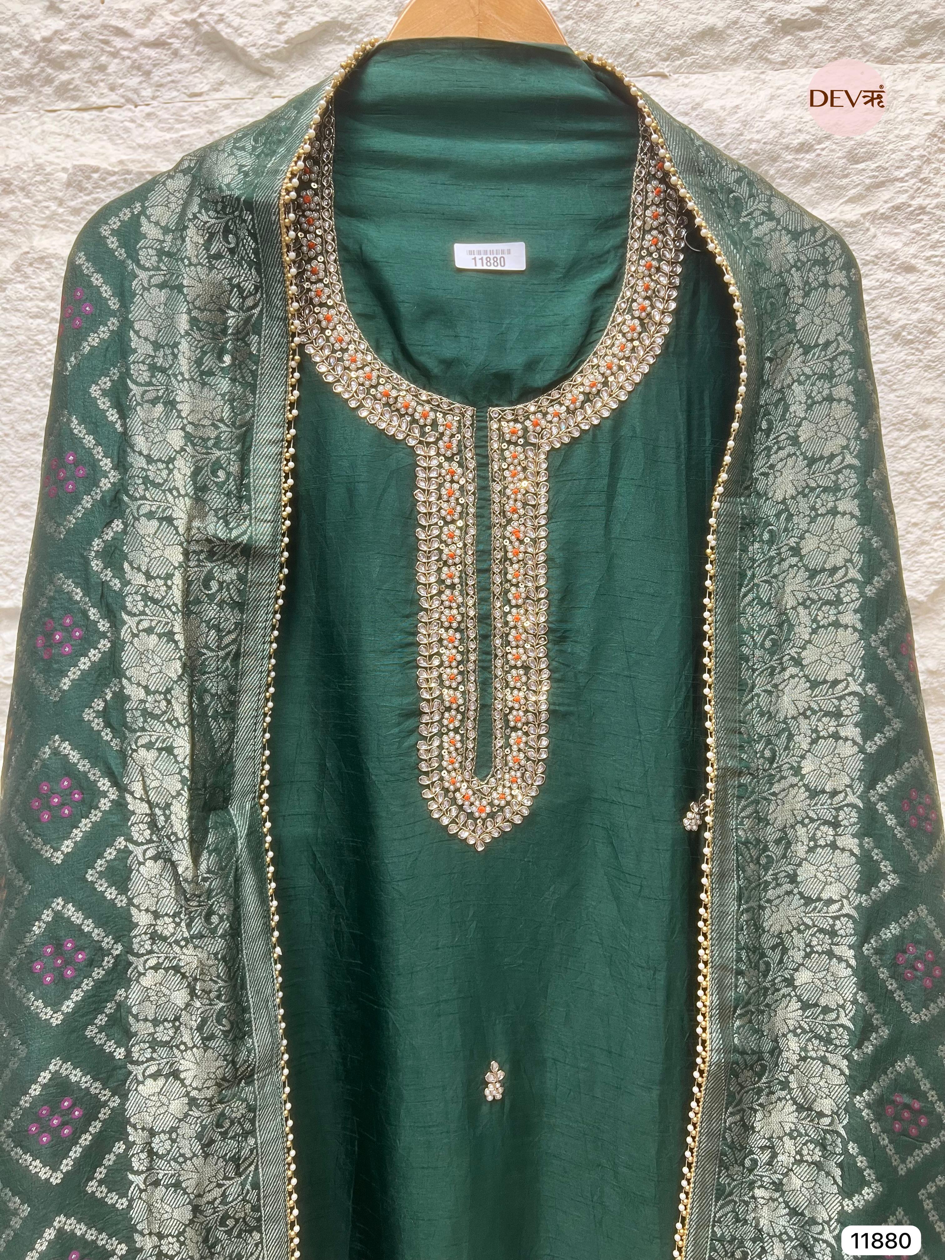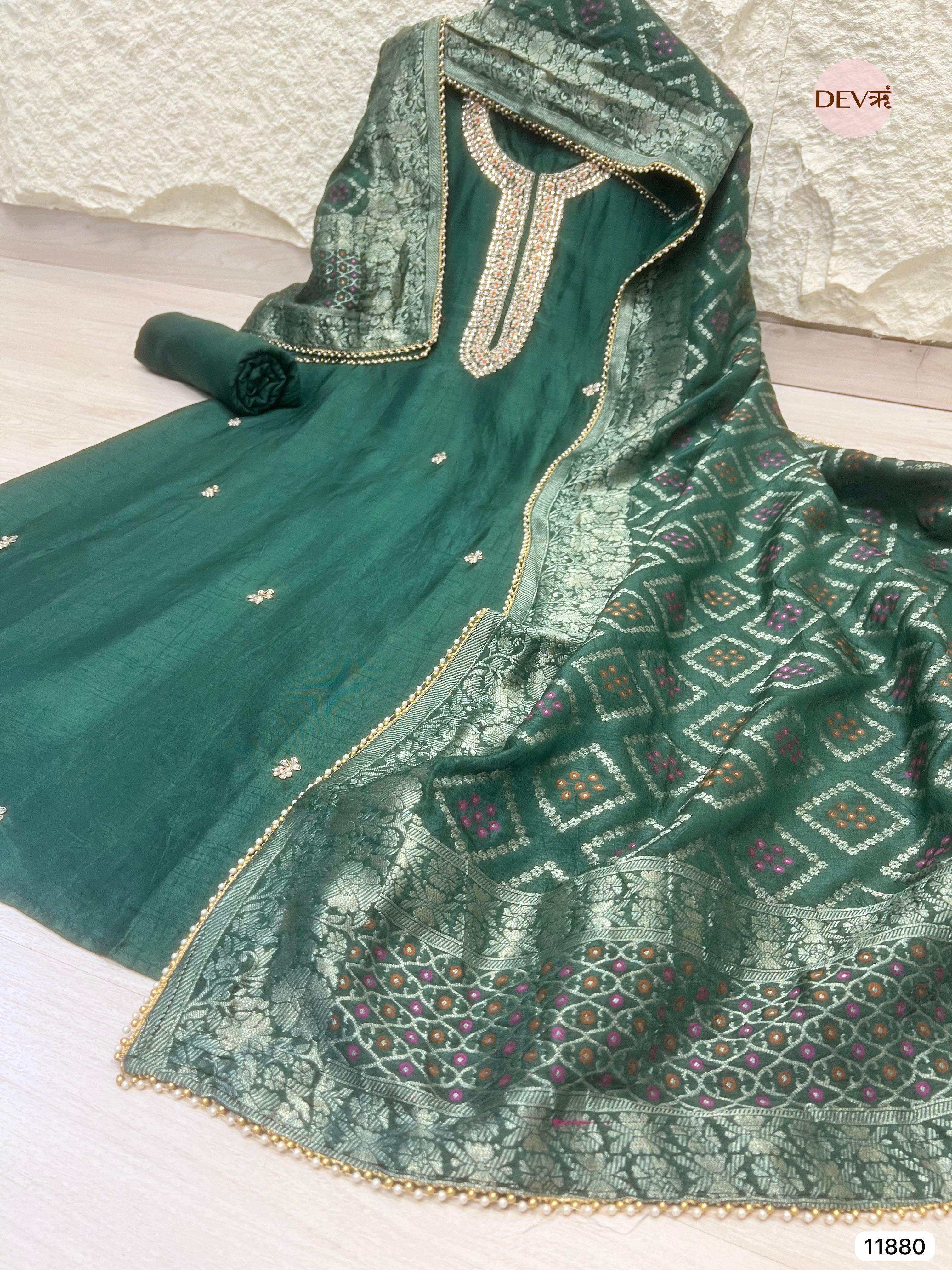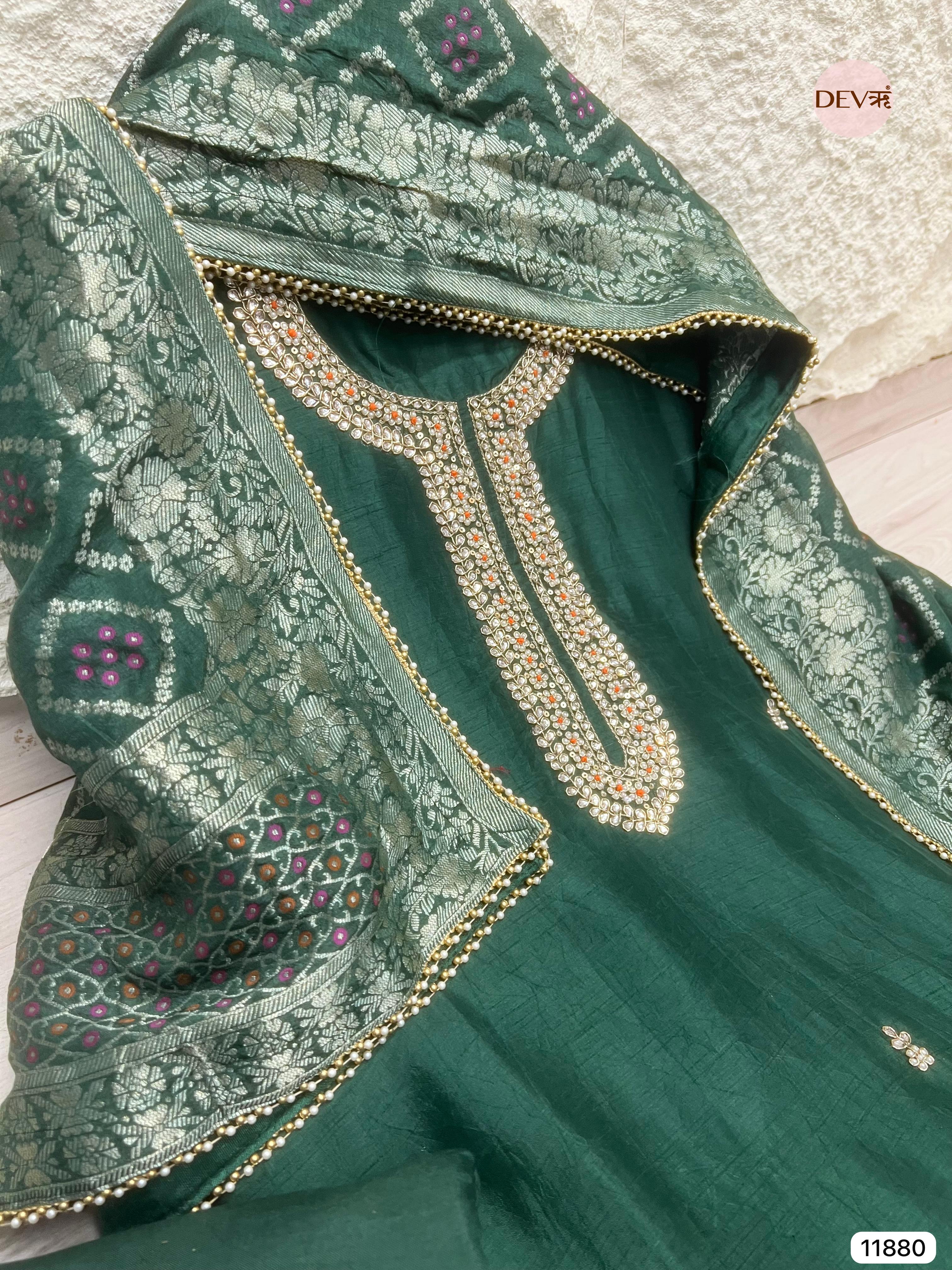 Green Pure Dola Silk Unstitched Banarasi Woven Hand Embroidered -Set Of