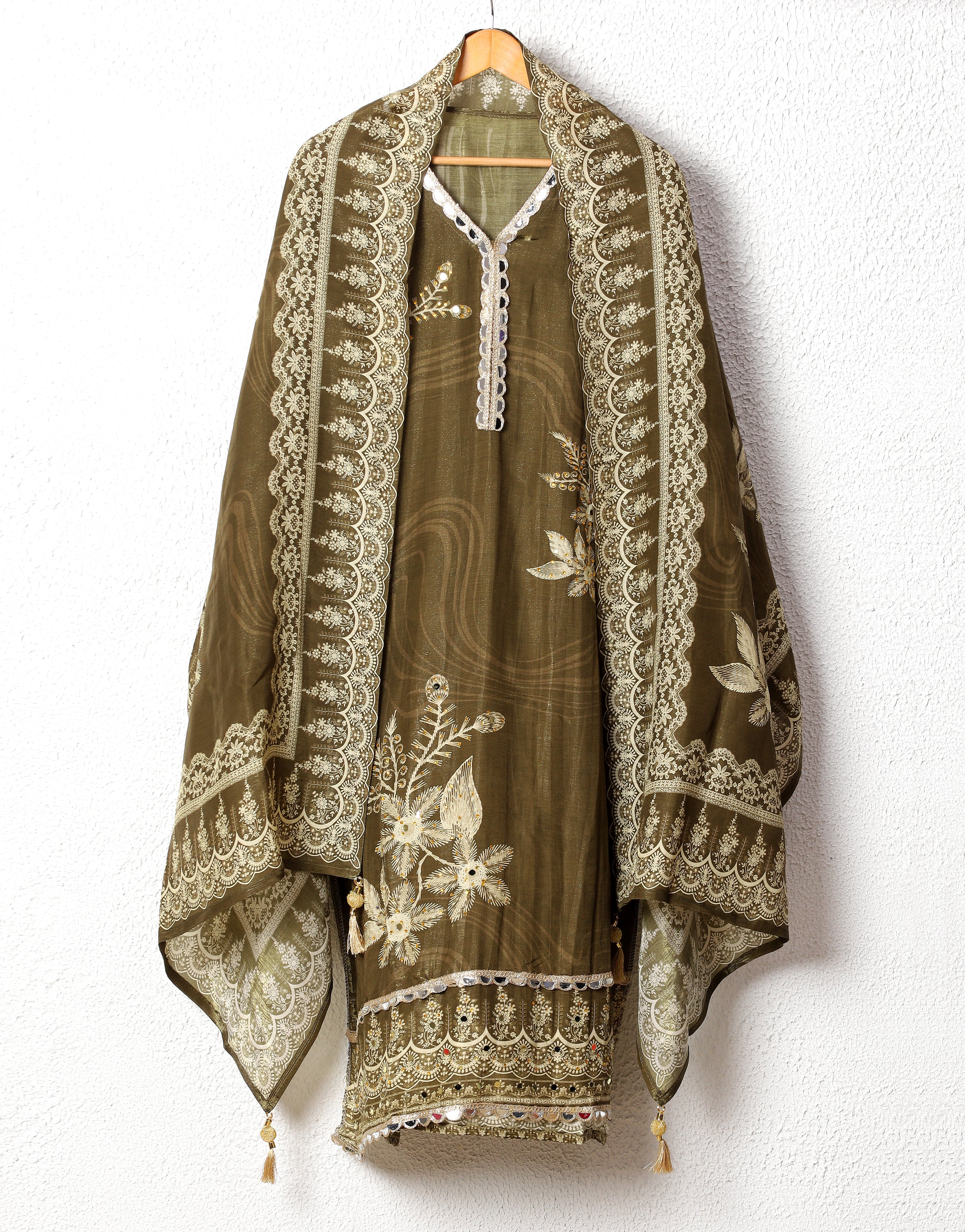 Olive Glass Organza Silk Embroidered Unstitched 3-Piece Suit (Devri – D.No 11728)