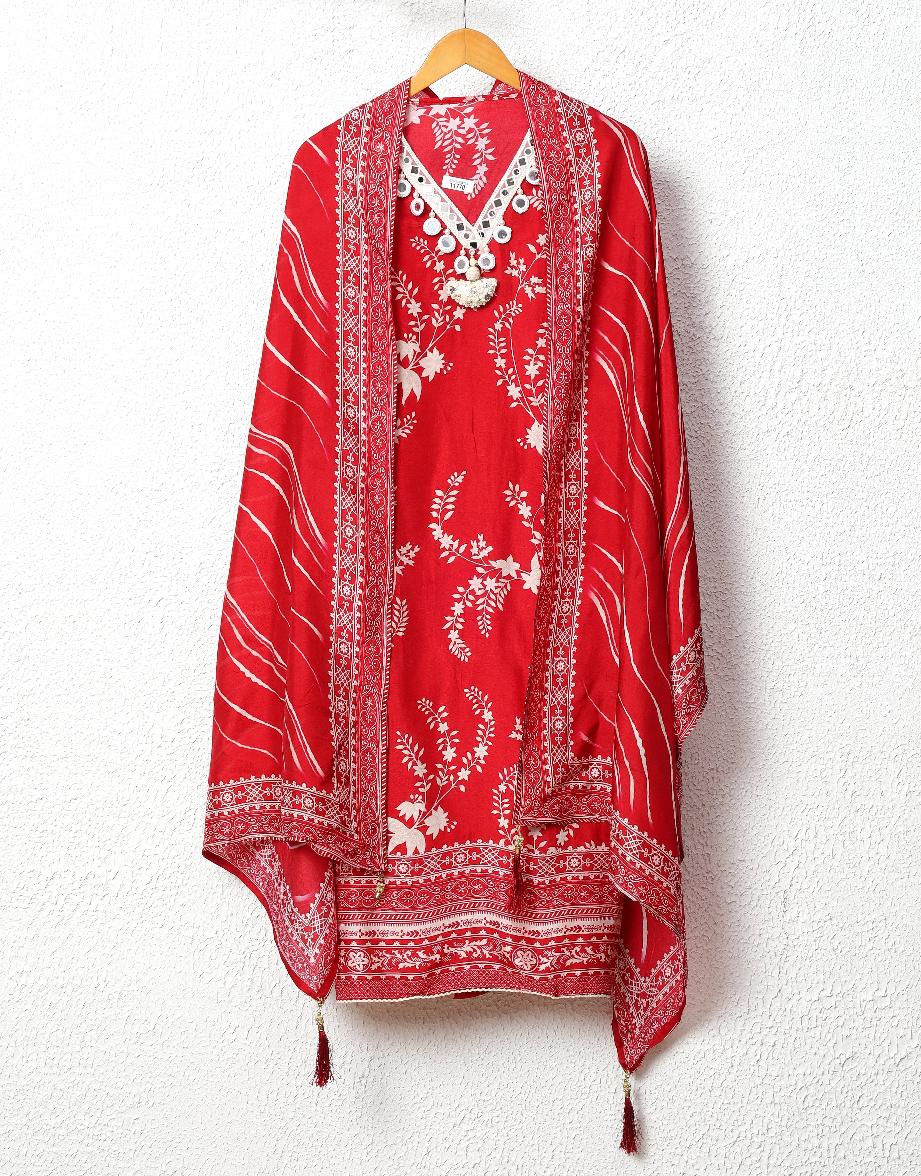Red Pure Russian Silk Semi stitched Hand Embroidered -Set Of 3 - {12170}