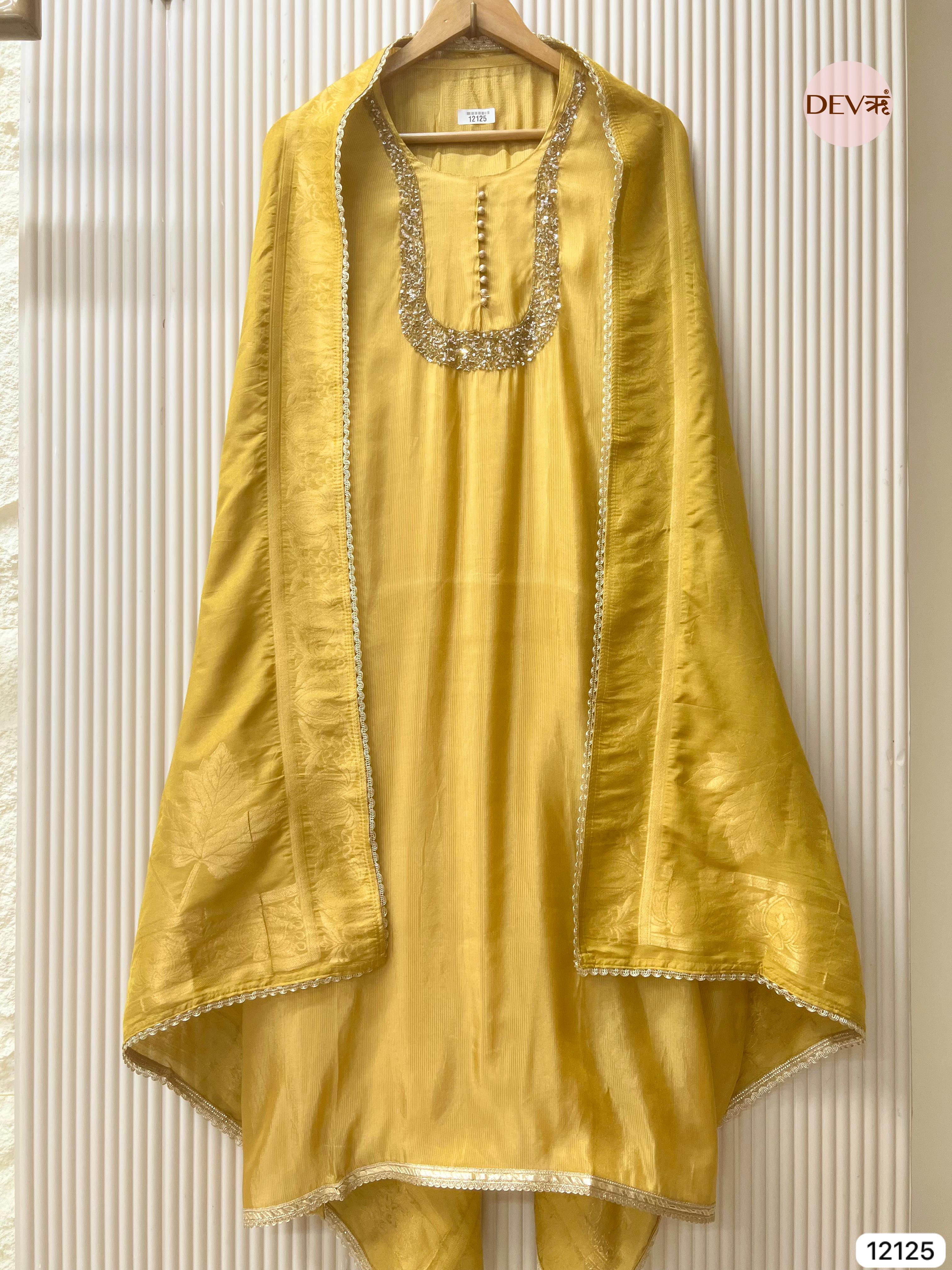 Yellow Shimmer Silk Unstitched Hand Embroidered -Set Of 3 - {12125}