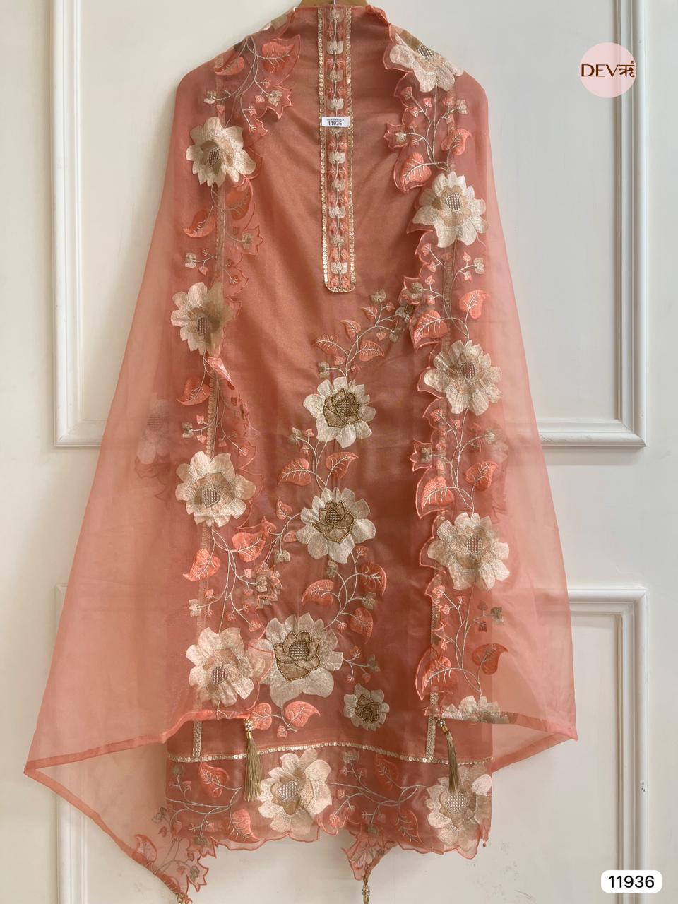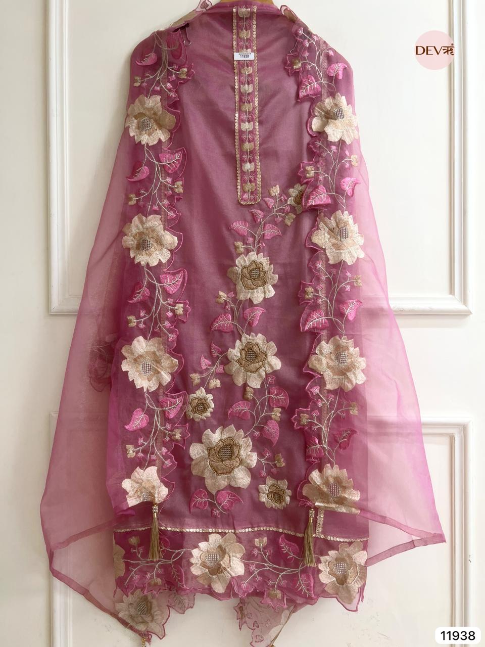 {11996}Pink Pure Organza Silk Semi stitched Printed Embroidered -Set Of 3