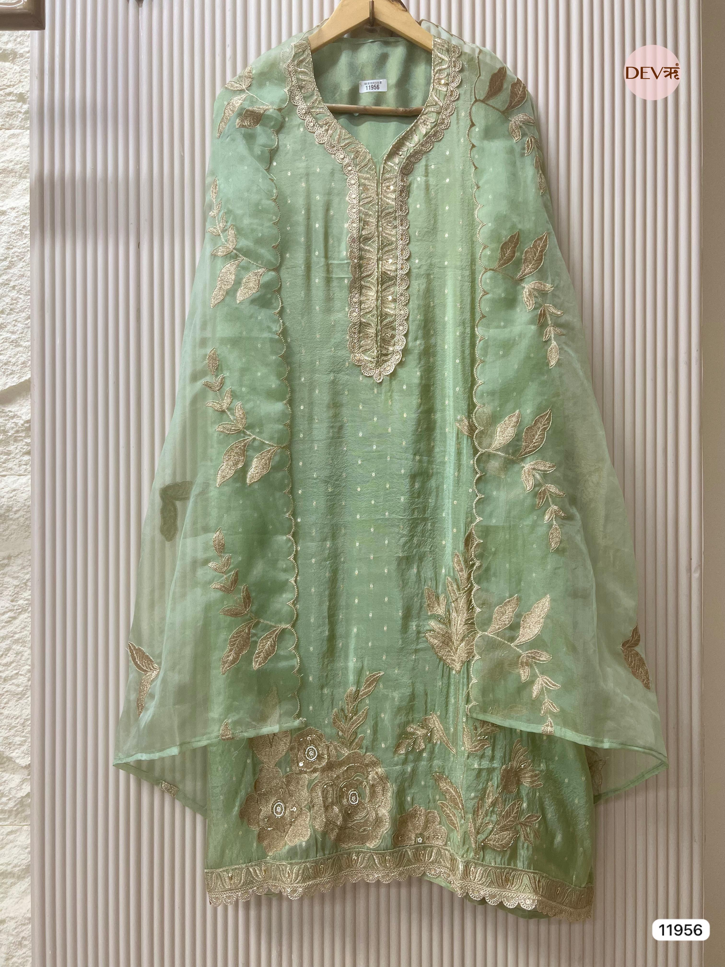 Green Tissue Shimmer Silk Banarasi Weave Unstitched Embroidered -Set Of 3 - {12039}