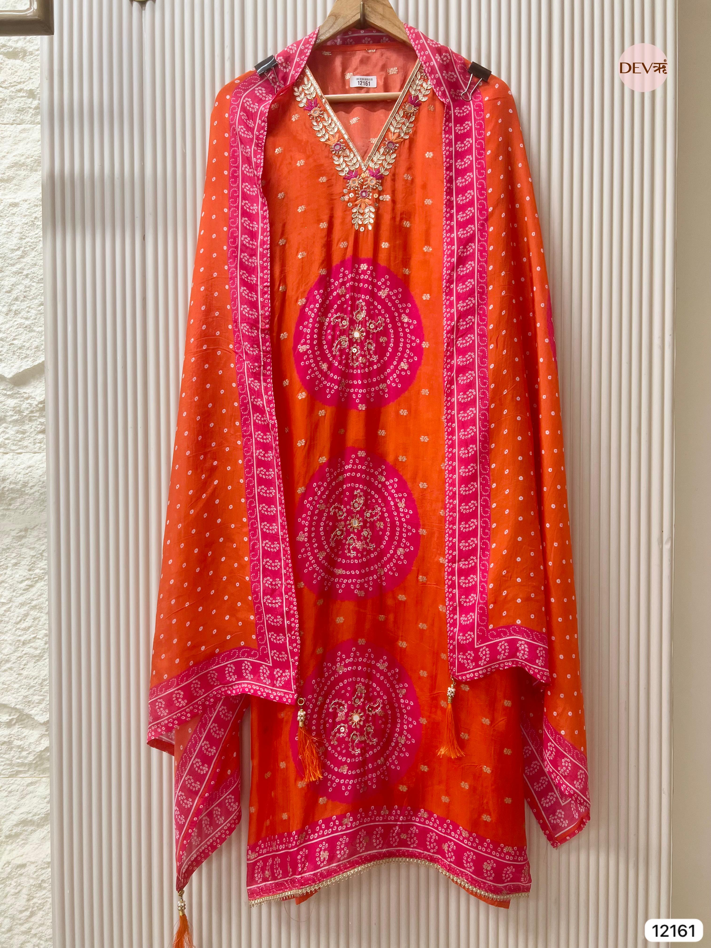 Orange Pure Shimmer Organza Silk Unstitched Banarasi Woven Bandhani Printed Hand Embroidered -Set Of 3 - {12161}
