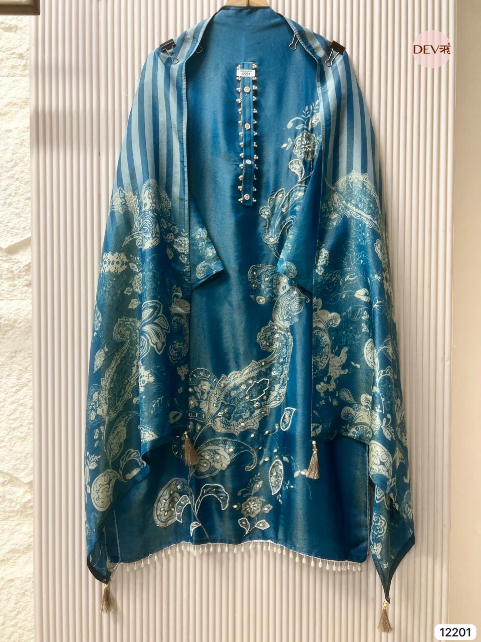 Firoza Blue or Sea Green Tissue Silk Unstitched Hand Embroidered -Set Of 3 {11512}