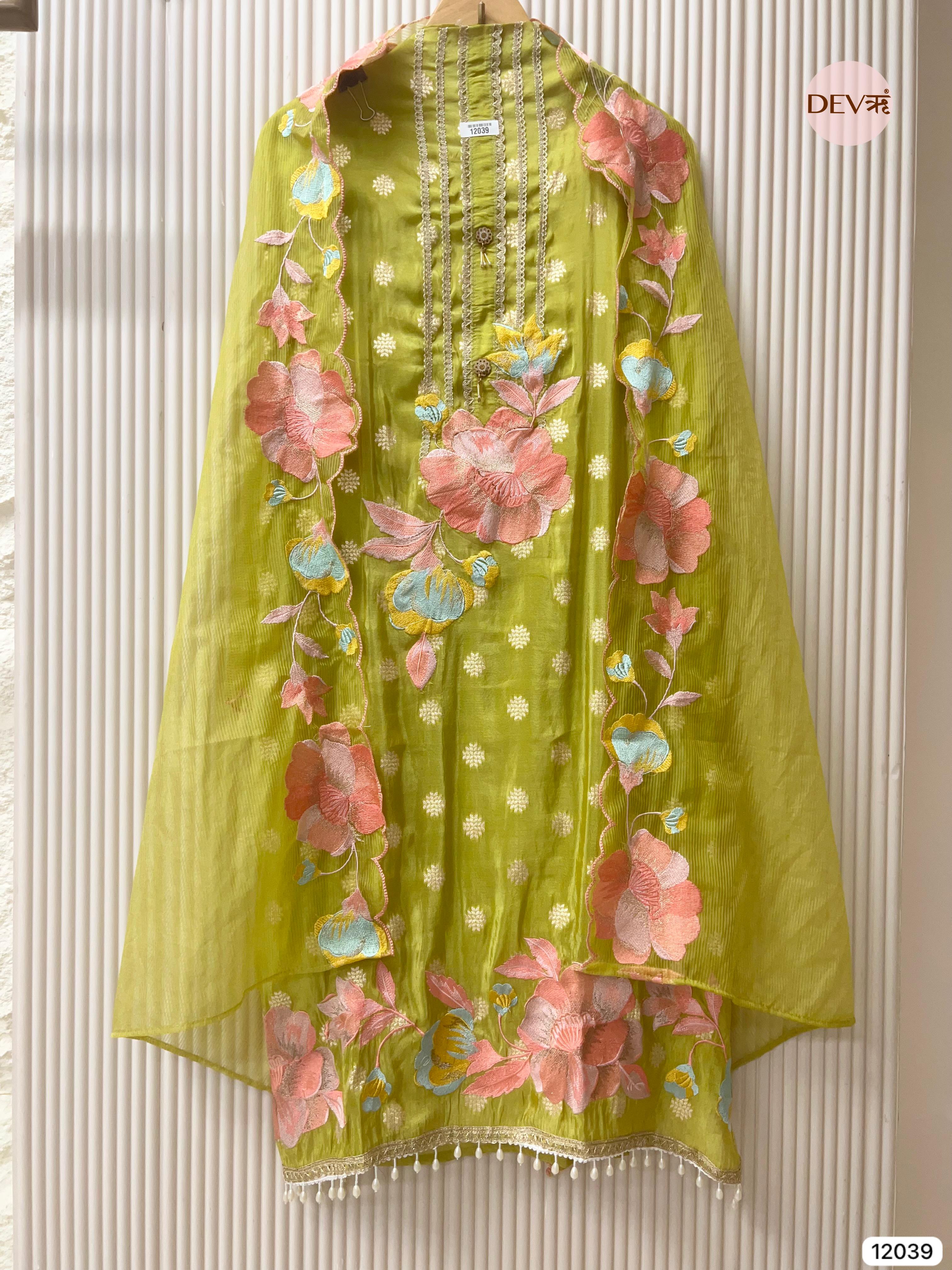 Lime Shimmer Tissue Silk Embroidered Unstitched 3-Piece Suit (Devri – D.No 11729)