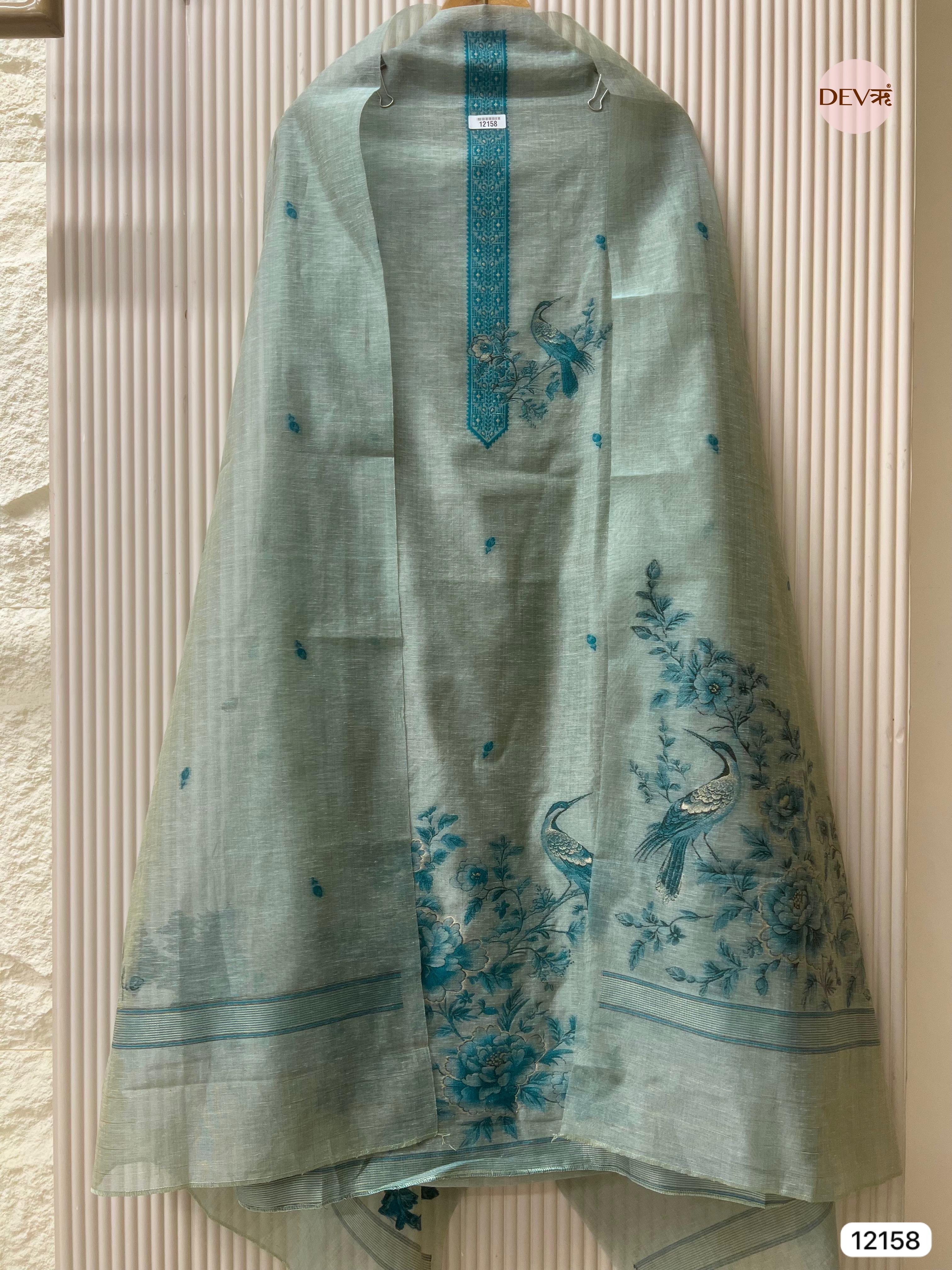 {12158} Green Jamdani Linen Unstitched - Set Of 3