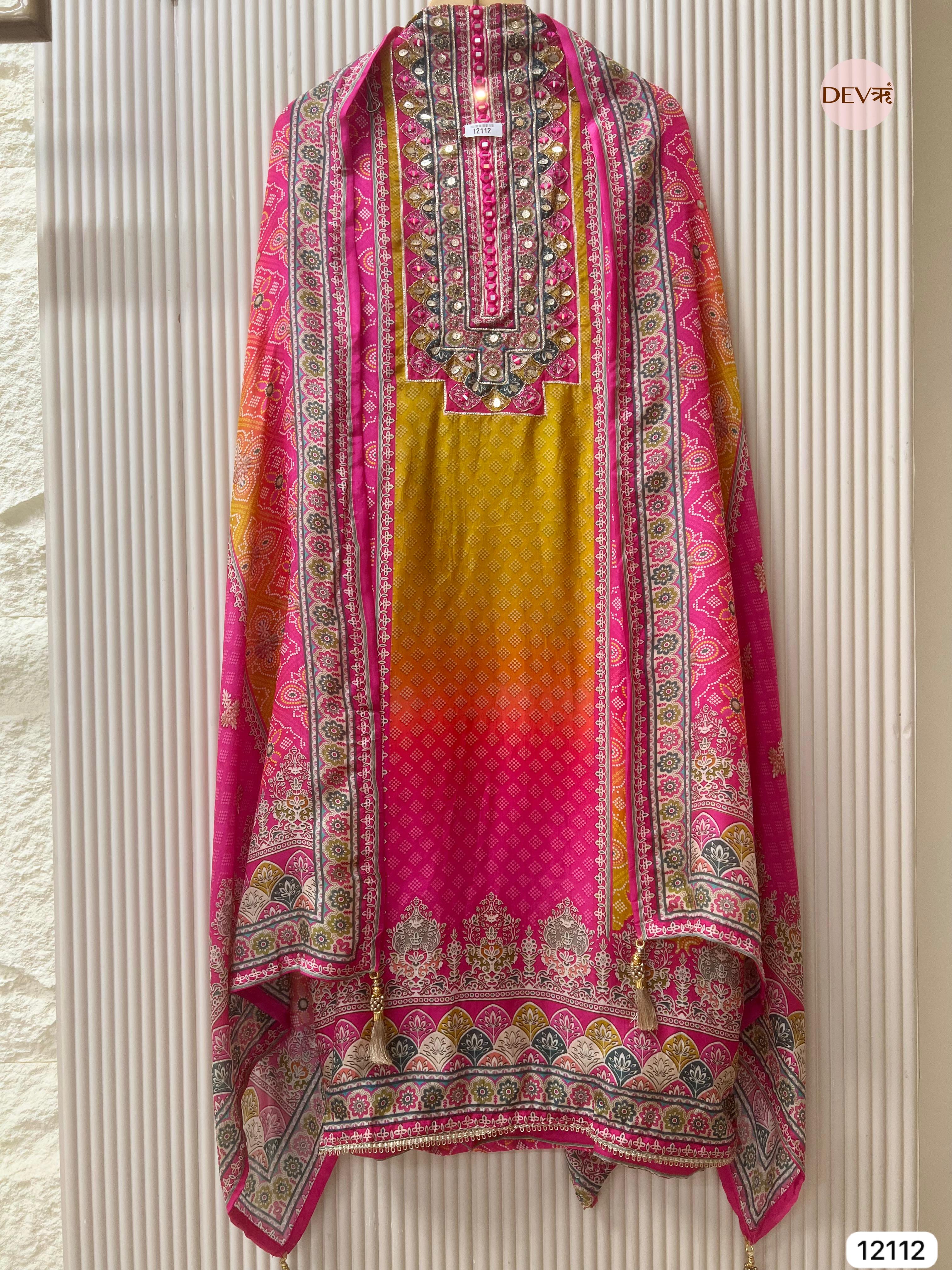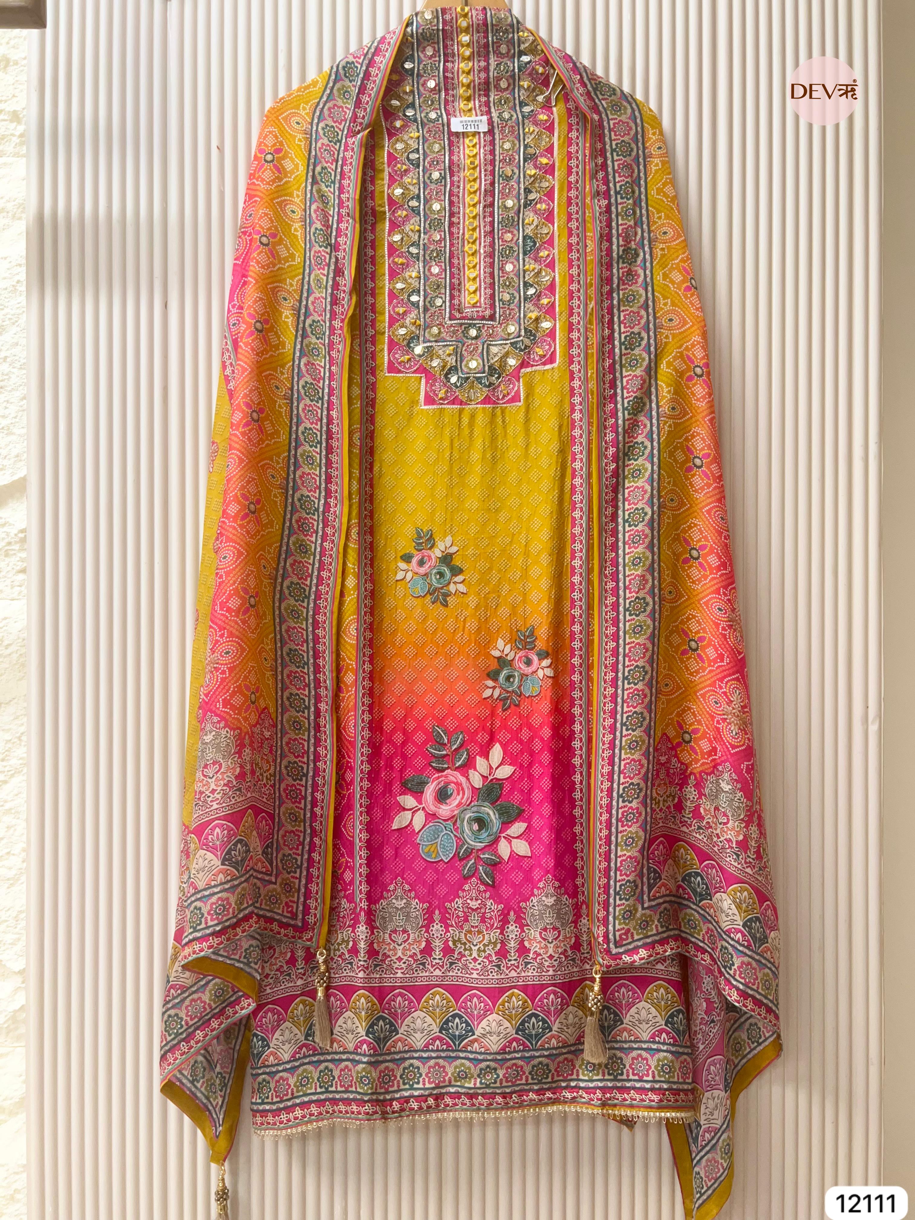 Pink / yellow Pure Organza Silk Unstitched Printed -Set Of 3 - {12112}