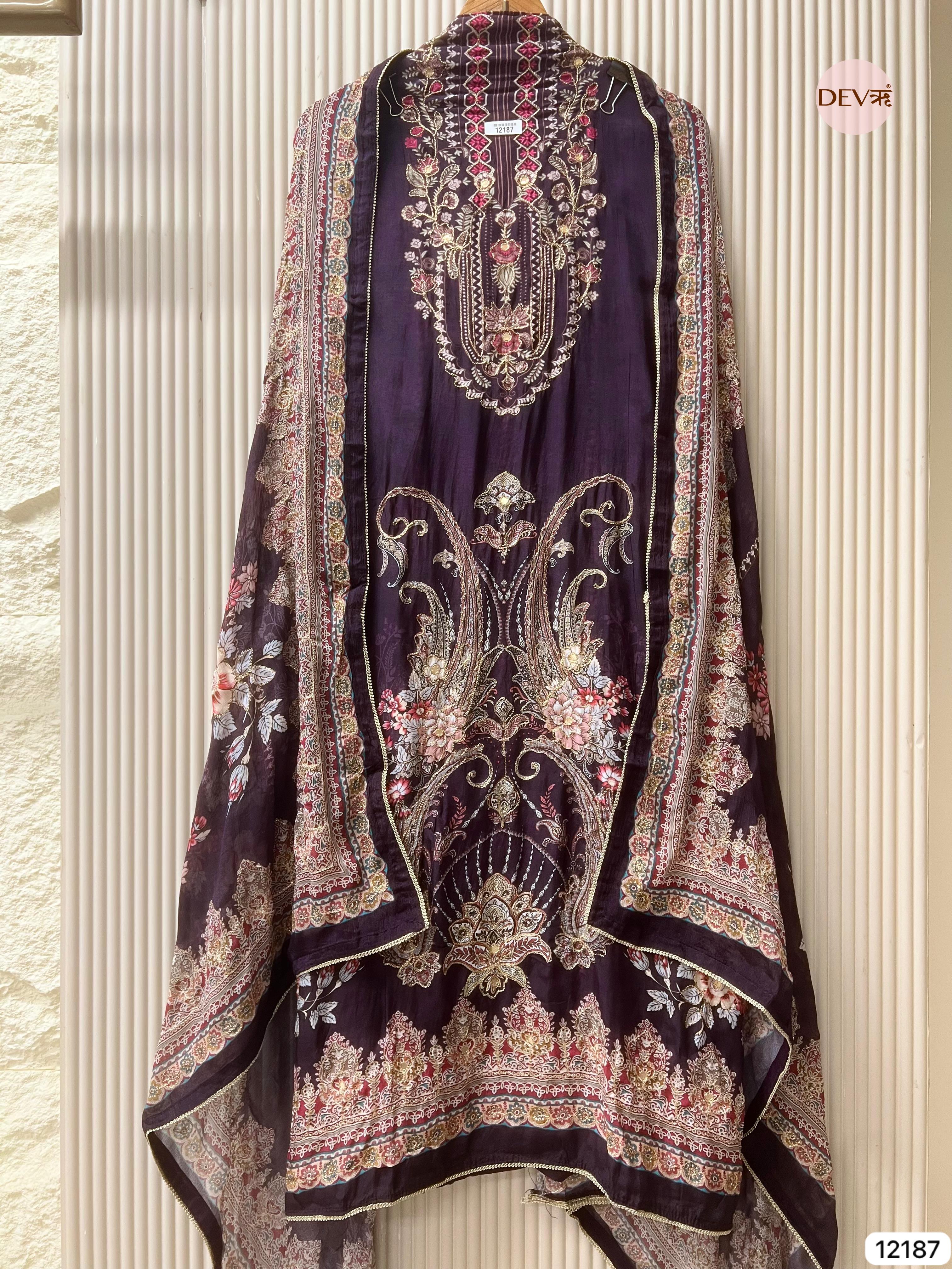 Purple Pure Chinon Unstitched Hand Embroidered -Set Of 3 - {12281}
