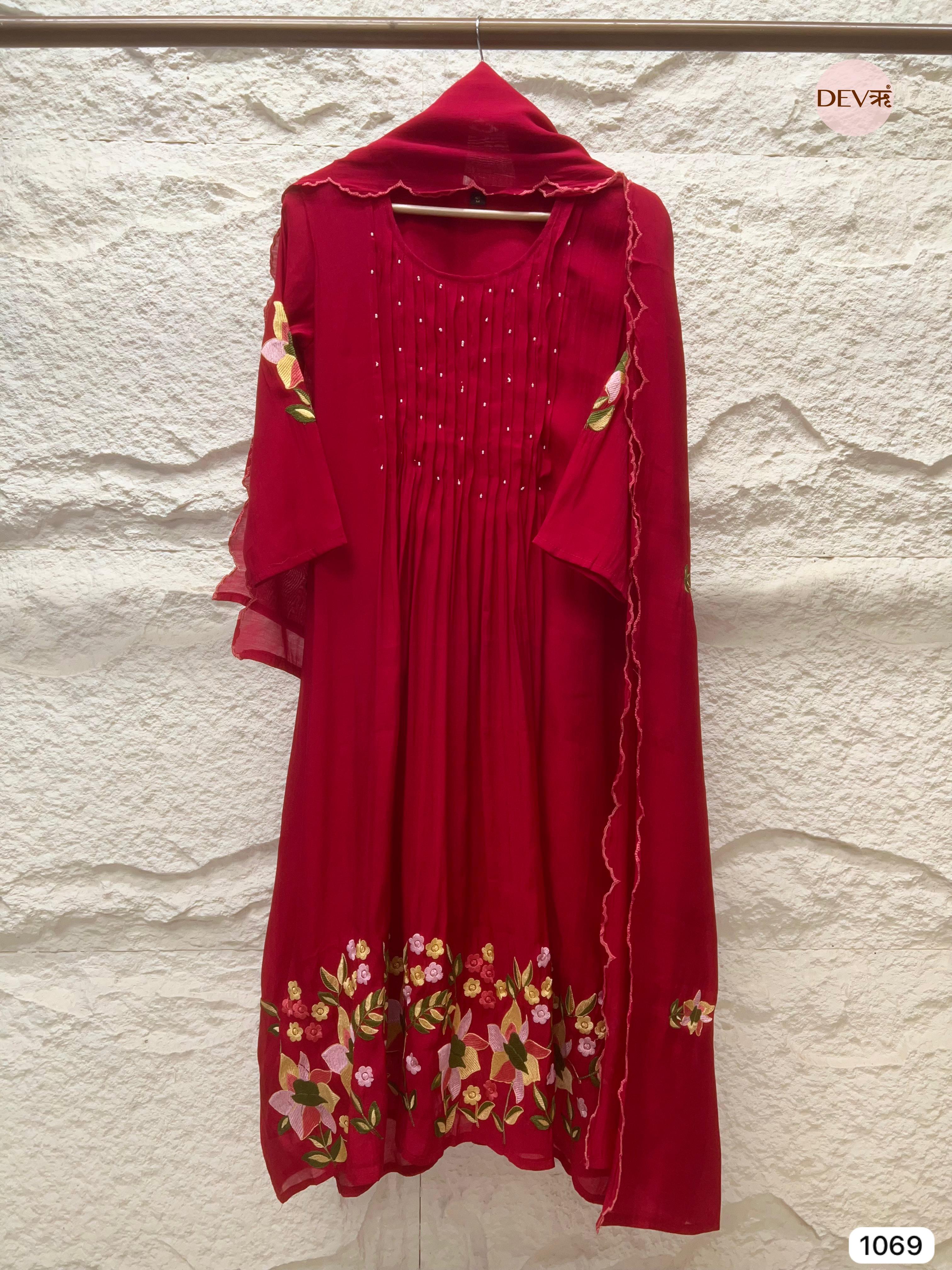 A vibrant red silk set defined by its lively floral embroidery. The A-line kurta features neat pleating along the front and multicoloured threadwork florals embroidered across the hem and sleeves. Paired with a soft silk dupatta and solid shantoon pants, this ensemble captures a balance of festive colour and everyday sophistication.