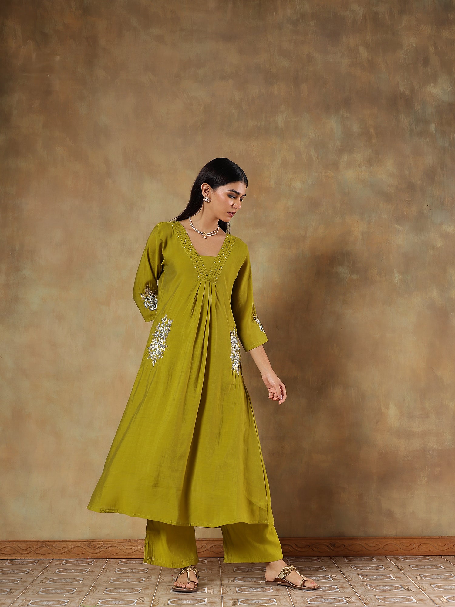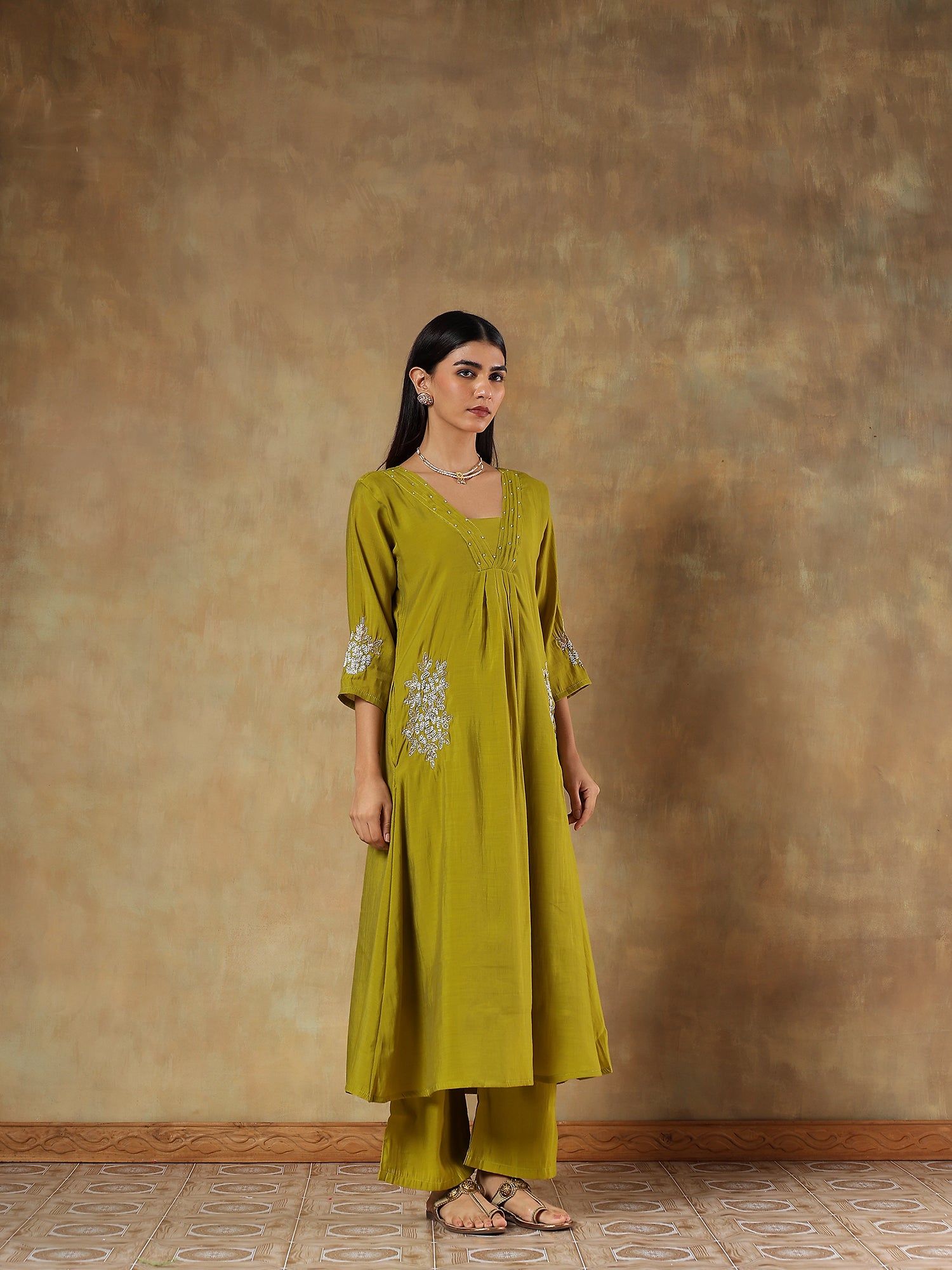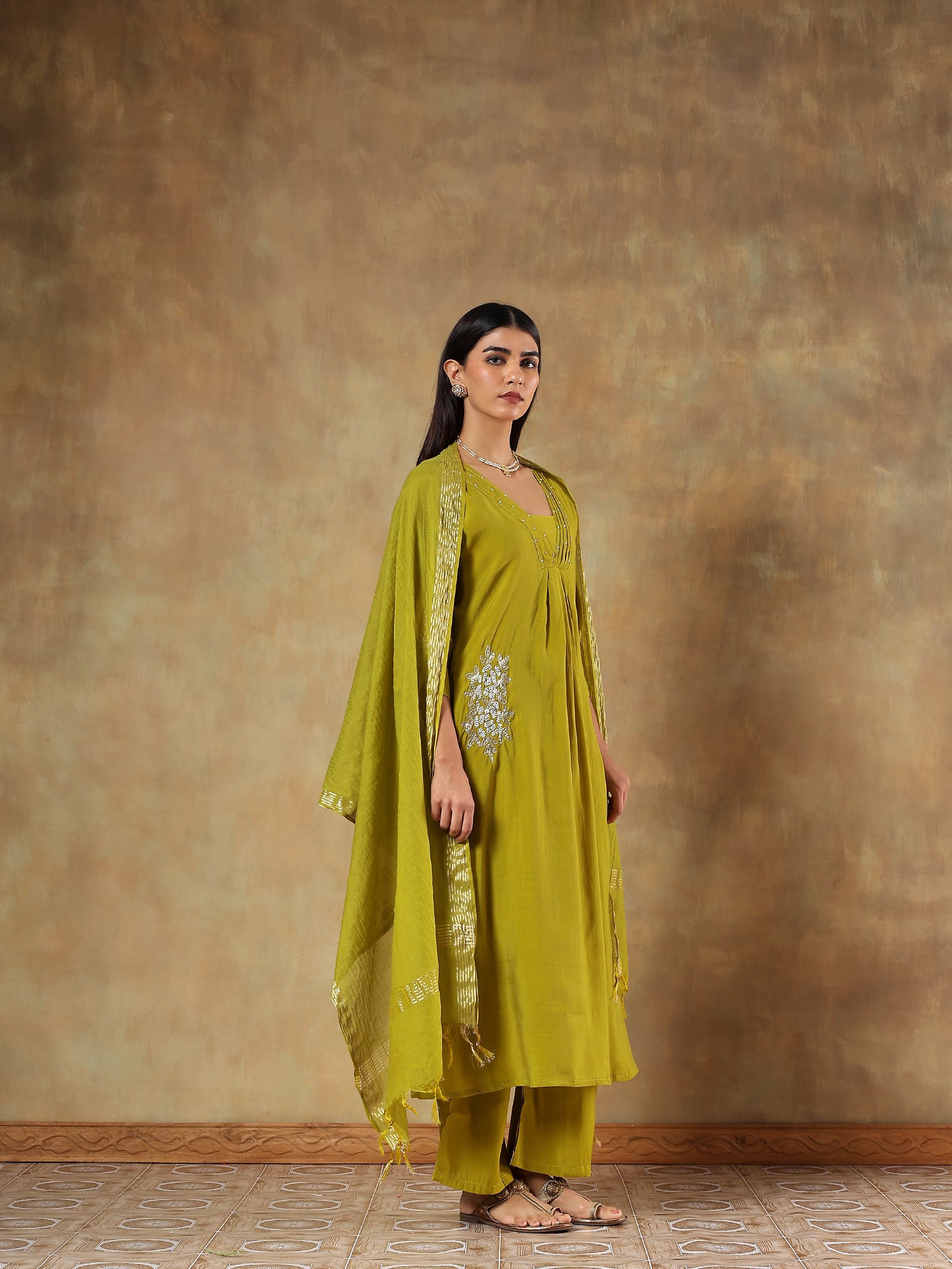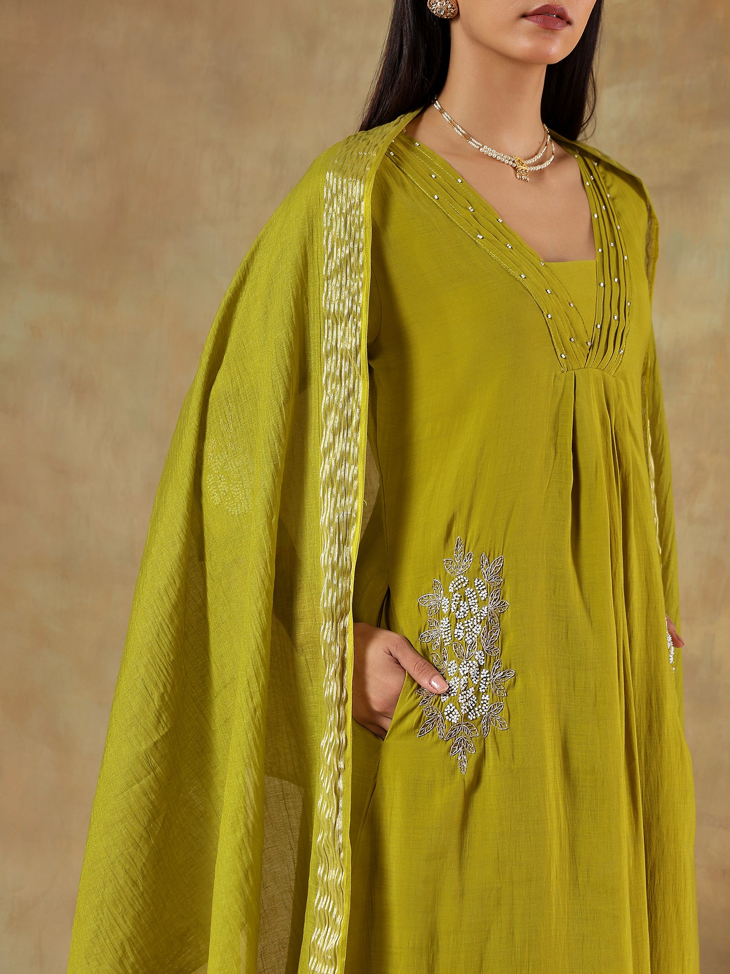 An elegant blend of subtle sheen and earthy charm, this olive ensemble is crafted in lightweight mul chanderi with intricate thread and bead embroidery along the neckline and sleeves. The soft silk dupatta with woven highlights enhances its festive appeal while maintaining Devri’s signature understated grace.