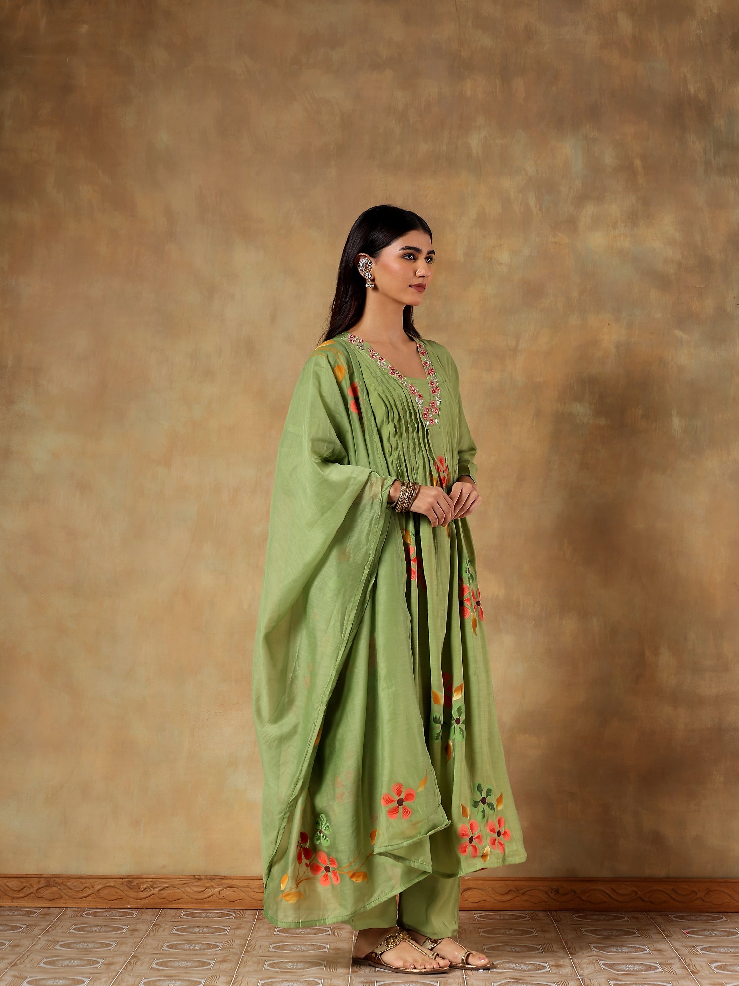 A refreshing pistachio-green mul chanderi set that beautifully balances print and handwork. The A-line kurta features delicate pleating through the front, enhanced with floral hand embroidery around the neckline and soft painted-style floral motifs across the body. Paired with a coordinated dupatta and solid shantoon pants, this ensemble radiates effortless charm and understated artistry.