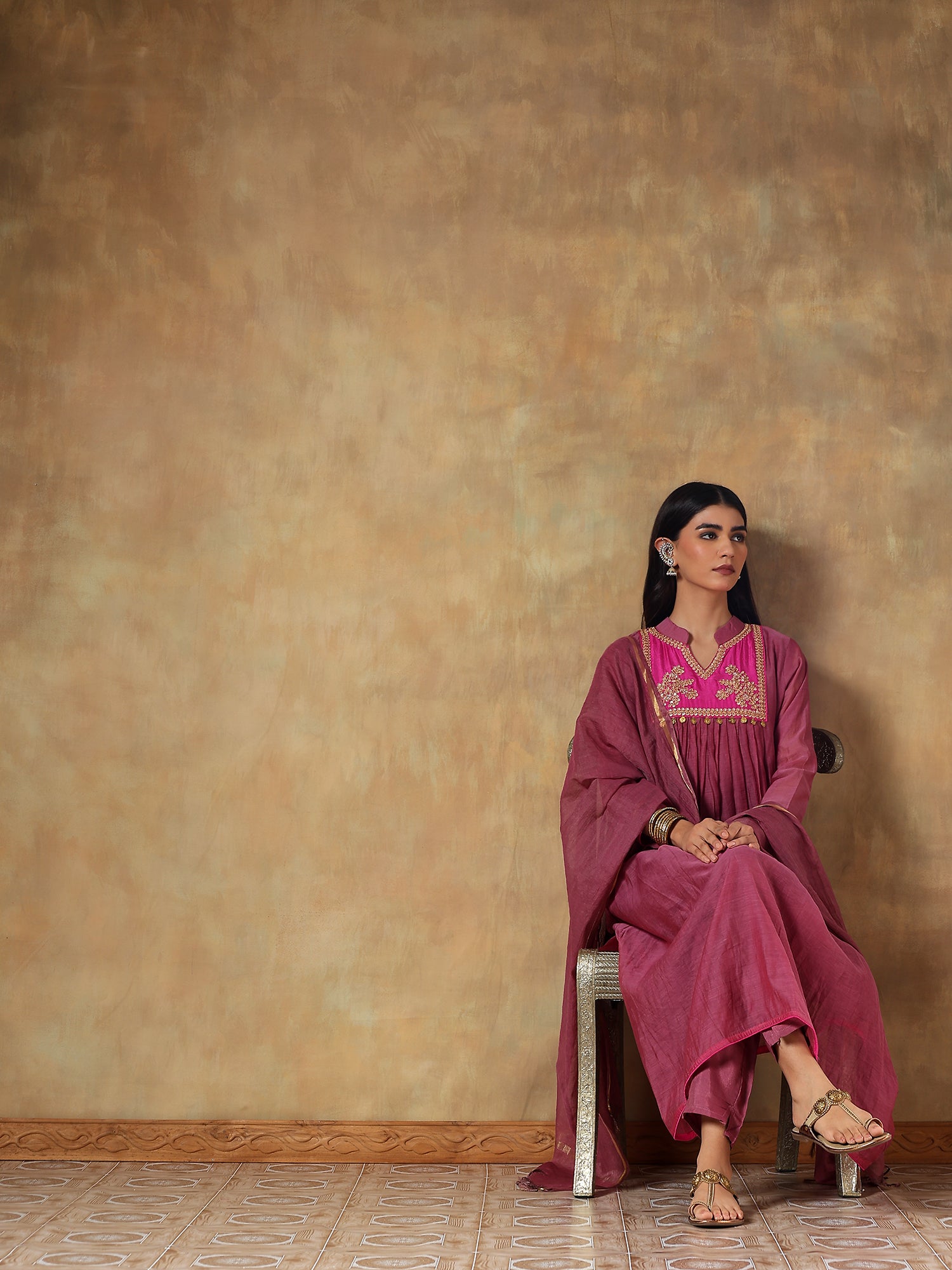 A graceful mauve-pink ensemble crafted in soft mul chanderi, exuding feminine charm with a festive edge. The A-line kurta features intricate hand-embroidered detailing on the yoke, highlighted with mirror work and delicate coin embellishments. It is paired with a matching dupatta finished with a subtle golden border and solid shantoon pants — a perfect blend of refinement and ease.