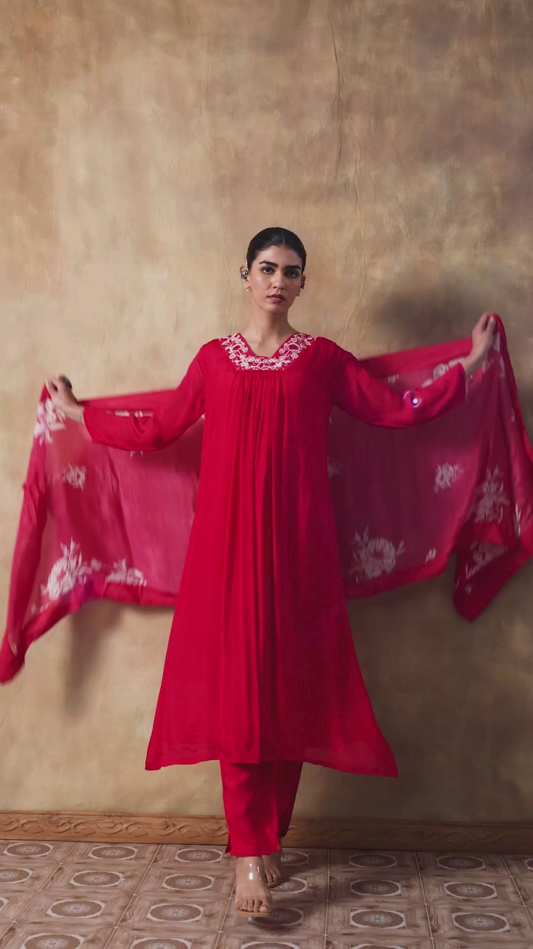 A graceful rouge red ensemble crafted in fluid pure chinon, featuring delicate embroidery along the neckline and paired with a soft chinon silk dupatta. The flowy silhouette exudes effortless femininity, perfect for festive luncheons or evening soirees.