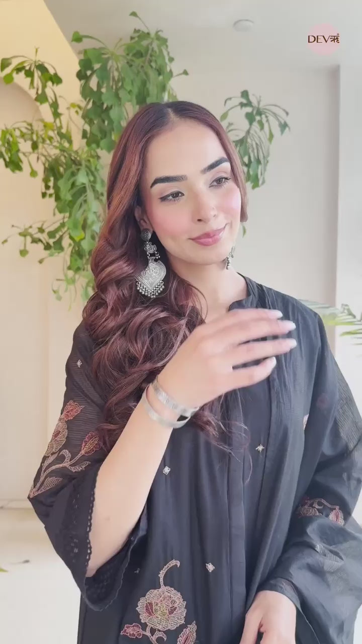 An elegant all-black ensemble crafted in breathable Mul Cotton, elevated with subtle thread embroidery in earthy tones. The kurta features delicate floral motifs along the hem and sleeves, paired with a soft mul dupatta showcasing matching embroidery and plain pants for a clean finish.