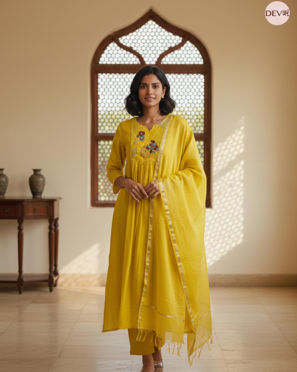 A radiant mul chanderi set in a bright yellow tone, detailed with a hand-embroidered yoke that adds depth and artistry to its airy silhouette. The coordinated dupatta with subtle gold accents completes this vibrant yet graceful Devri creation.