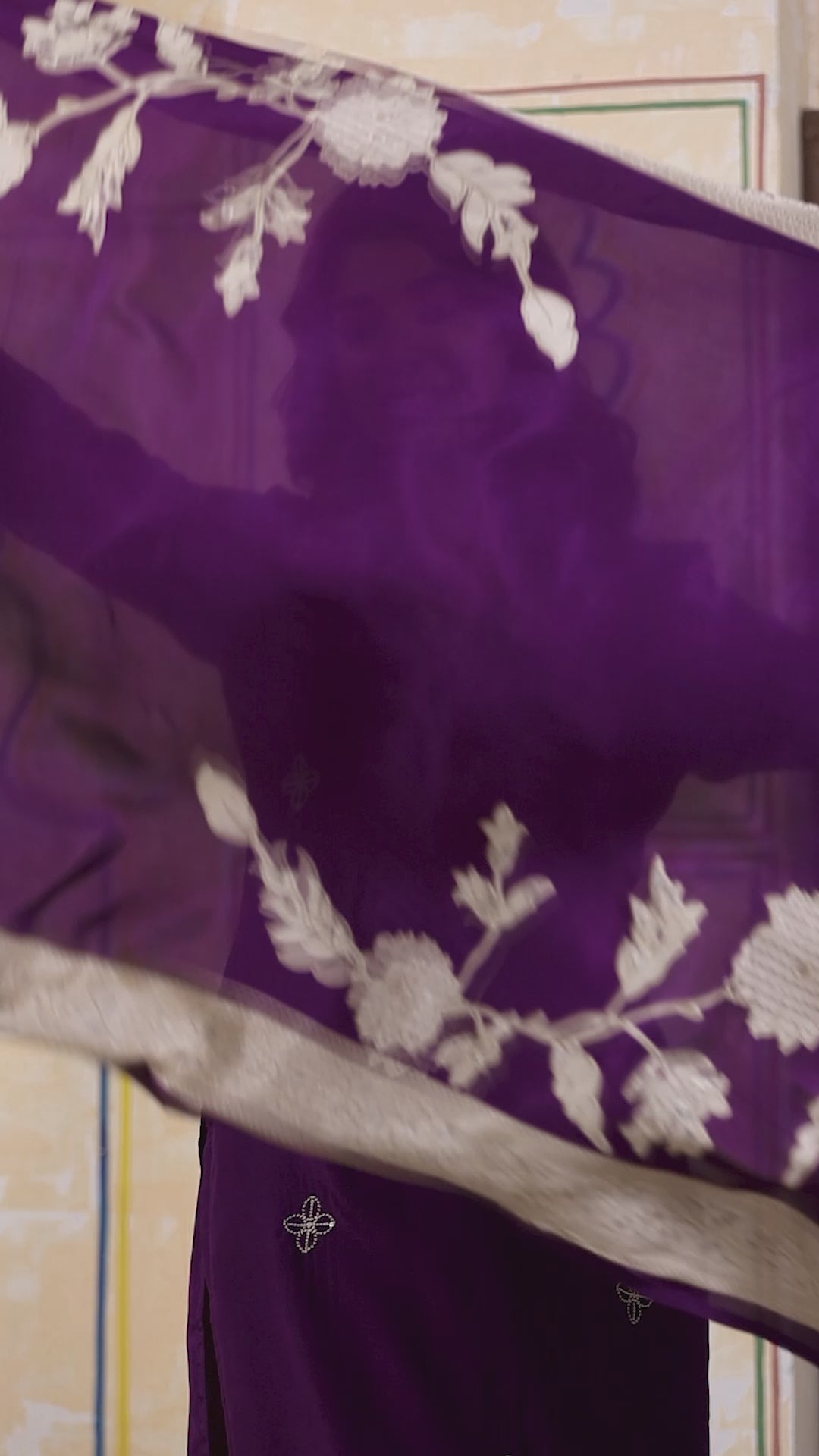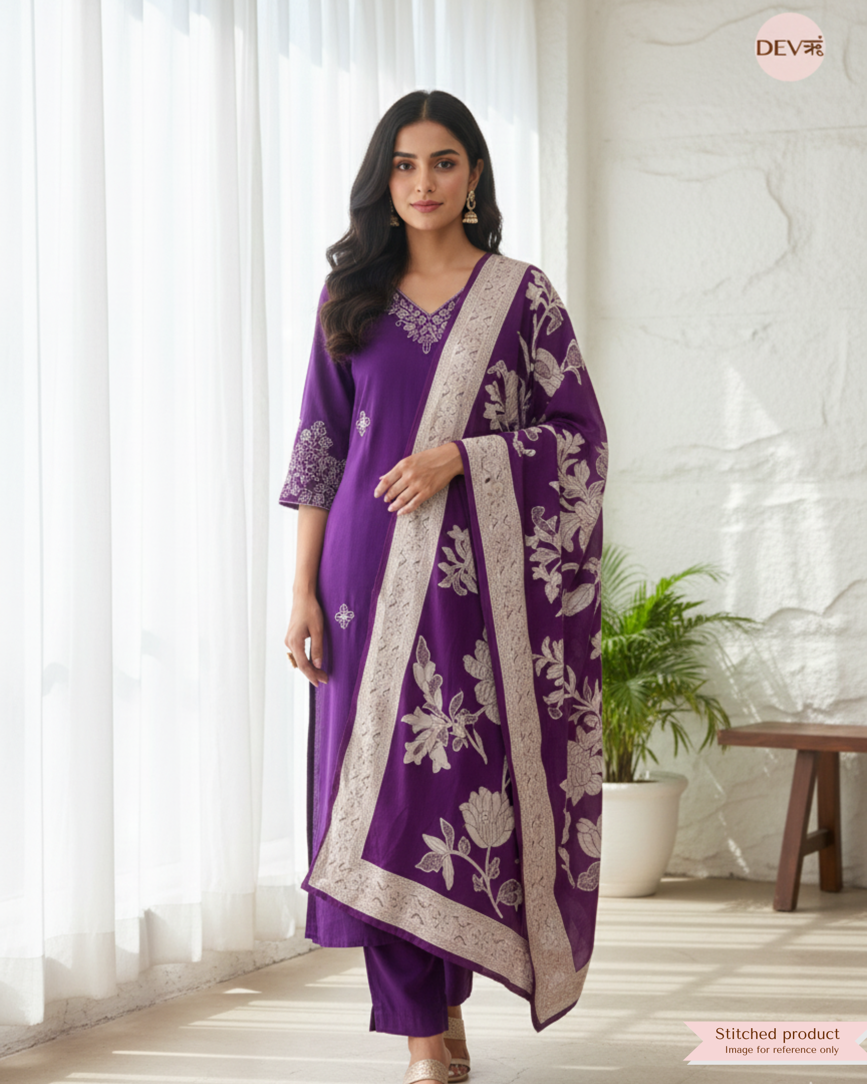 A deep purple muslin set highlighted with intricate thread embroidery and a contrasting floral dupatta. Its soft fabric and elegant drape make it an easy choice for any celebration.