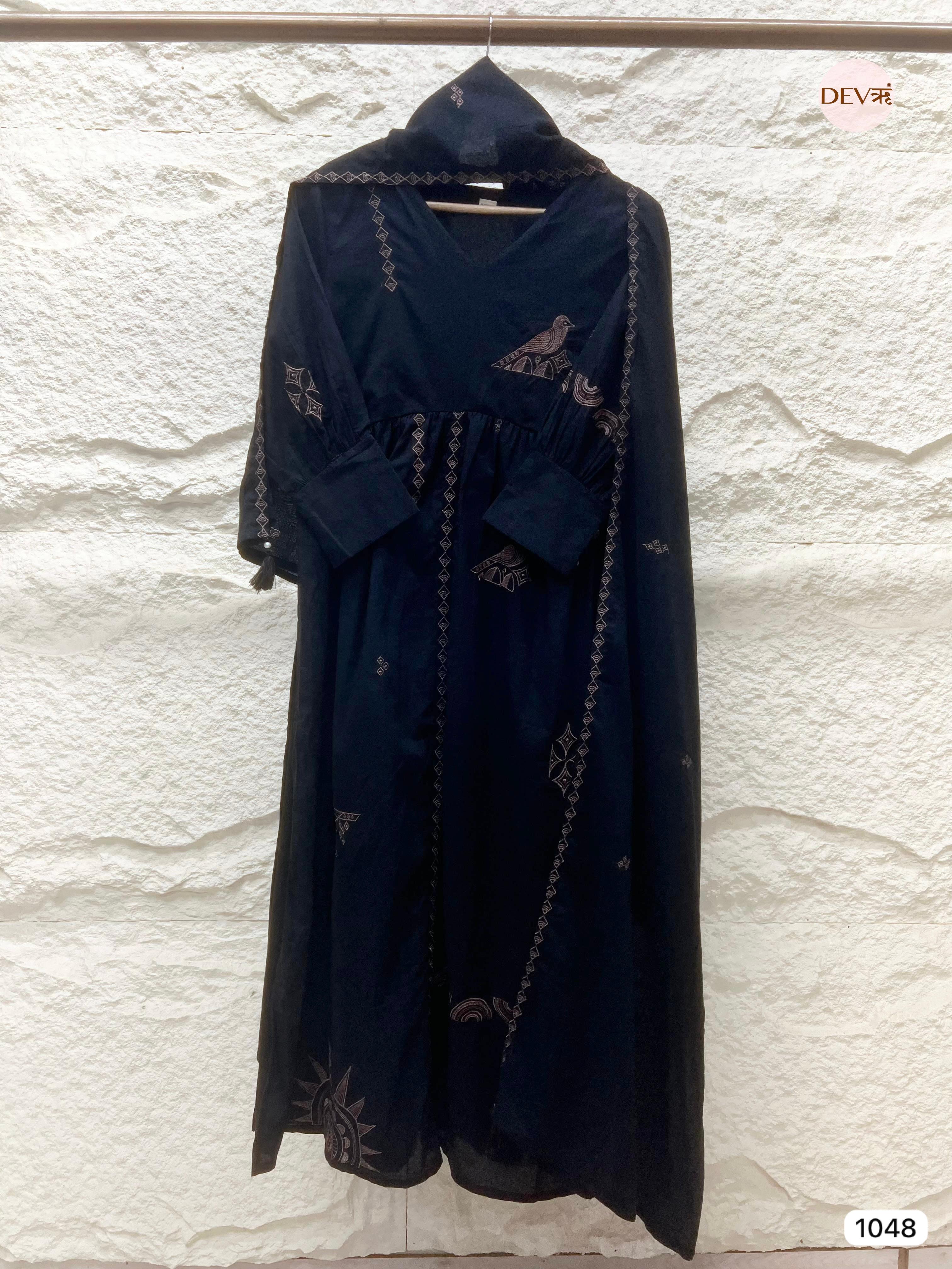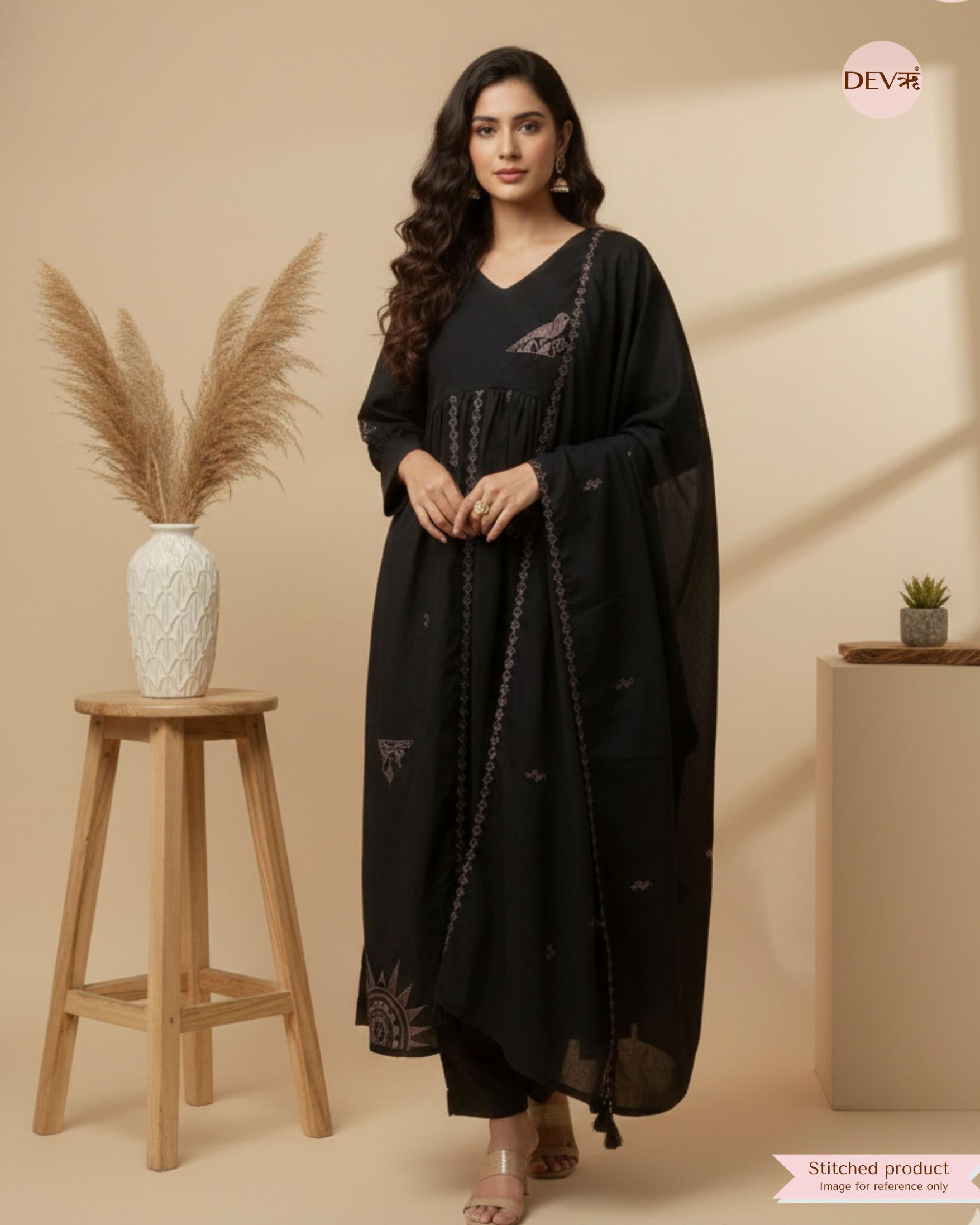 Elegant black kurta set flared silhouette with earthy brown block-inspired motifs and bird detailing. Paired with a lightweight matching dupatta and straight trousers for a graceful ethnic look.