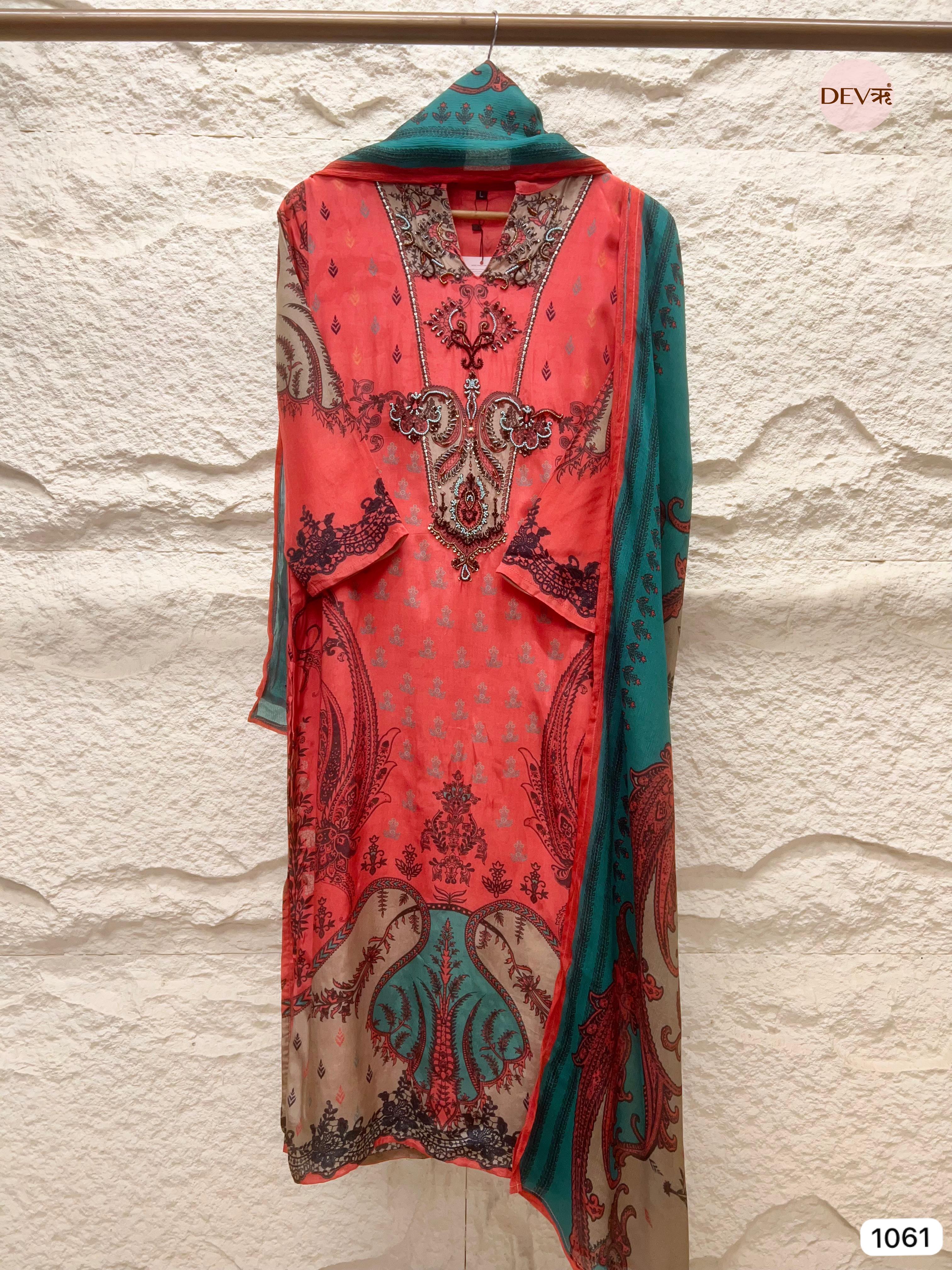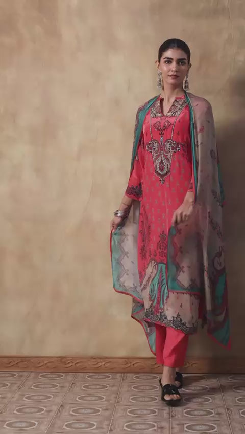 Ruhani celebrates contemporary grace with traditional artistry. Crafted in pure crepe silk, this coral-toned ensemble showcases intricate thread and sequin embroidery along the neckline and borders, highlighted by a soft viscose organza dupatta in contrasting turquoise and beige tones. The flowy silhouette paired with shantoon pants makes it an elegant choice for festive gatherings or evening soirees.