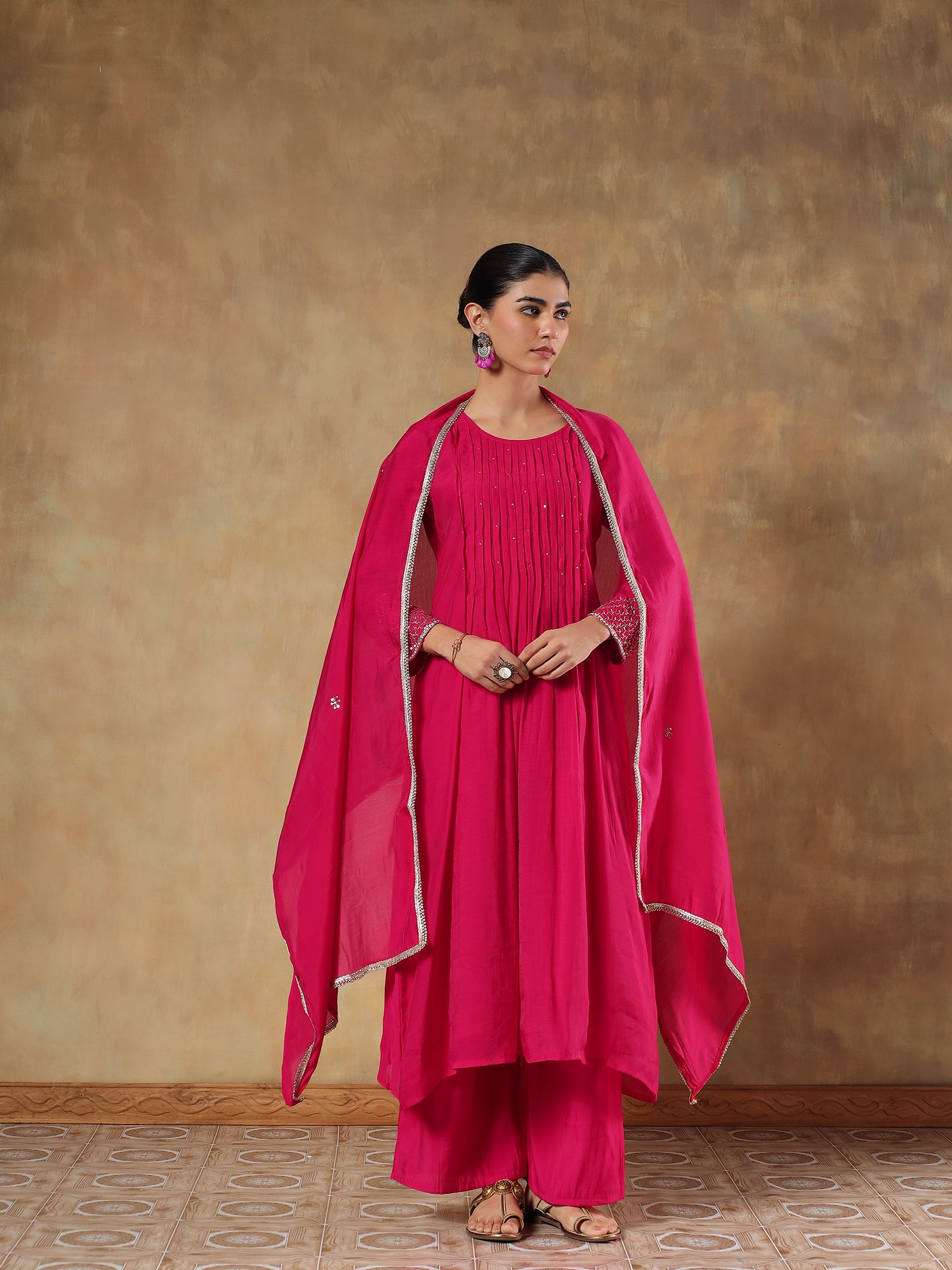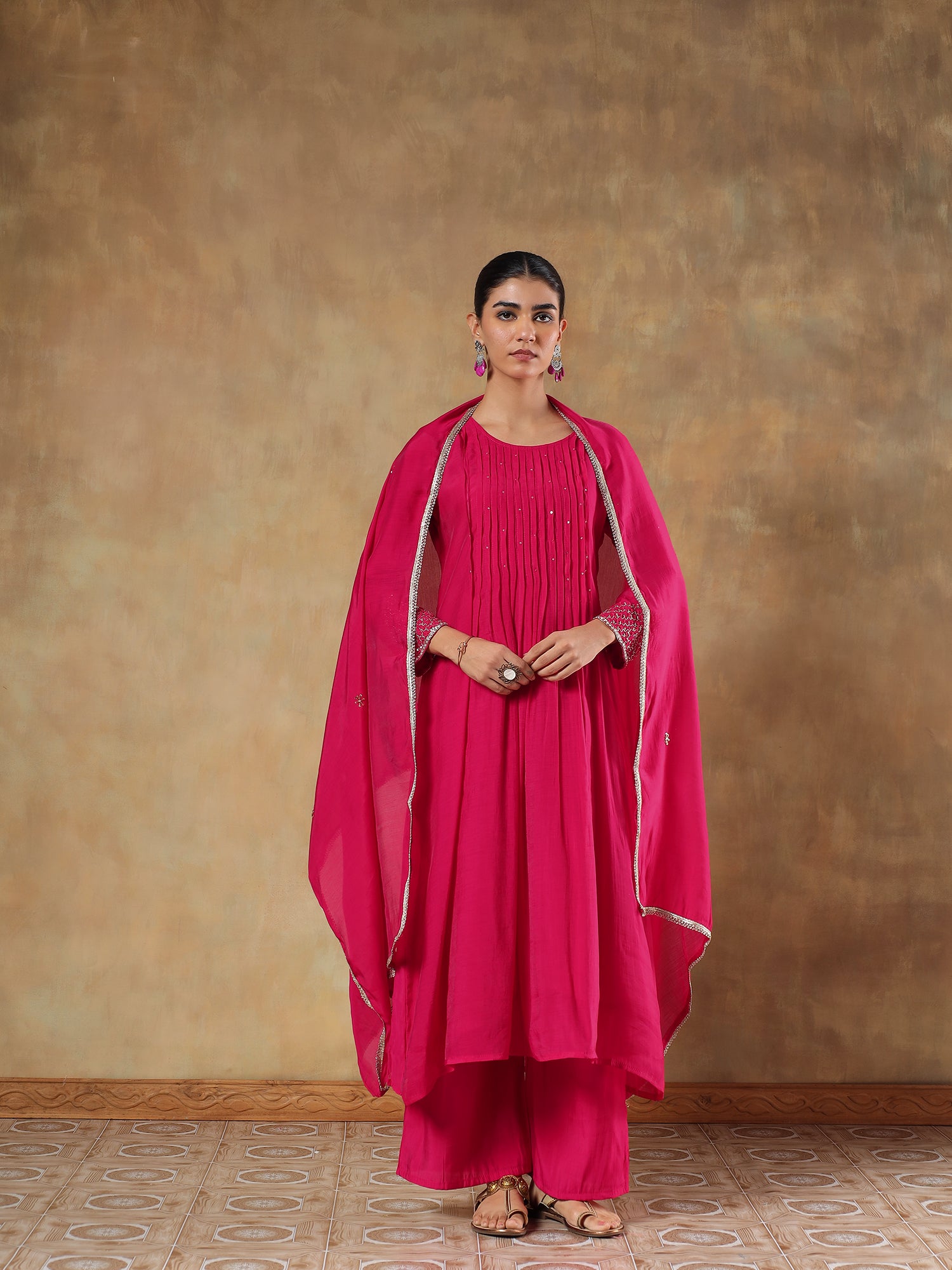 Gulbahar radiates festive vibrance in a rich fuchsia hue, crafted from luxurious mul silk that drapes with effortless grace. The kurta features intricate zari and sequin hand embroidery along the sleeves and pleated front, paired with a soft zari woven silk dupatta framed in a delicate border. Complemented by shantoon pants, this ensemble embodies understated opulence — perfect for festive gatherings or wedding soirées.