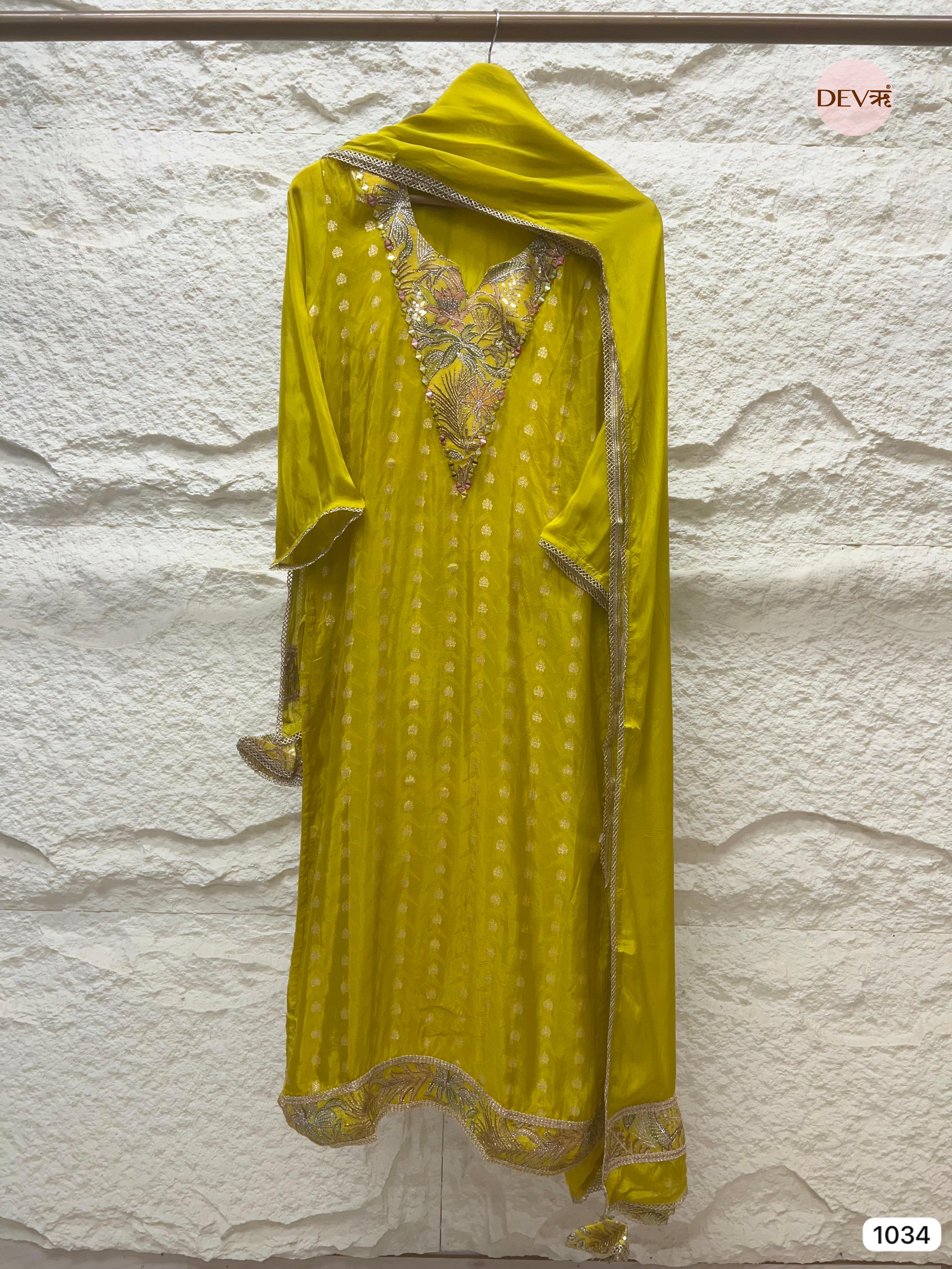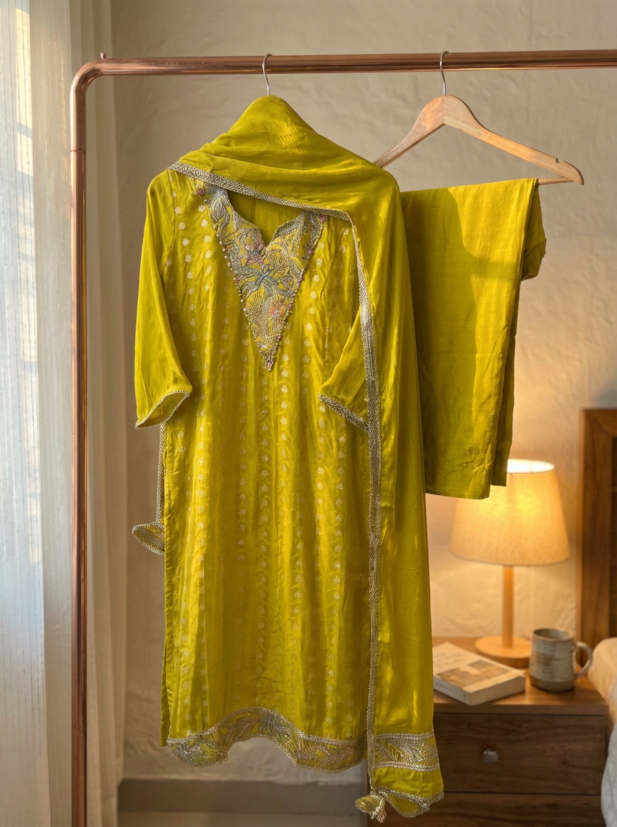 Style Notes: A radiant choice for haldi ceremonies, festive pujas, or daytime weddings. Pair with statement silver-gold jewellery and embellished sandals to complete the look.