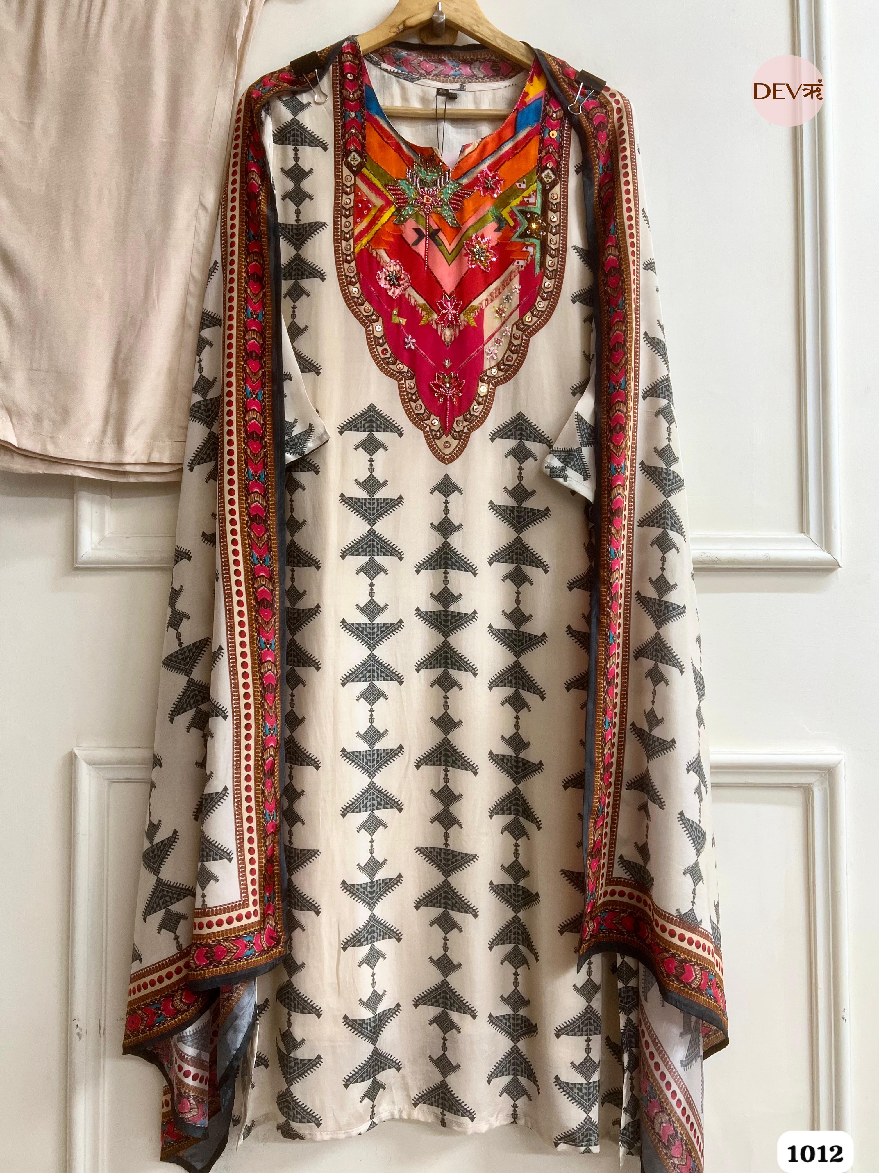 Crafted in soft natural crepe, this 3-piece set stands out with its striking play of prints and colors. The ivory kurta is elevated with bold black tribal-inspired motifs across the body, while the yoke bursts with vibrant red and multicolored embroidery-style prints, framed with detailed borders. Straight-fit crepe pants offer balance, and the coordinated printed dupatta ties the look together with a refined mix of ivory, red, and black patterns.