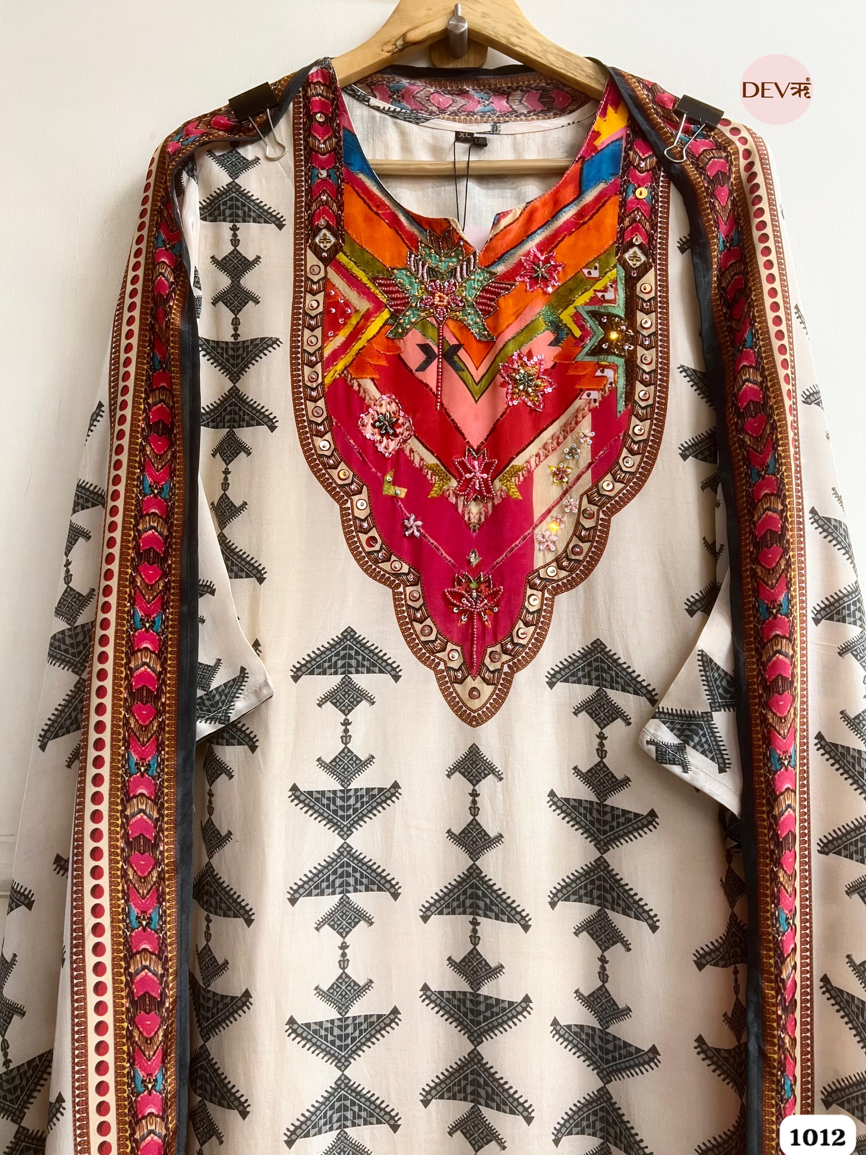 • Kurta: Natural crepe with tribal-inspired motifs & contrast printed yoke | Approx. 46"