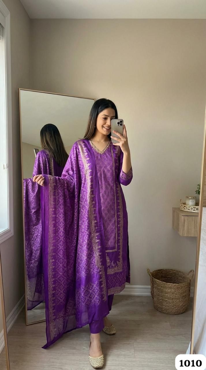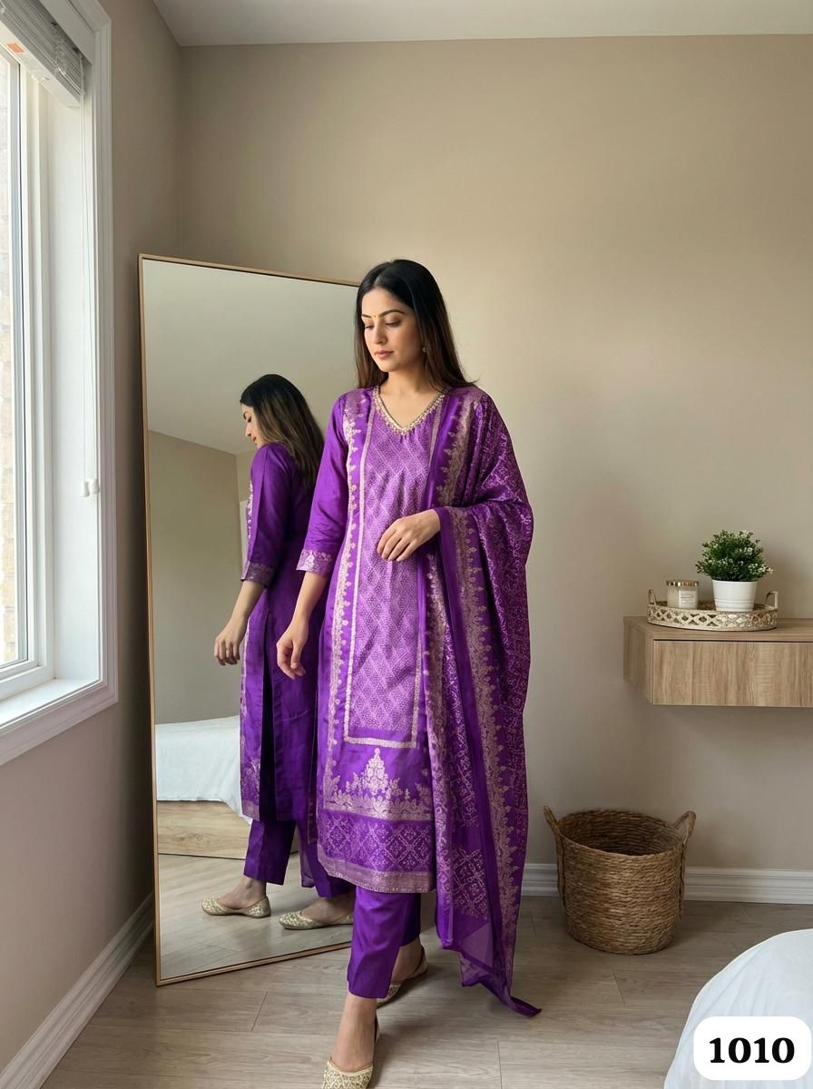 Crafted in premium Russian silk, this 3-piece set radiates richness and grace. The kurta in a majestic purple tone is highlighted with intricate woven motifs and framed borders in antique gold, lending it a festive grandeur. Straight-fit silk pants balance the drape, while the coordinated dupatta mirrors the kurta’s motifs and border accents, completing the look with timeless charm.