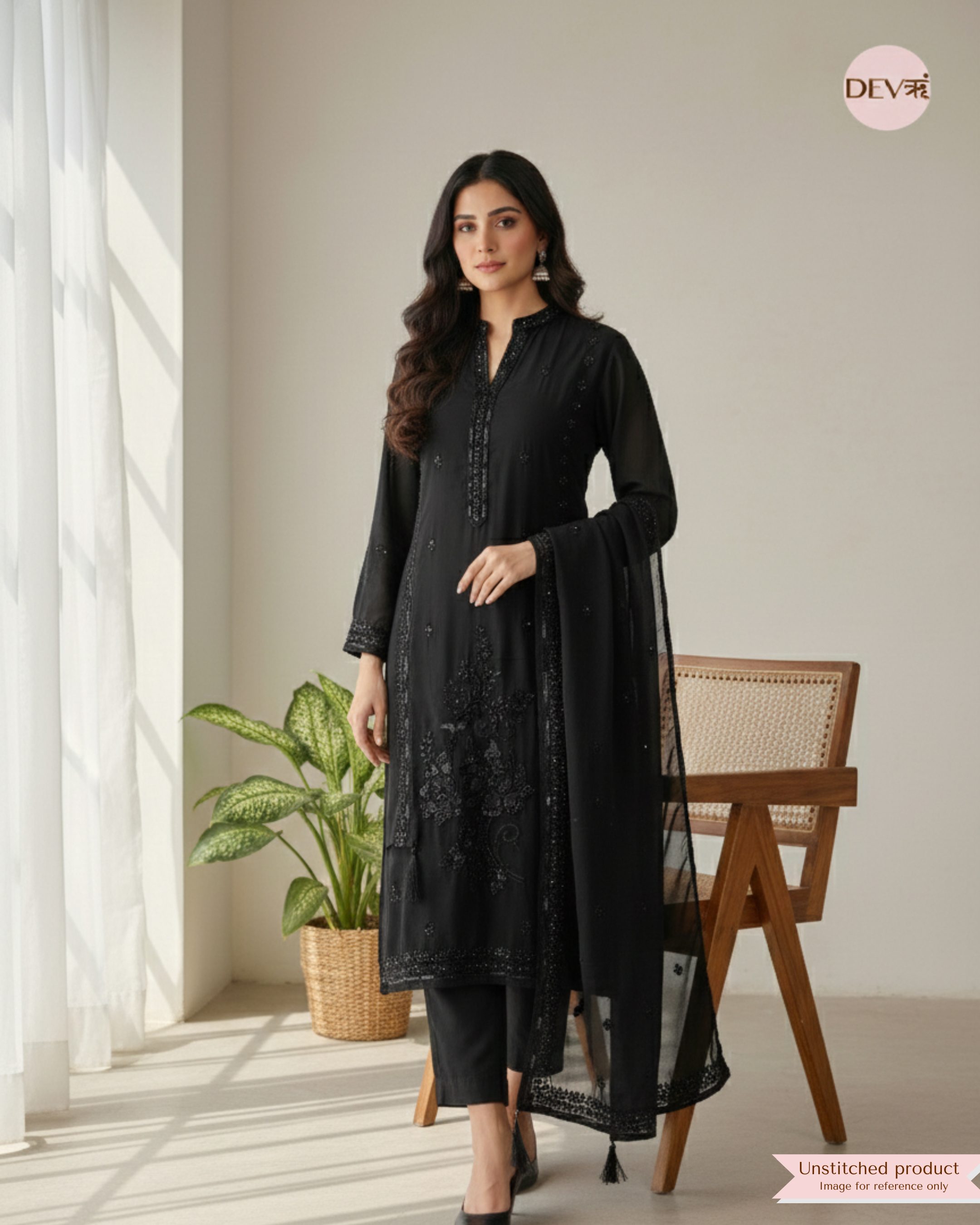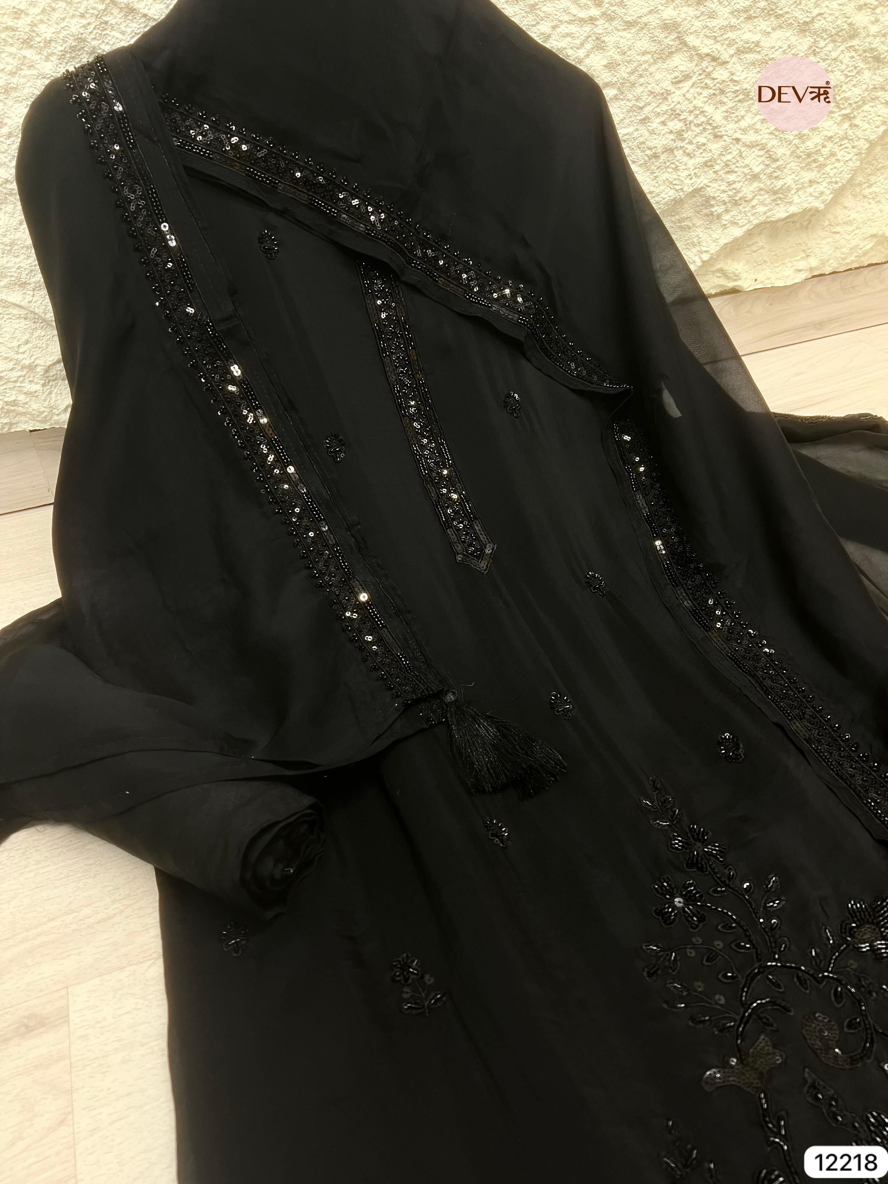 A refined all-black suit crafted in sheer organza, highlighted with intricate hand embroidery and glistening beadwork that adds depth and elegance. The fluid drape and tonal embellishments create a luxurious, evening-ready look with Devri’s signature understated sophistication.