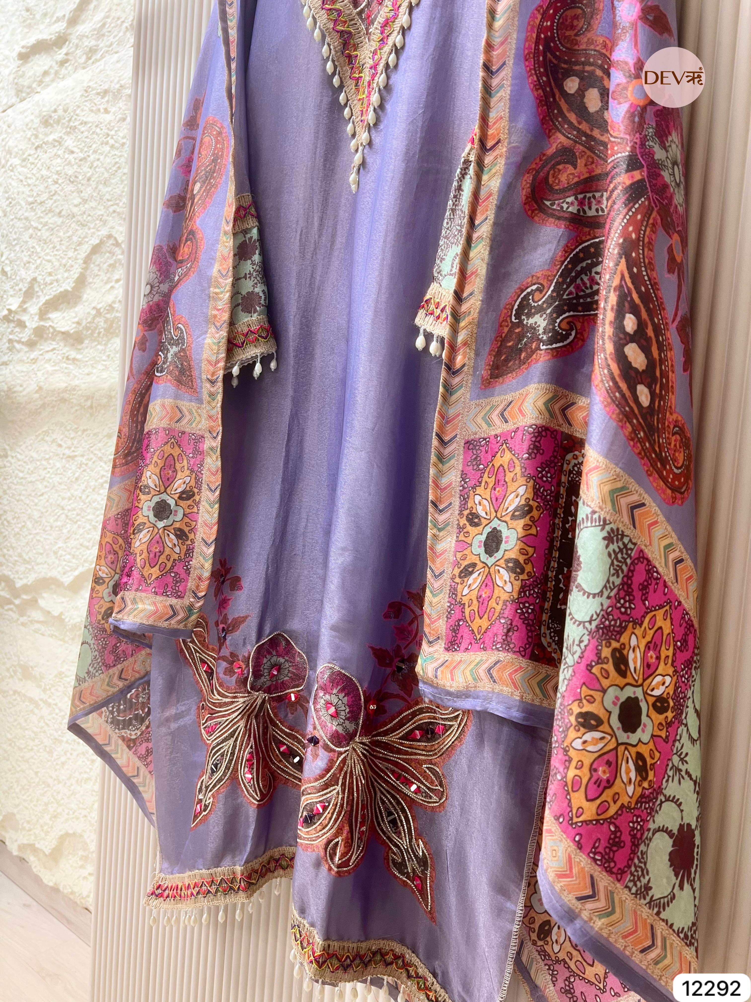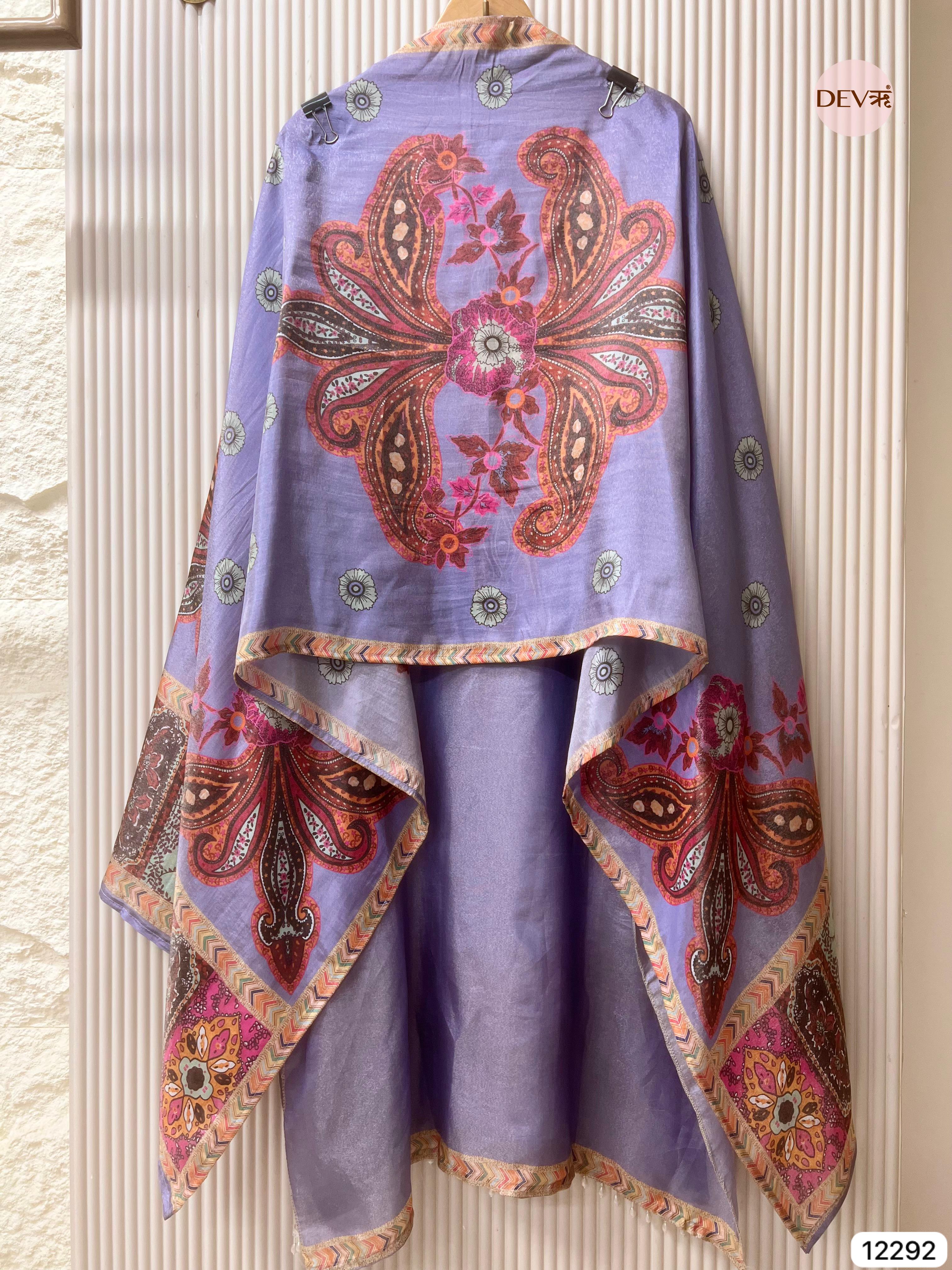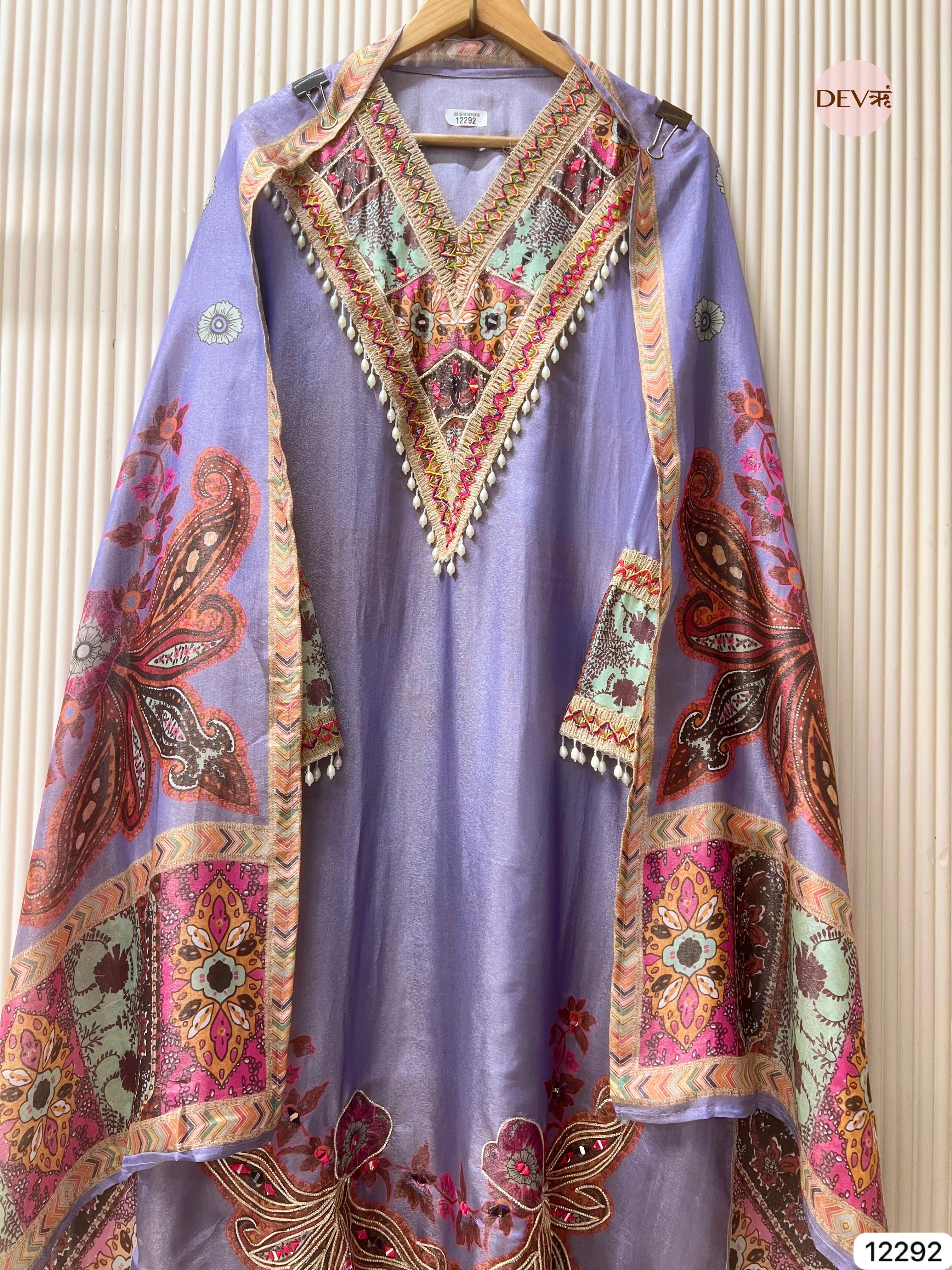A soothing lavender base sets the tone for this shimmer silk unstitched suit, enhanced with intricate printed motifs and detailed accents that create a rich visual texture with a soft, luminous finish.