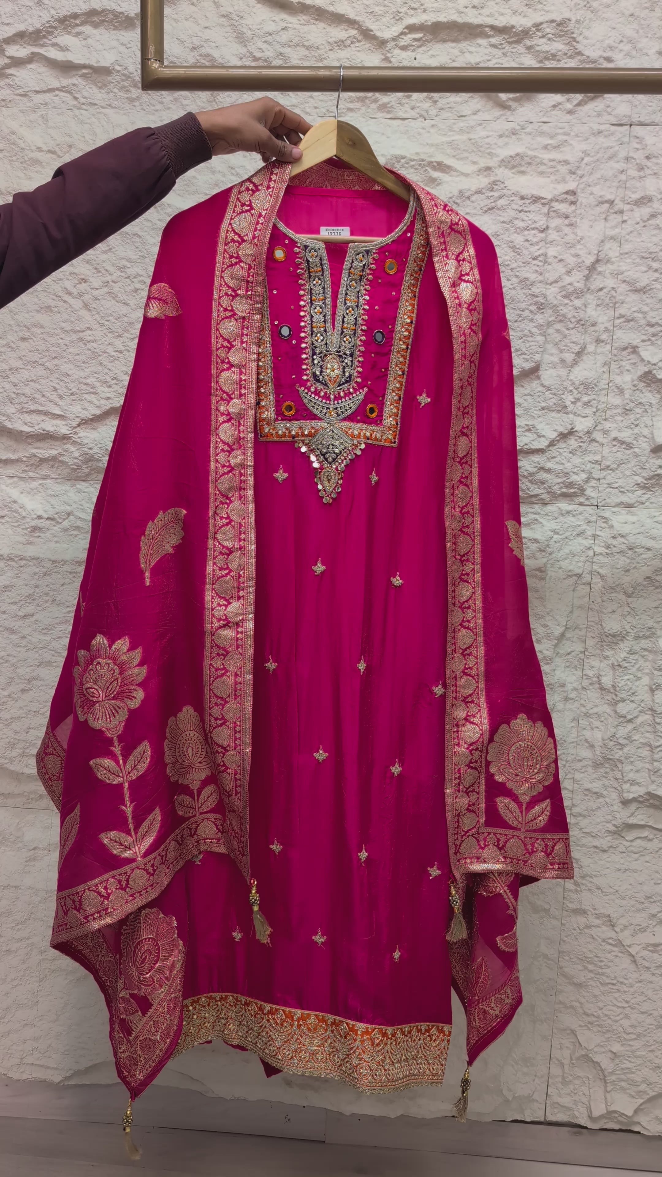 Detailing: Intricate floral thread embroidery with sequin work and a decorative scalloped hem