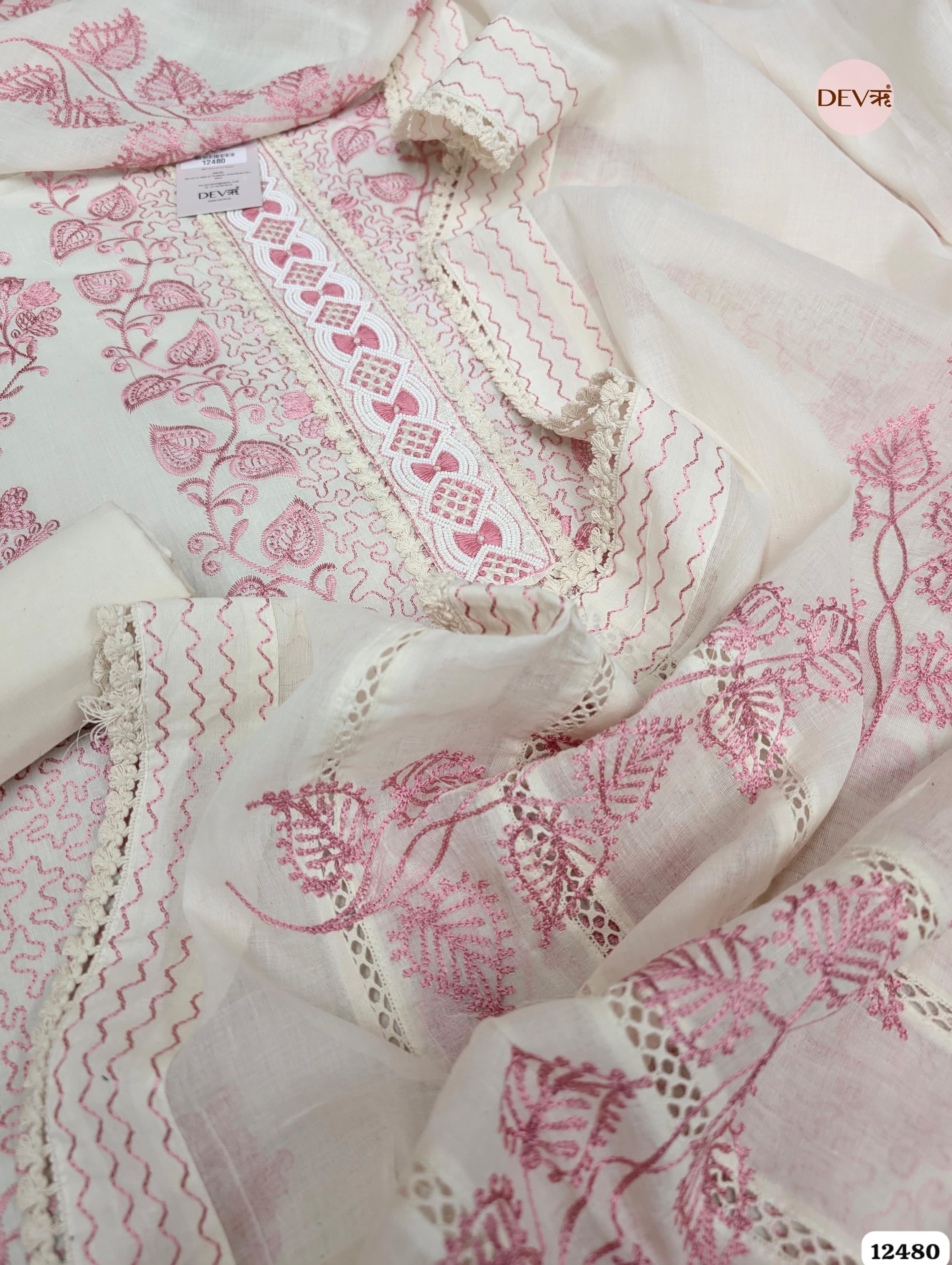 This sophisticated white ensemble is elevated by intricate soft pink floral embroidery that flows gracefully across the shirt. The design features a beautifully detailed central panel and delicate lace inserts, combined with the breathable comfort of premium pure cotton. Its refined, neutral-toned palette and airy texture embody the classic Devri aesthetic.