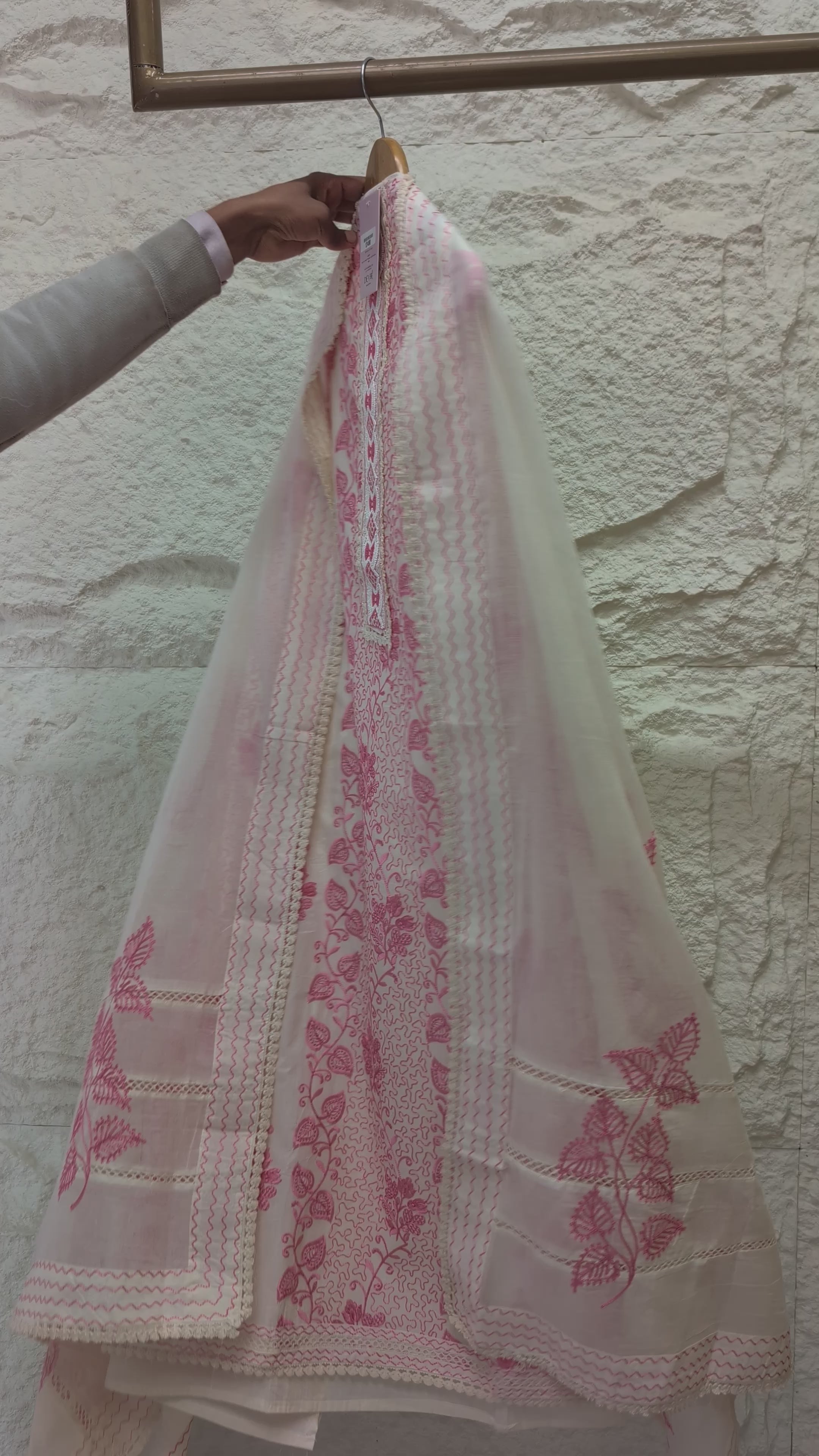 Shirt Fabric Details: Fabric: Pure Cotton Detailing: Allover floral embroidery with a decorative central yoke, ladder lace inserts, and an embroidered border at the hem