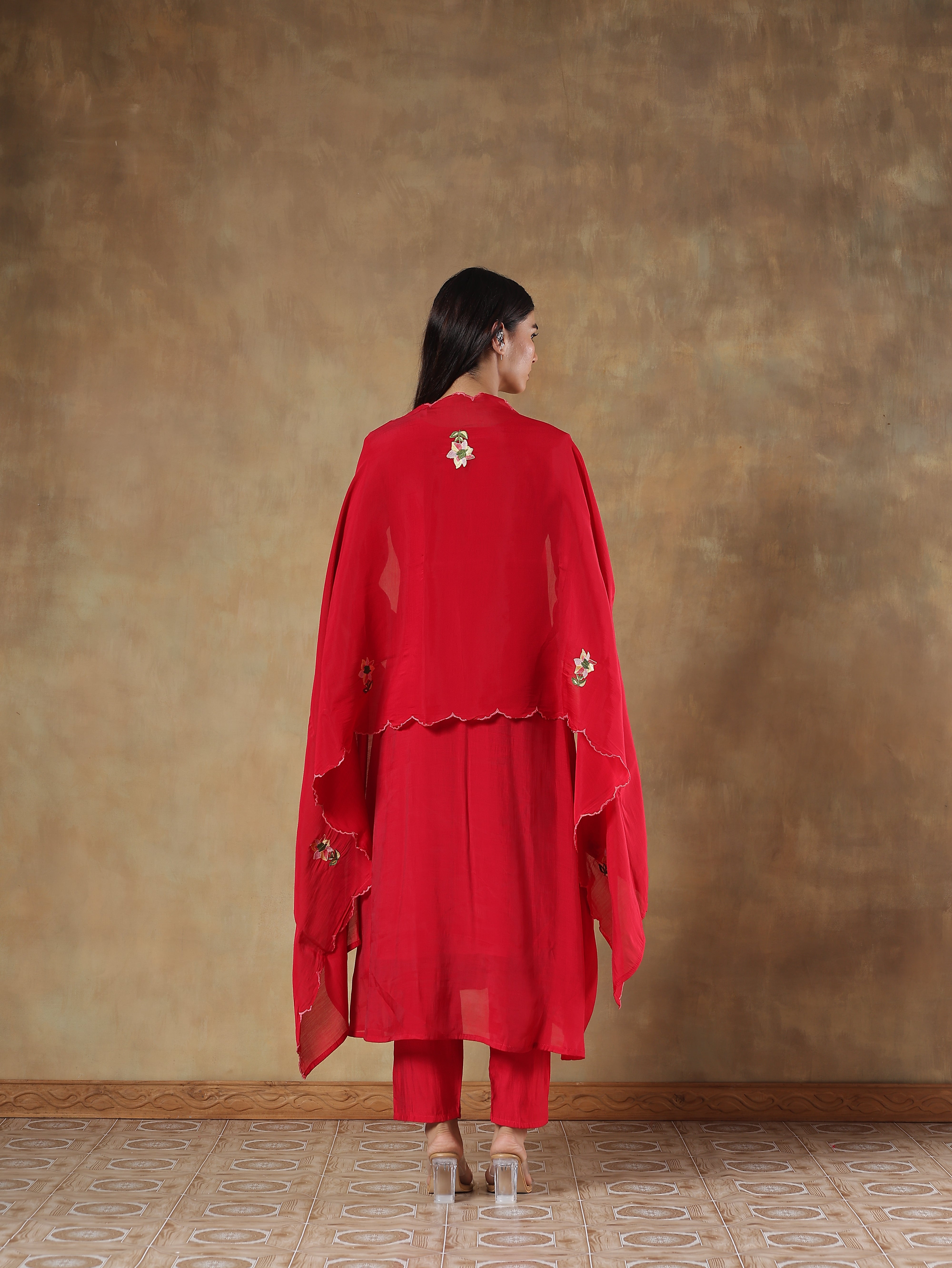 A vibrant red silk set defined by its lively floral embroidery. The A-line kurta features neat pleating along the front and multicoloured threadwork florals embroidered across the hem and sleeves. Paired with a soft silk dupatta and solid shantoon pants, this ensemble captures a balance of festive colour and everyday sophistication.