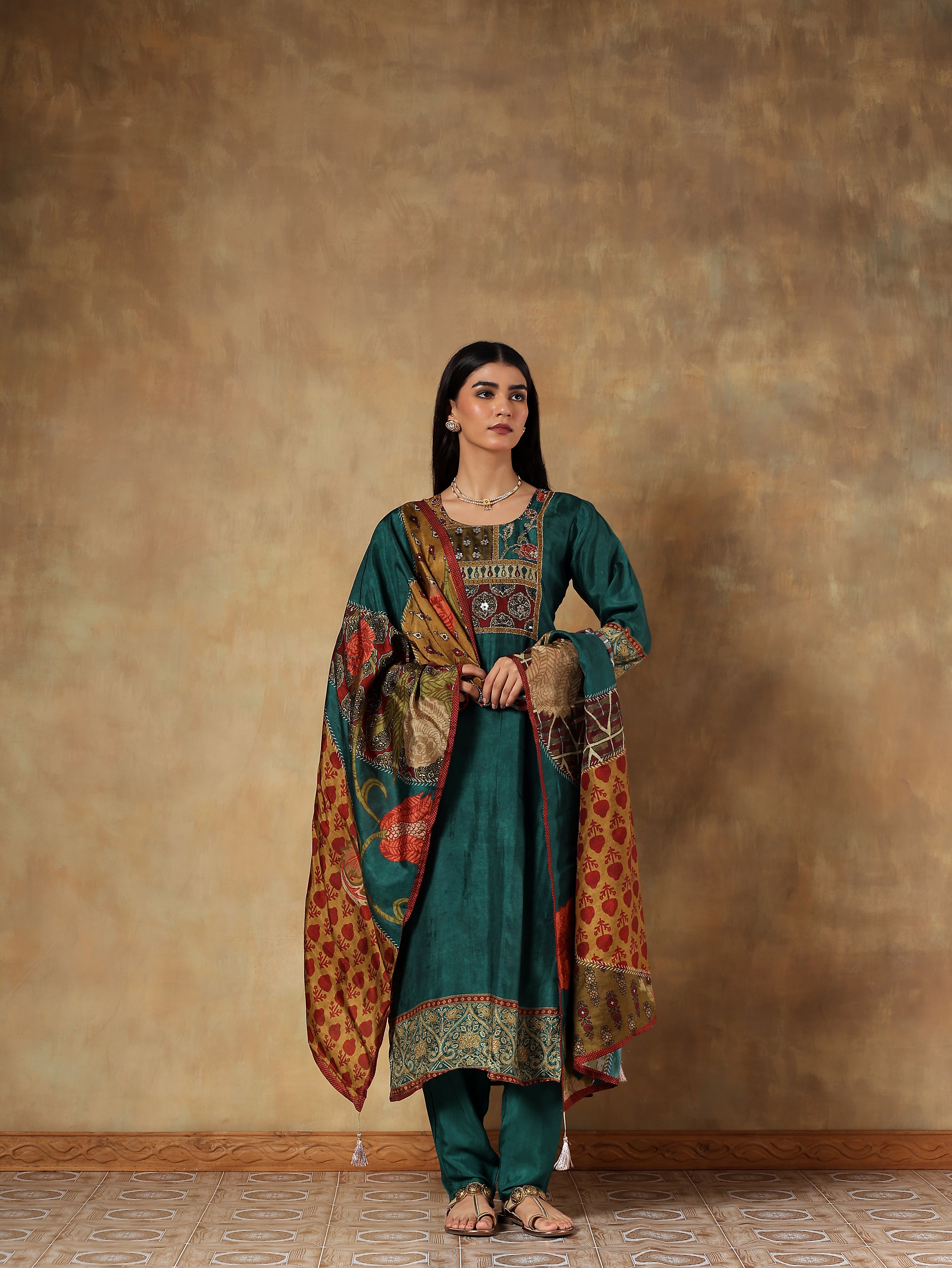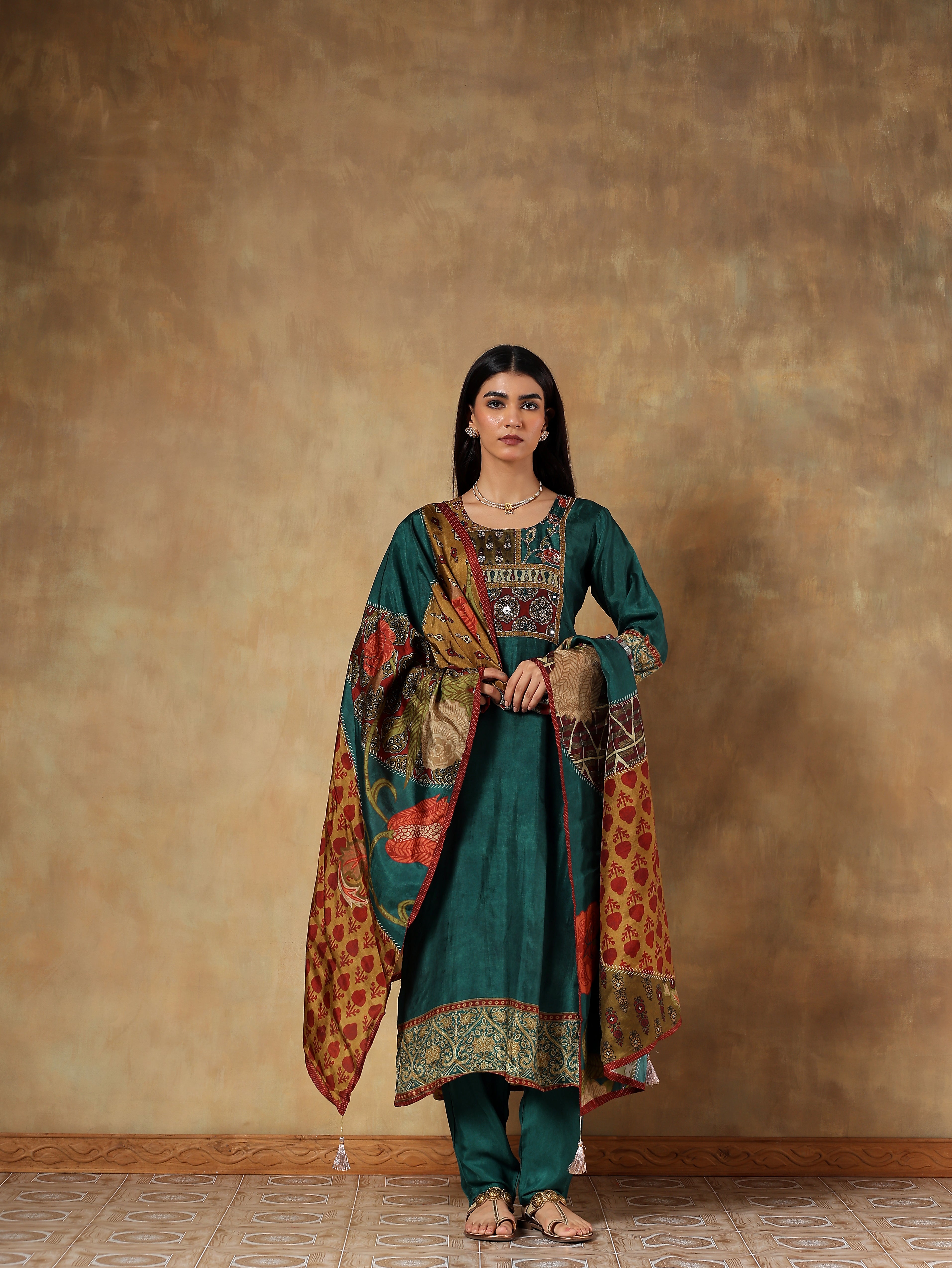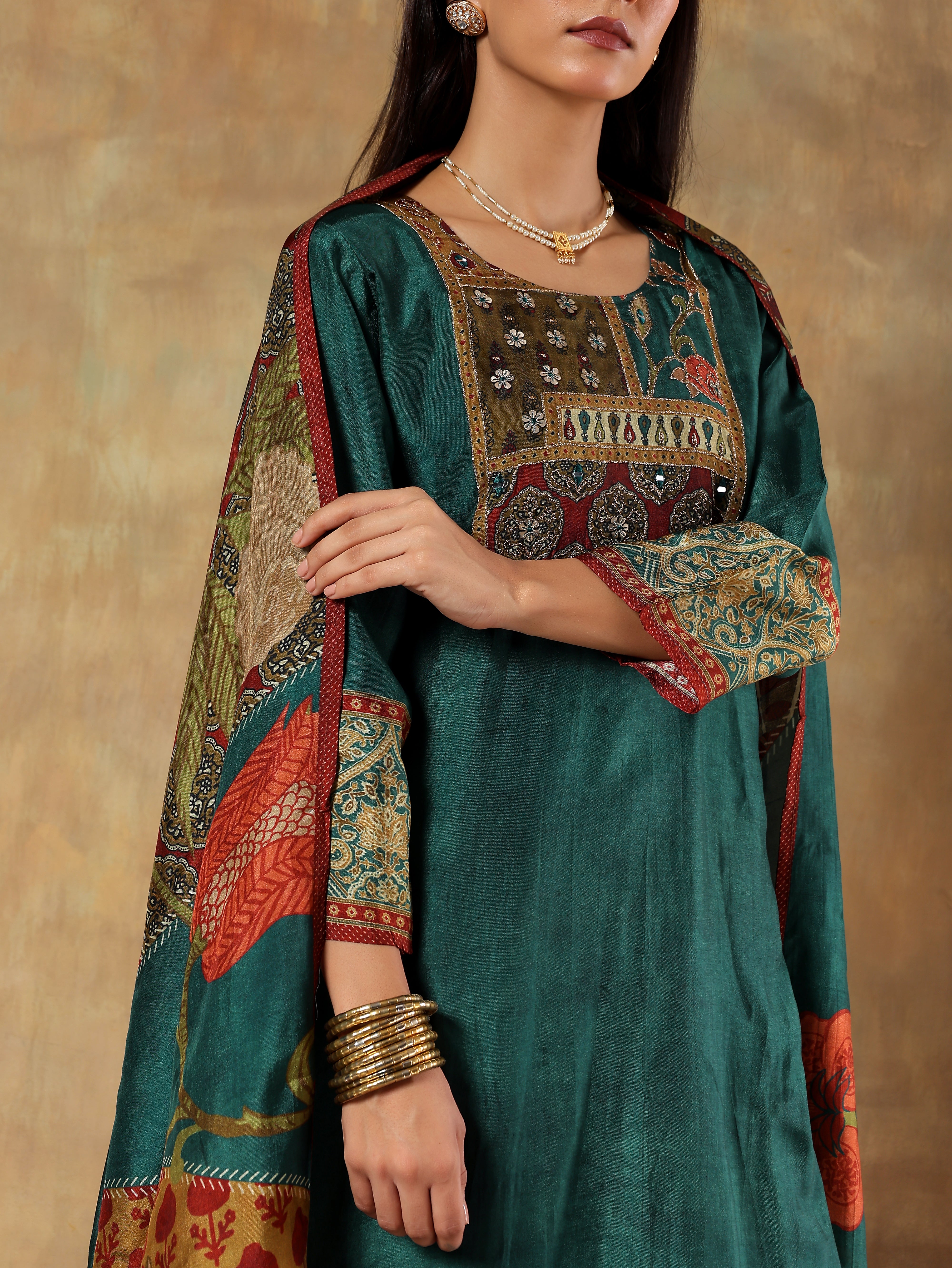 An elegant deep emerald green printed set crafted in soft Russian silk. The straight-cut kurta features intricate ethnic-inspired prints highlighted with subtle gold accents along the neckline and hem. Paired with a complementing multicoloured printed dupatta in Russian silk and solid shantoon pants, this ensemble brings together richness and comfort in perfect balance.