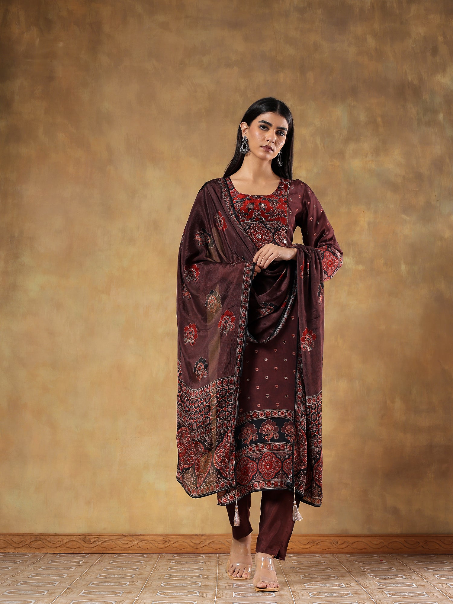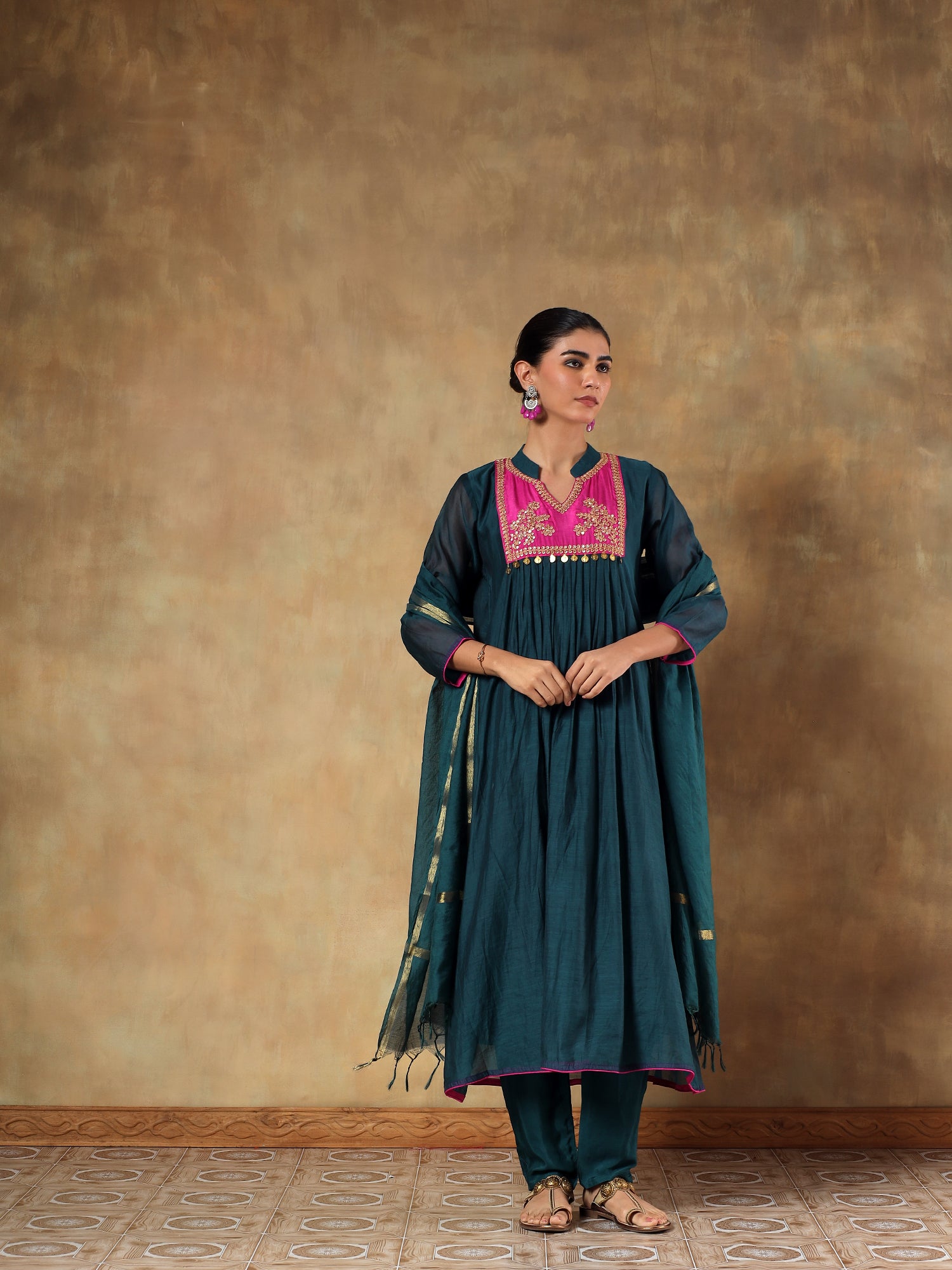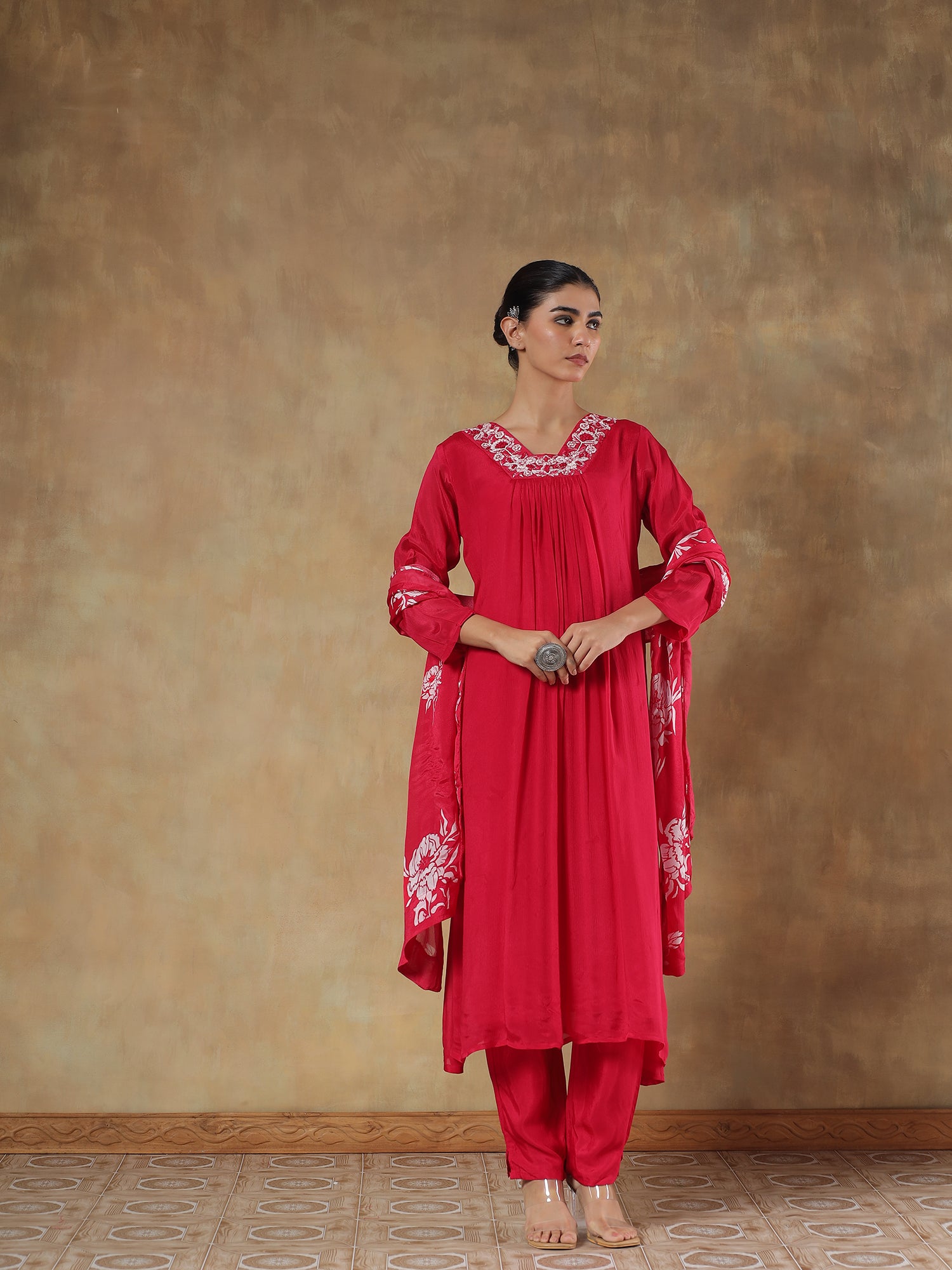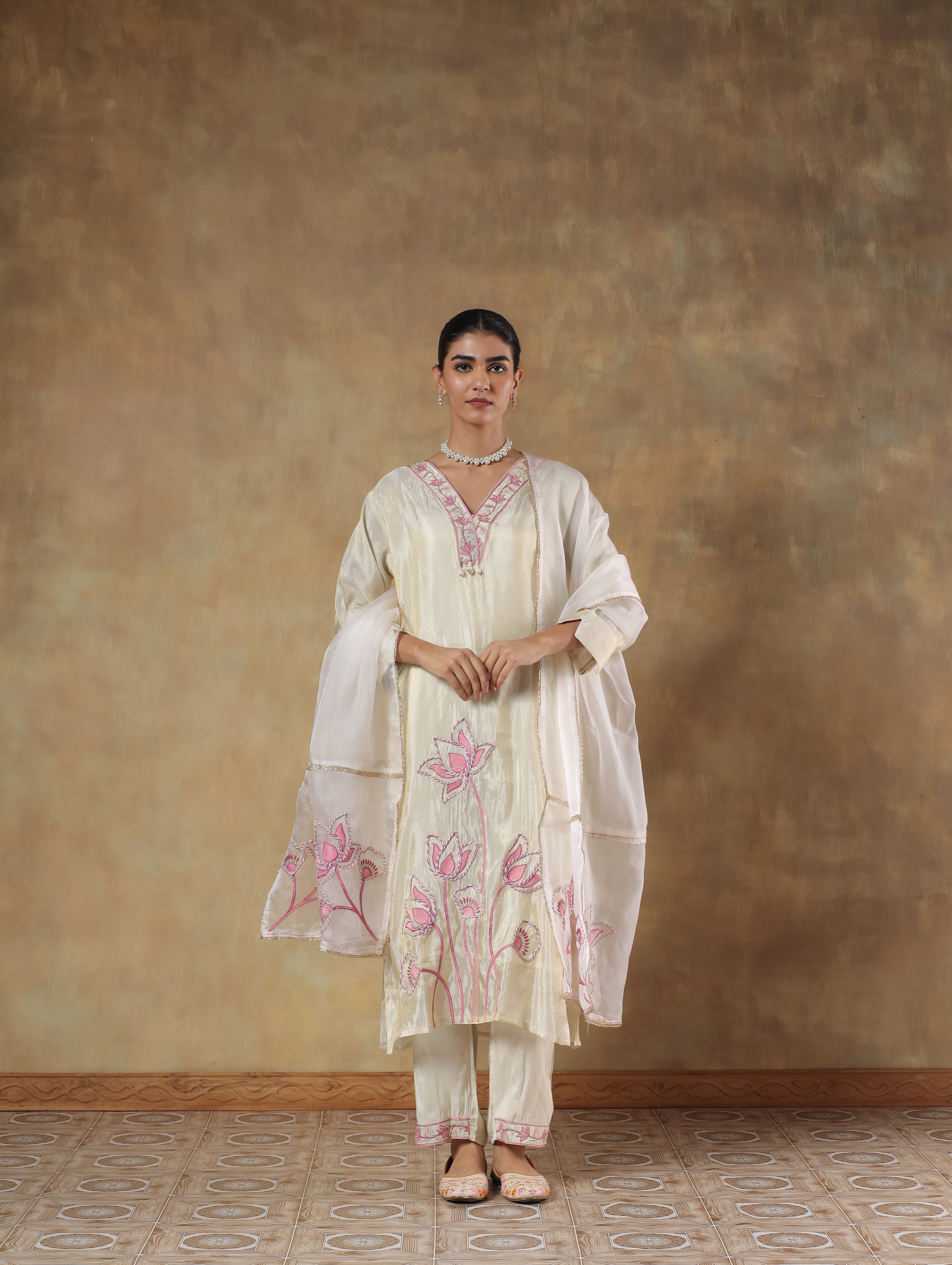 A radiant mustard ensemble delicately embroidered with floral and butterfly motifs in multicolour threads. Crafted from luxurious pure chinon, this flowy co-ord set drapes with effortless grace and adds a festive gleam to every movement.