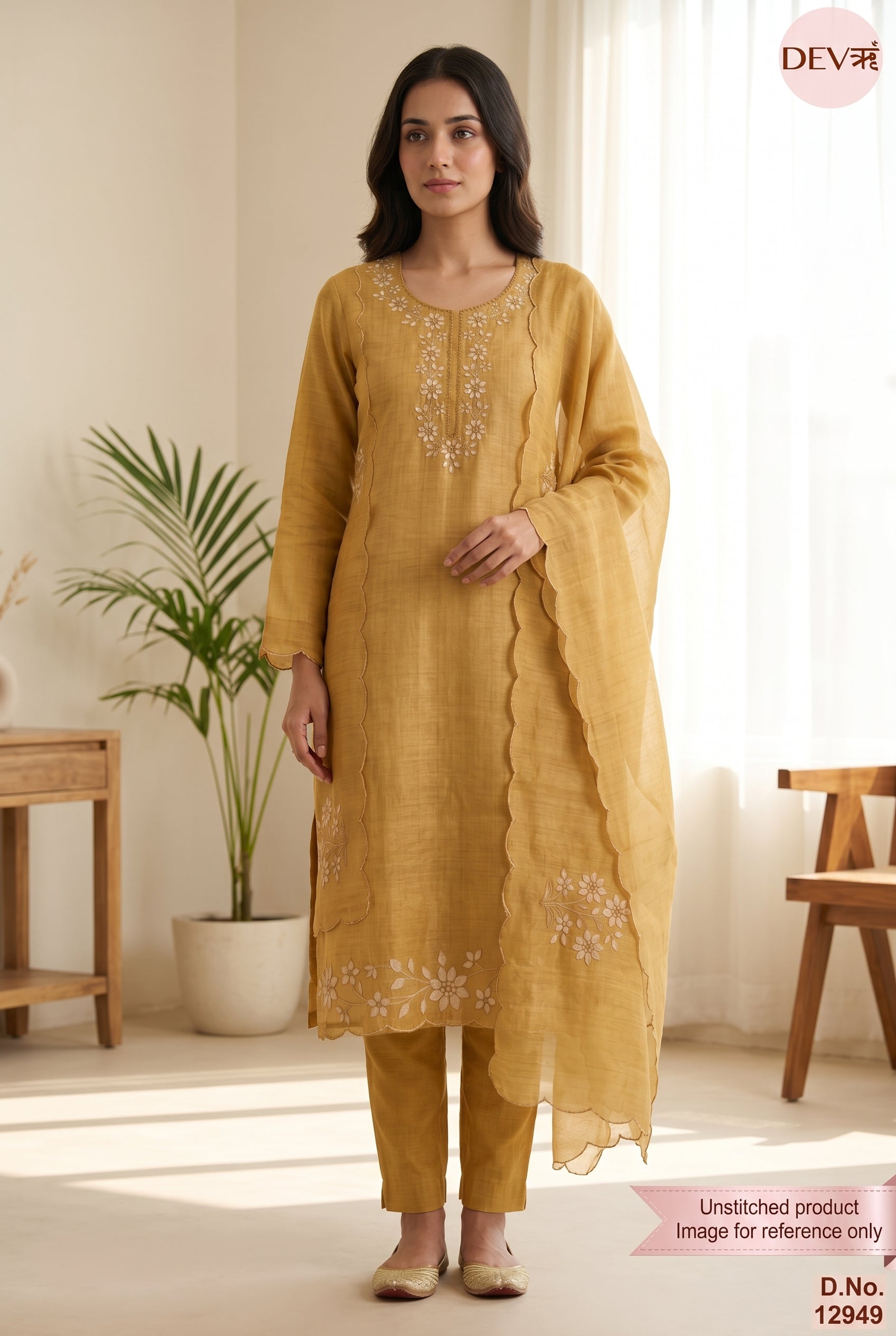 Rendered in a rich mustard tone, this unstitched 3-piece suit brings together a refined linen shirt with delicate floral embroidery placed along the round neckline, front panel, sleeves, and hem. The look is elevated by a coordinated linen dupatta with soft scalloped edges and floral embroidered accents, lending the set an understated sophistication. Paired with a Shantoon bottom, the ensemble offers a graceful finish, while the 48-inch shirt length adds to its elegant presence.