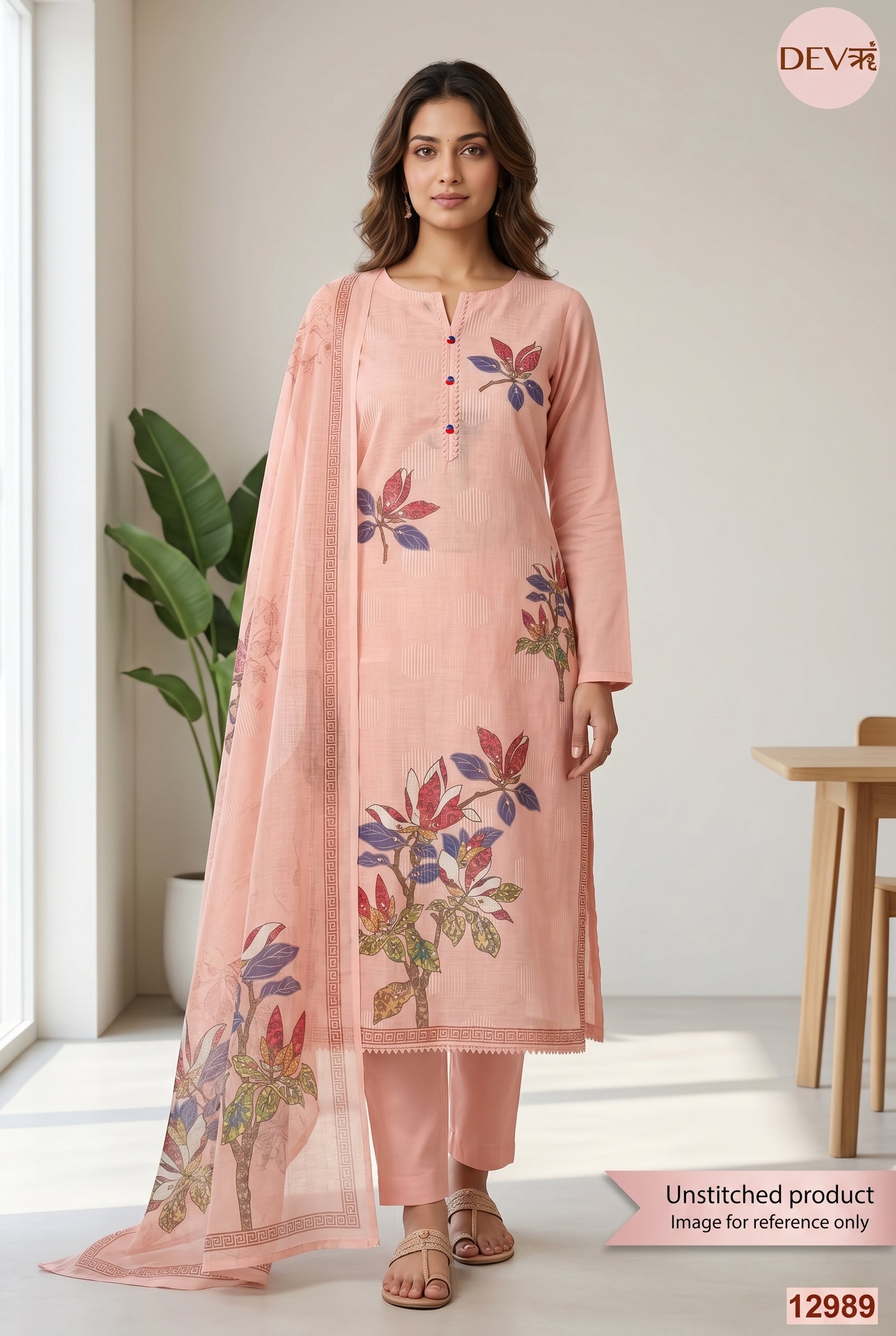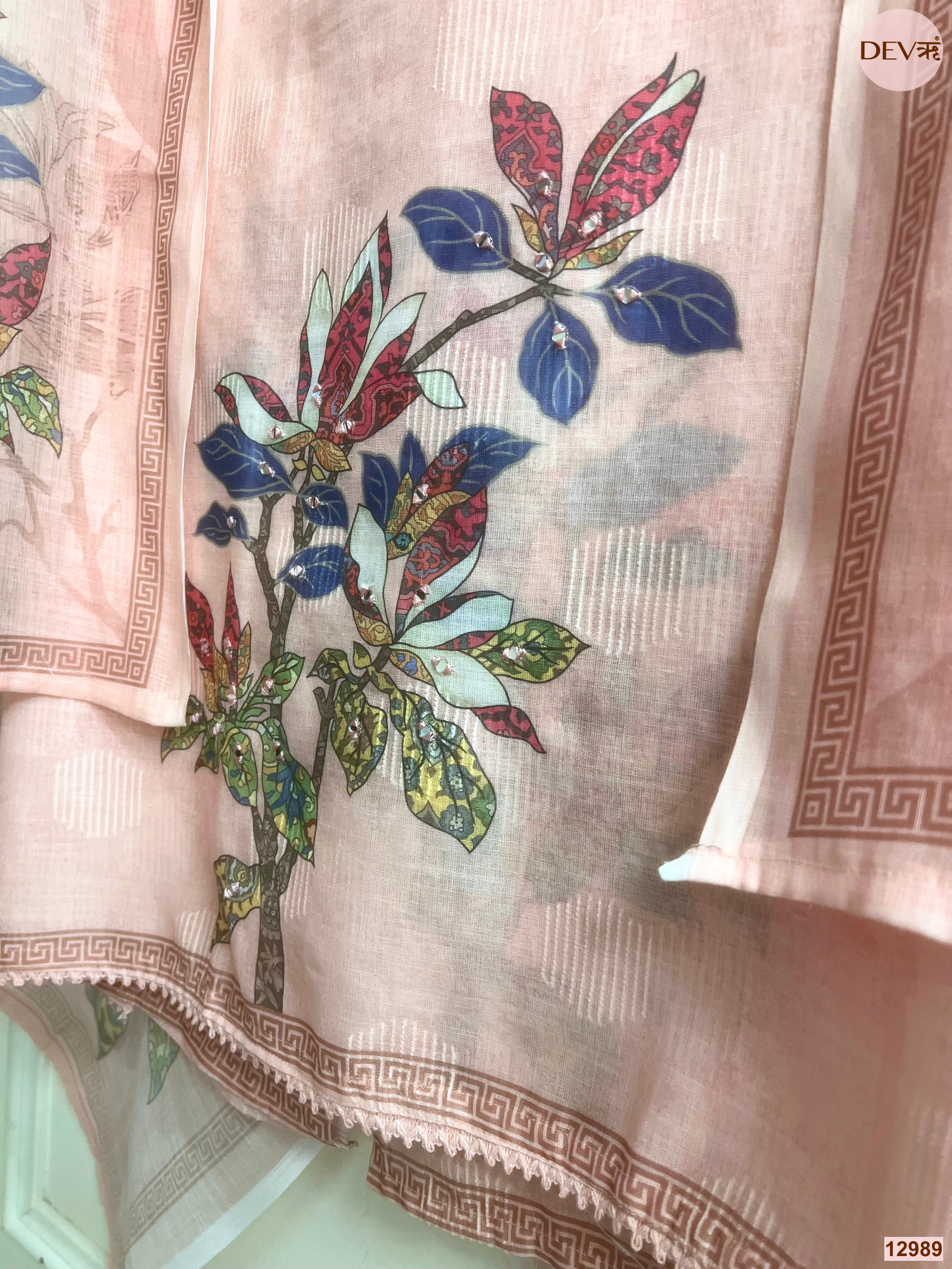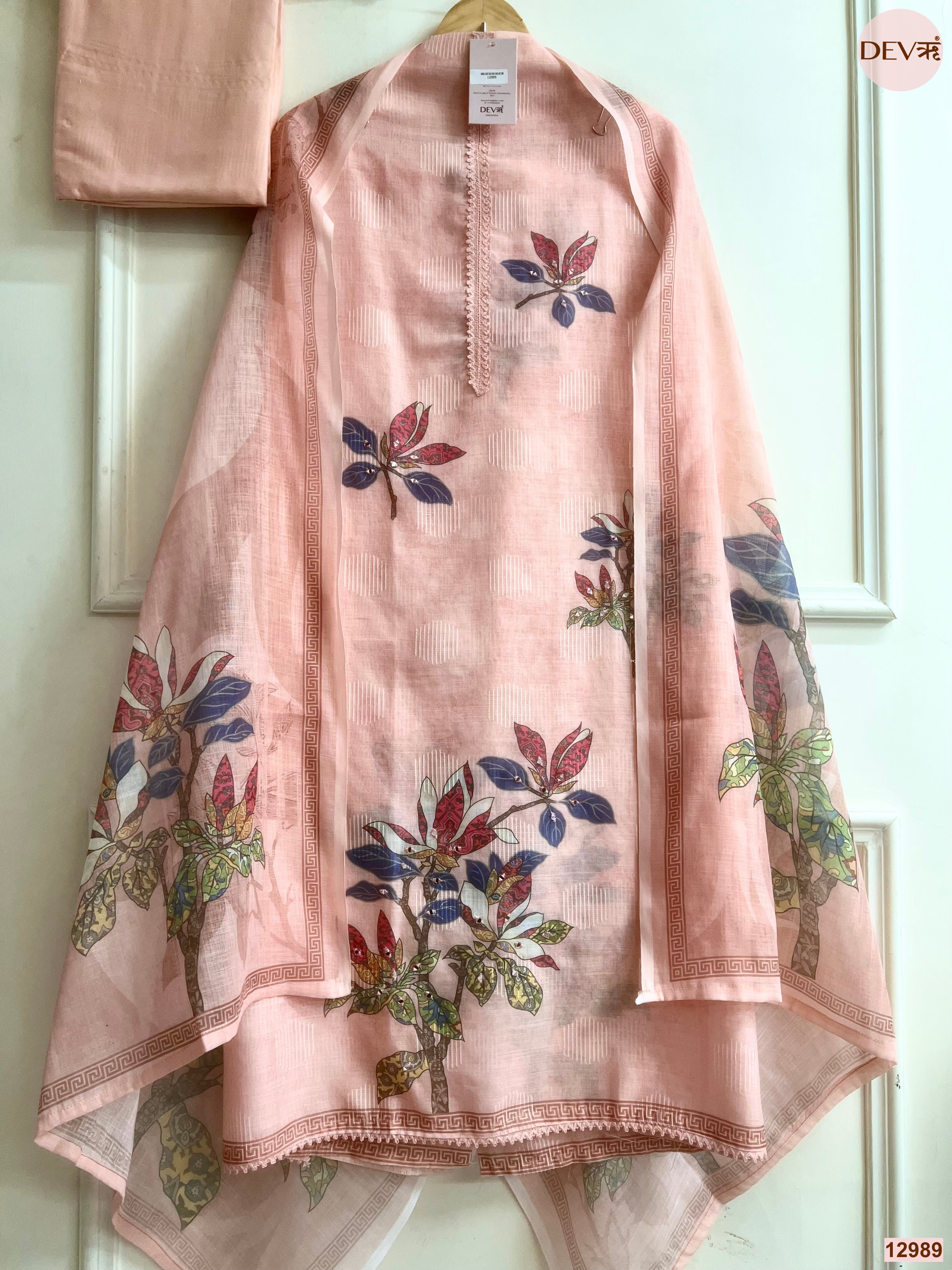 A graceful peach unstitched suit set in linen, this design features printed botanical motifs in soft yet striking tones, balanced with subtle woven dot-texture across the shirt for a refined finish. The neckline is accented with delicate lace detailing, while the coordinating dupatta carries matching floral artwork and an elegant printed border. With a shirt length of 48, this set brings together light texture, gentle colour, and understated sophistication.