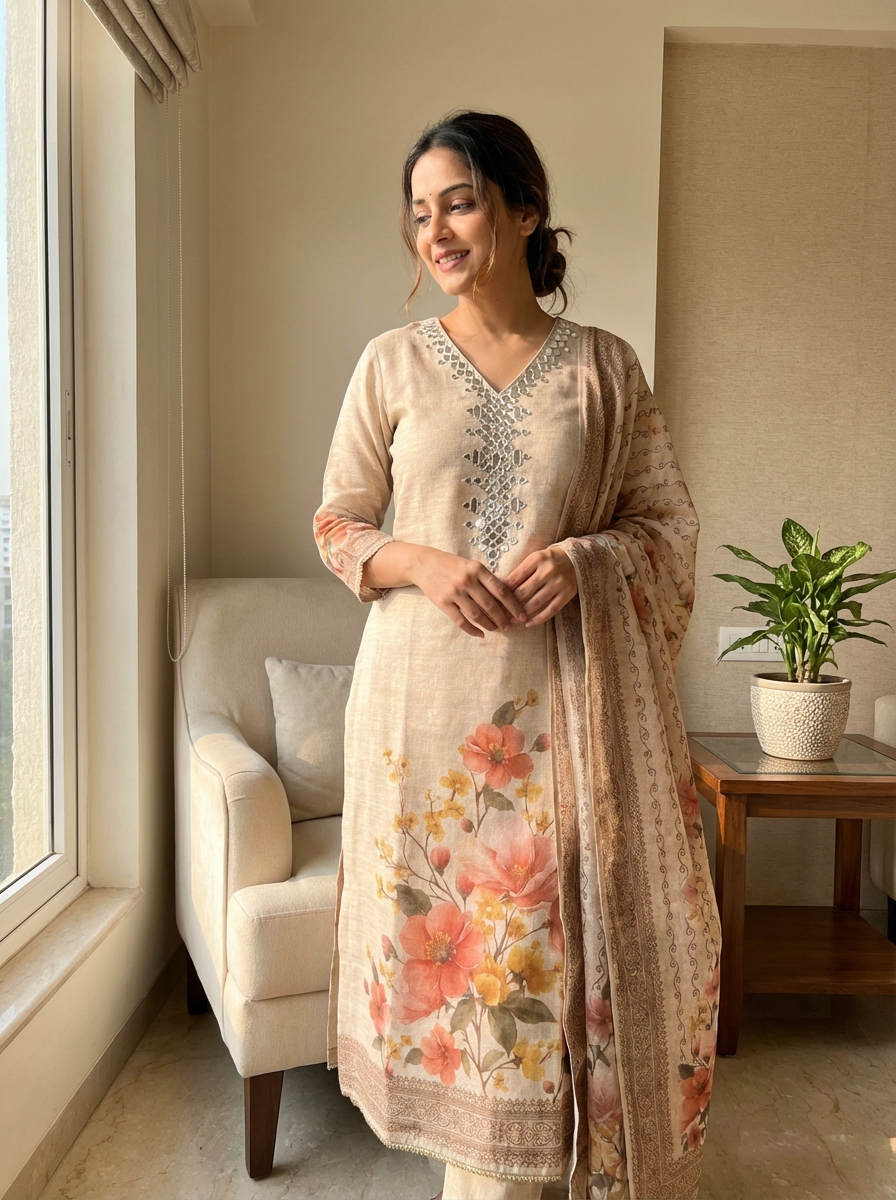 Rendered in a soft beige tone, this unstitched 3-piece suit brings together delicate floral printing with a graceful linen texture for an understated yet polished look. The shirt features a floral printed hem with a mirror-work accented neckline that adds gentle luminosity, while the dupatta echoes the design with blooming floral motifs, ornamental printed borders, and tassel accents. Paired with a coordinated bottom and a shirt length of 48 inches, the ensemble feels refined, airy, and distinctly elegant.