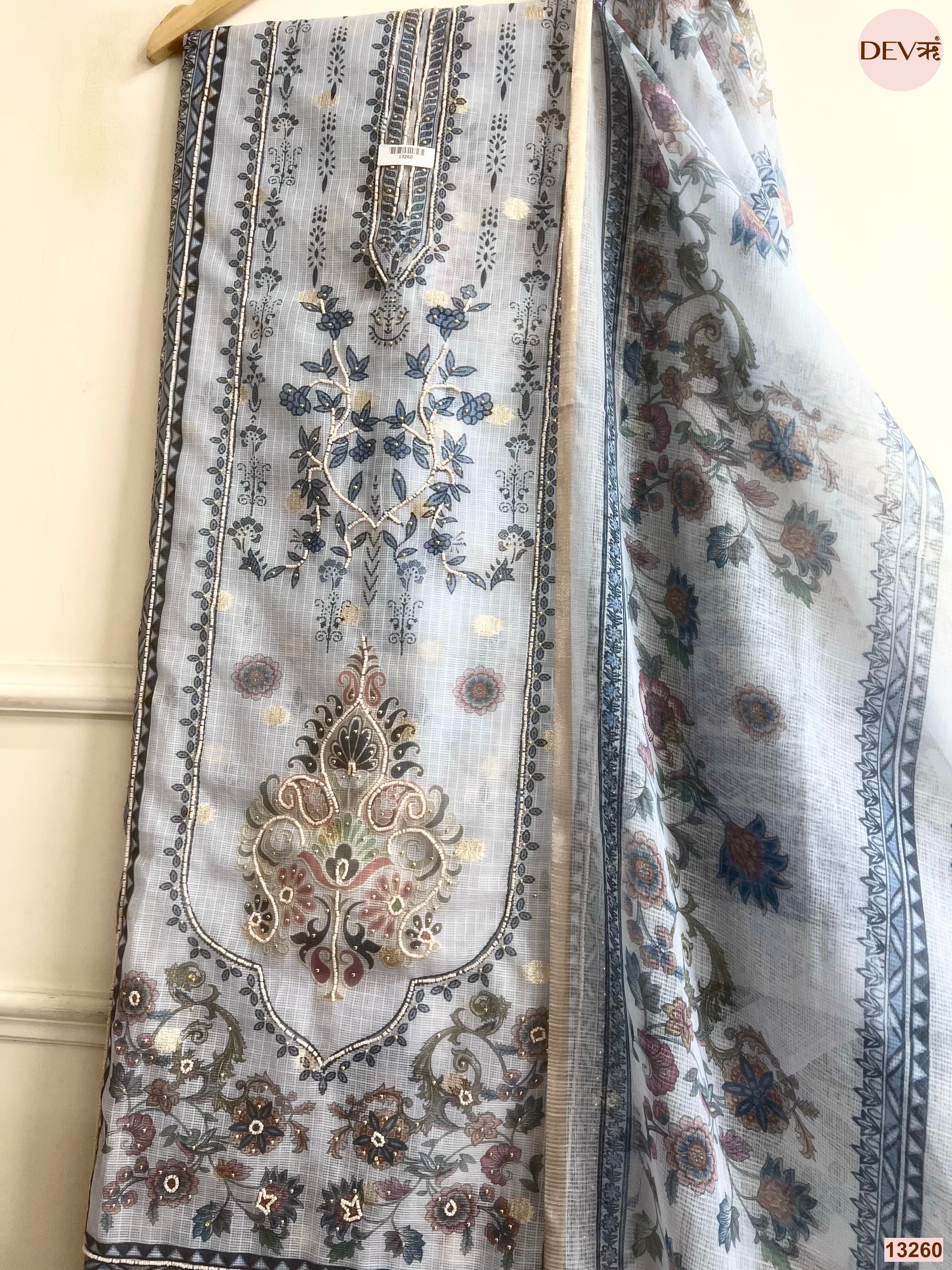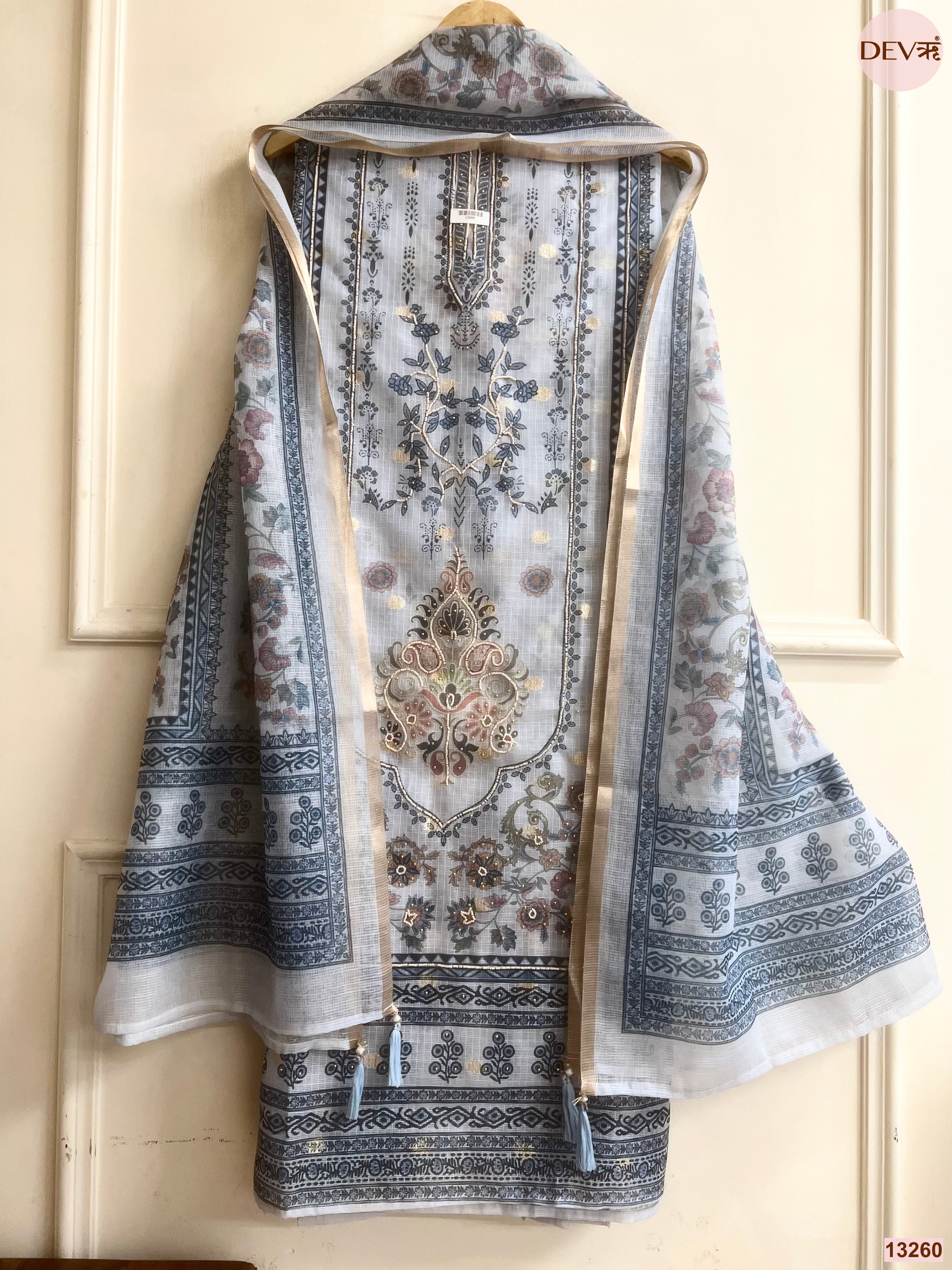 Rendered in a soft blue base, this unstitched 3-piece suit showcases an elegant printed composition with vertical ornamental patterns, delicate floral motifs, and intricately placed border detailing. The Kota shirt lends a light, airy texture, while the coordinated dupatta carries floral prints and detailed borders that enhance its refined appeal. Subtle accent embellishments near the neckline and central motif add gentle richness, and the 48-inch shirt length offers graceful coverage.