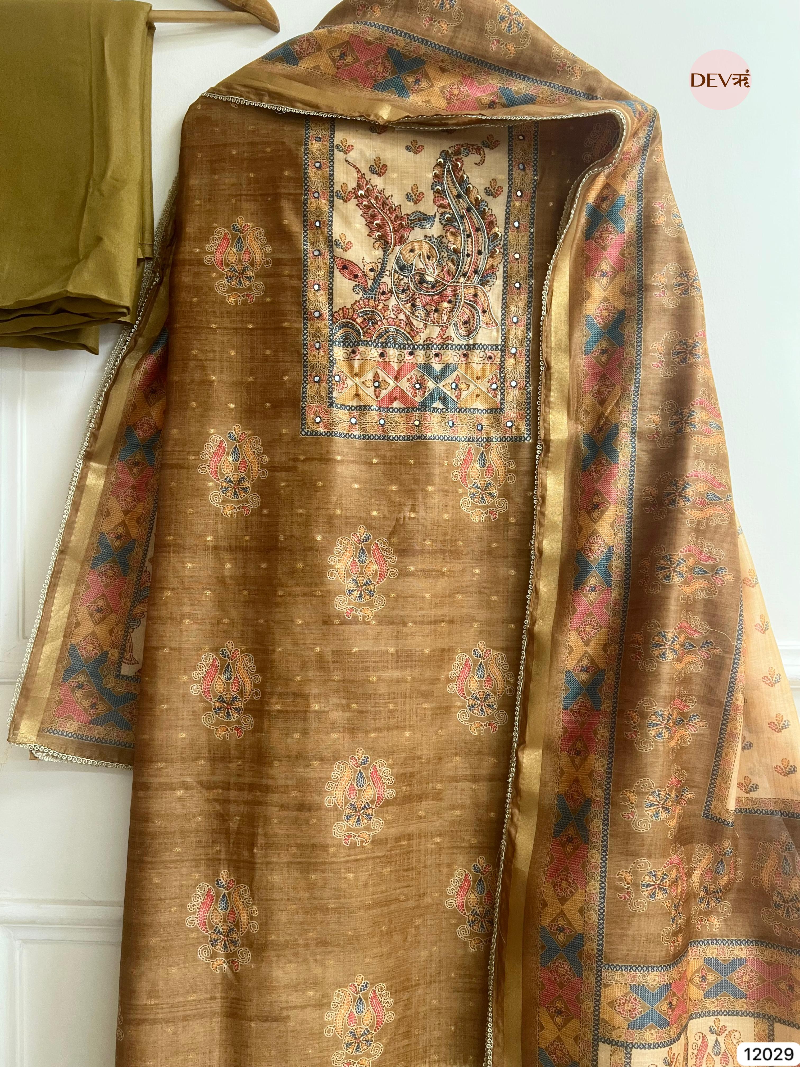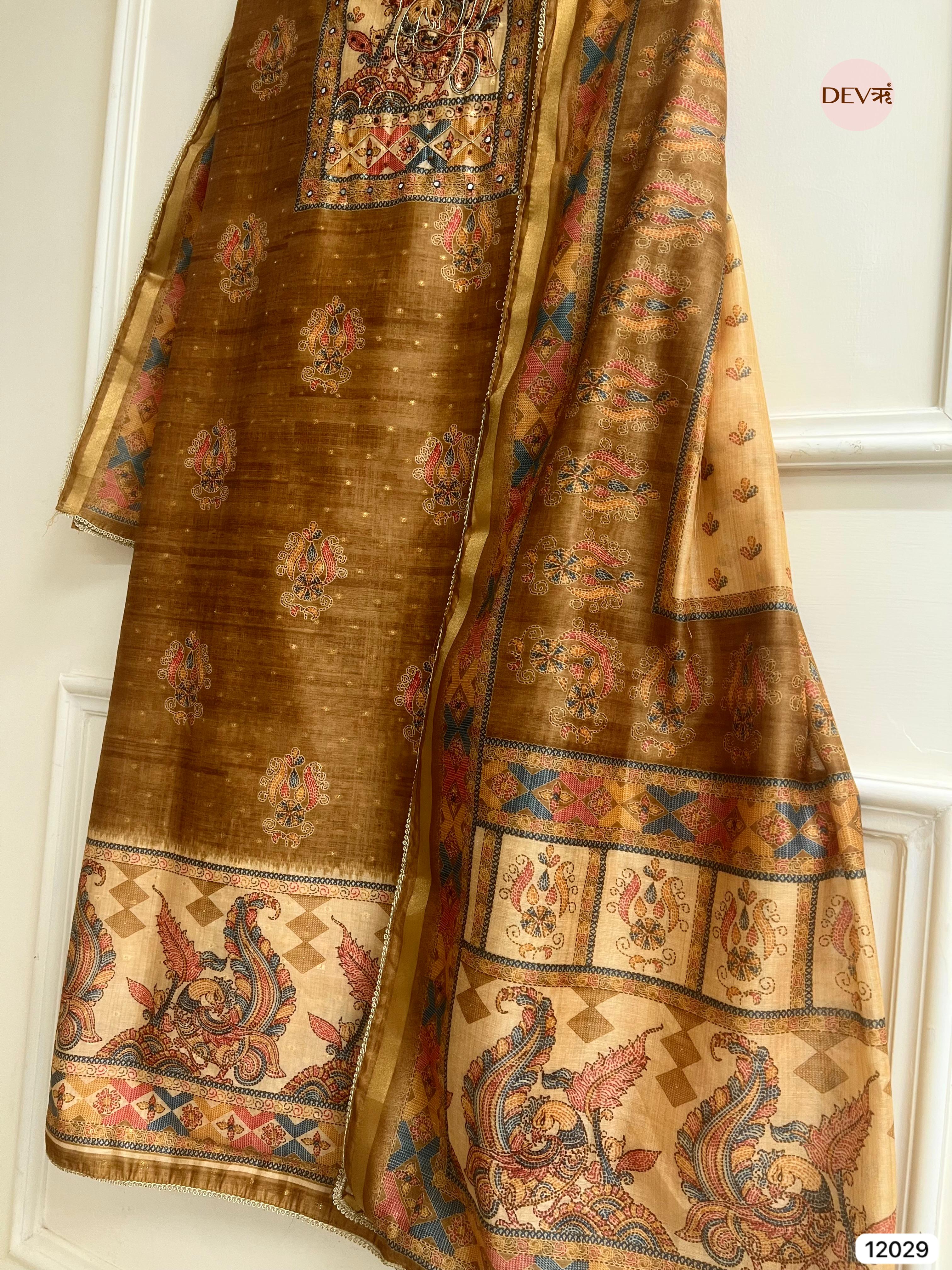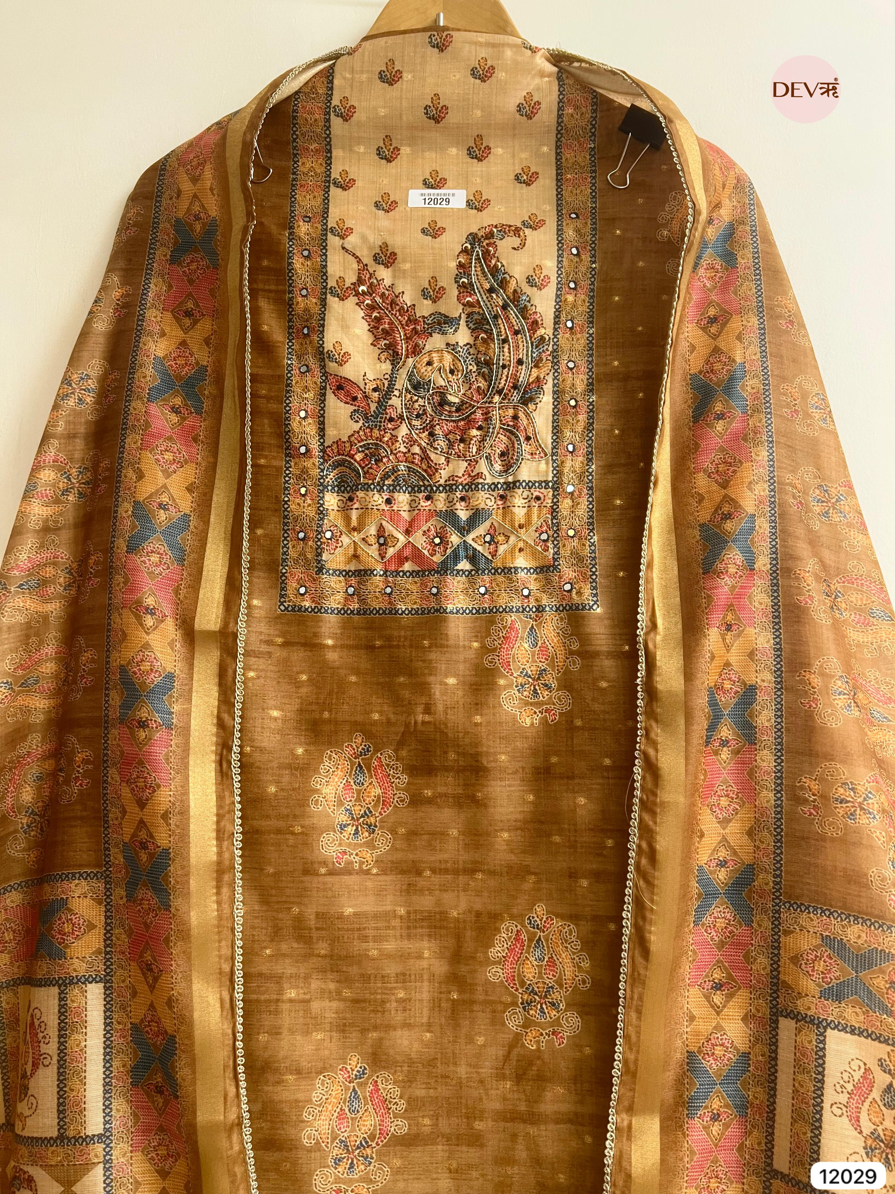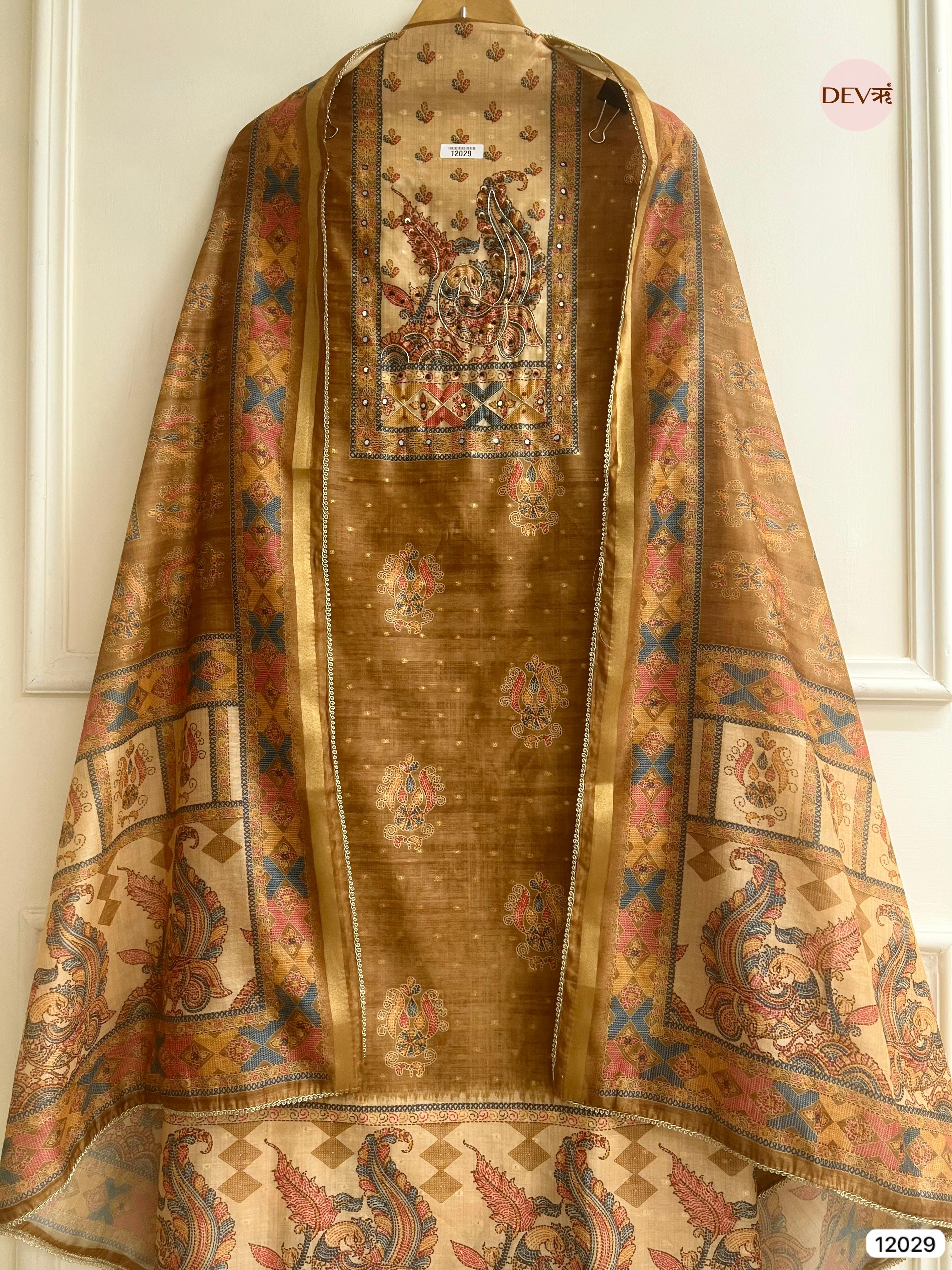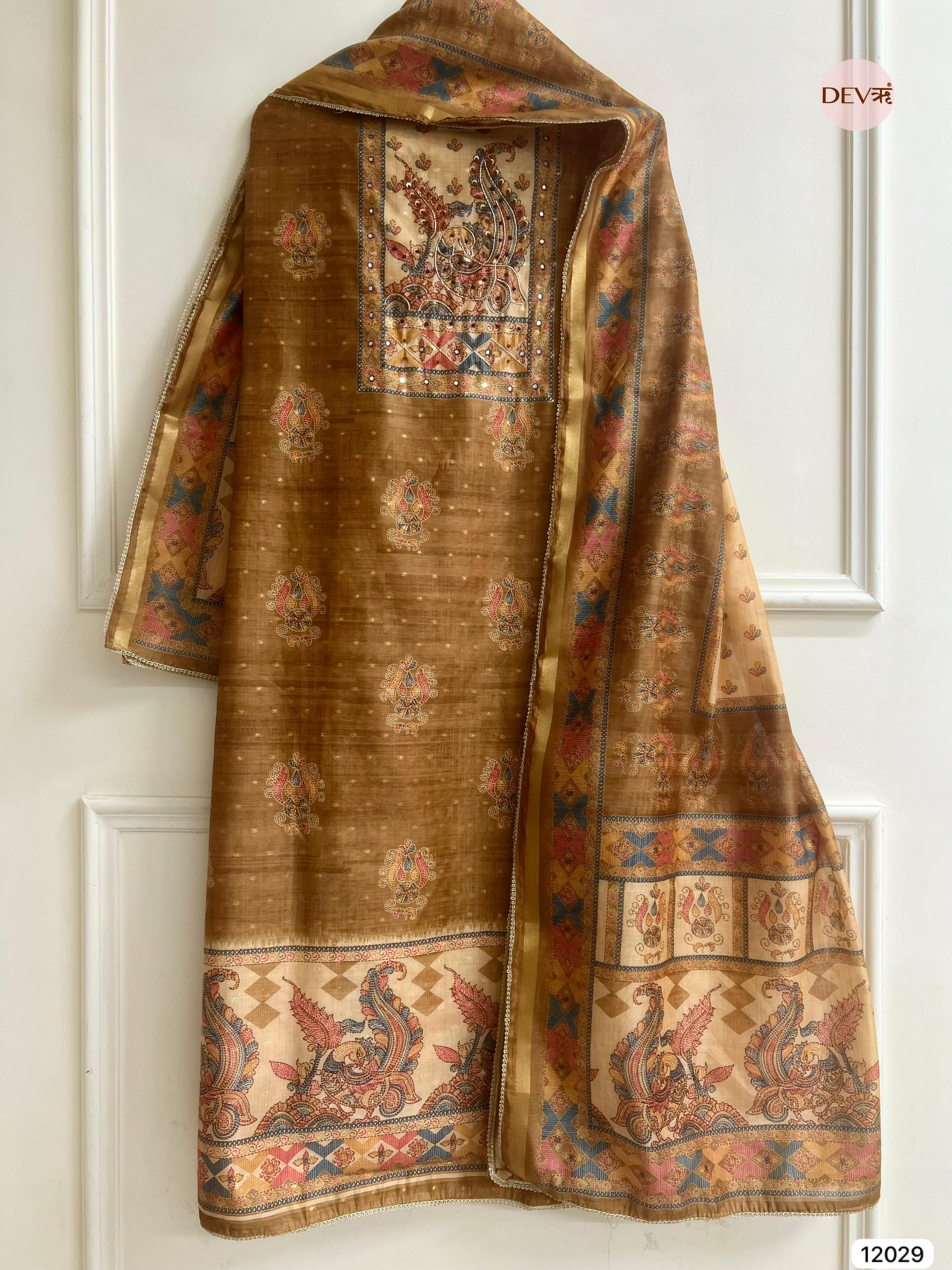 Shirt - Tusser khadi silk printed unstitched hand embroidered