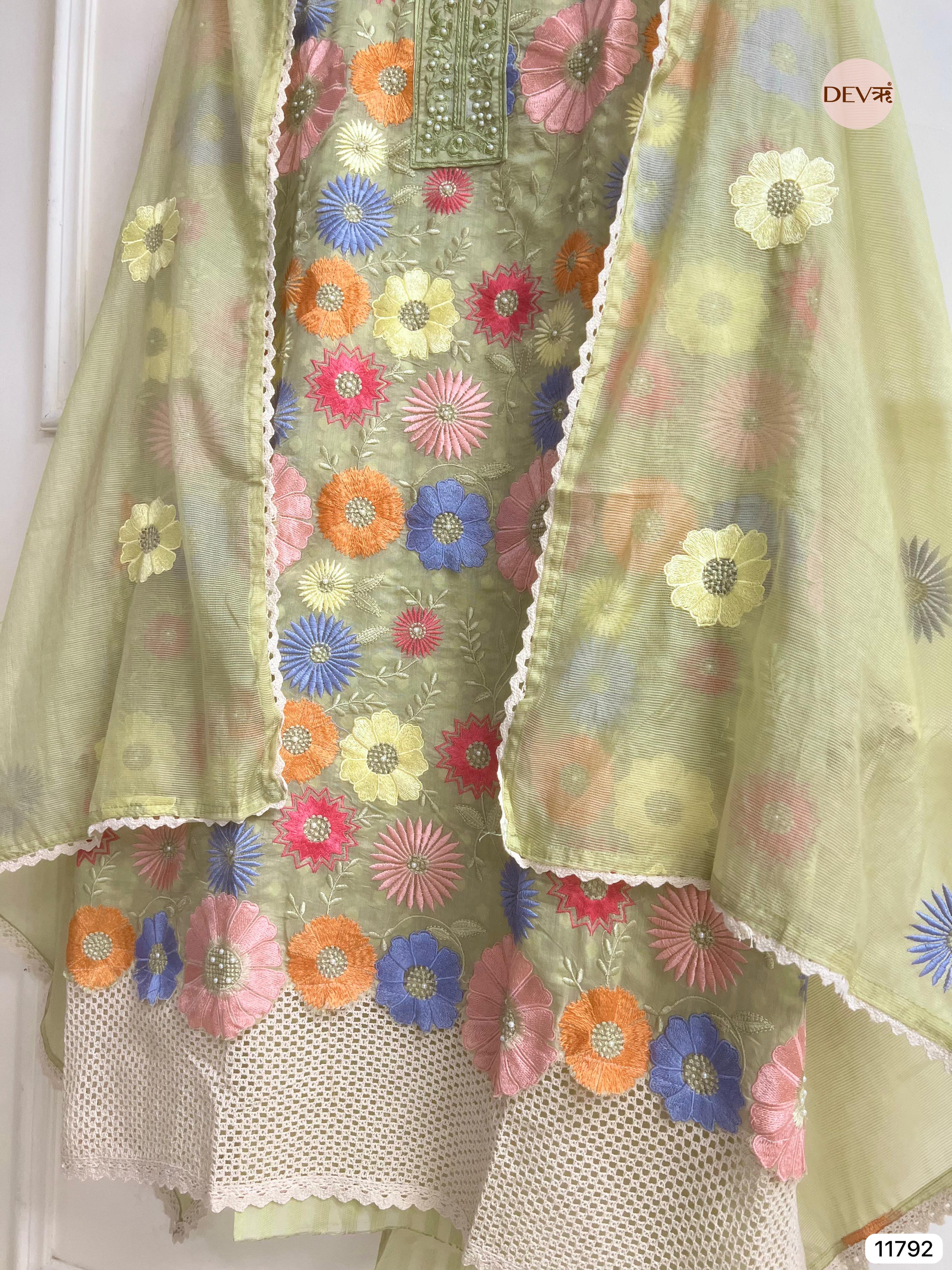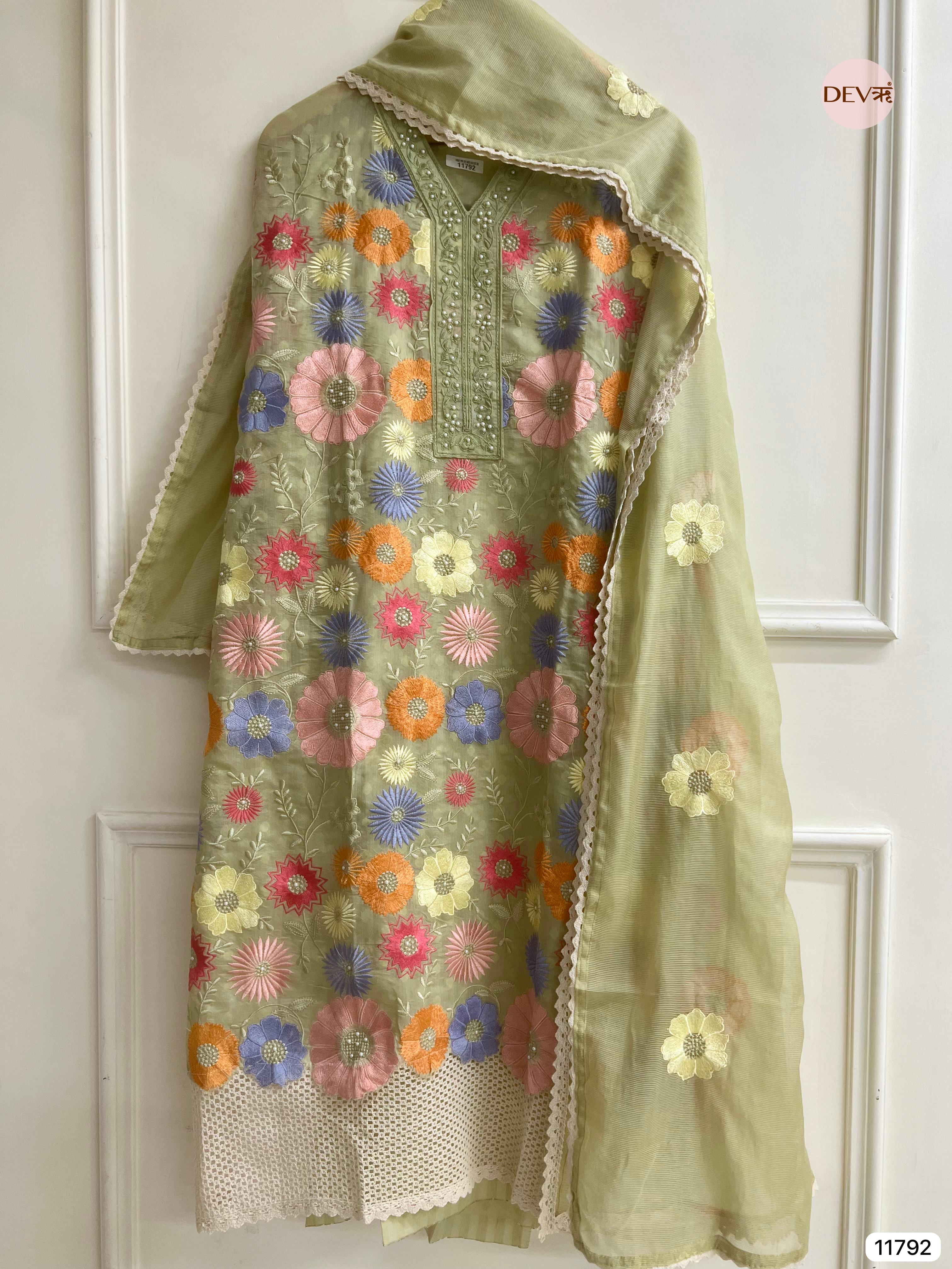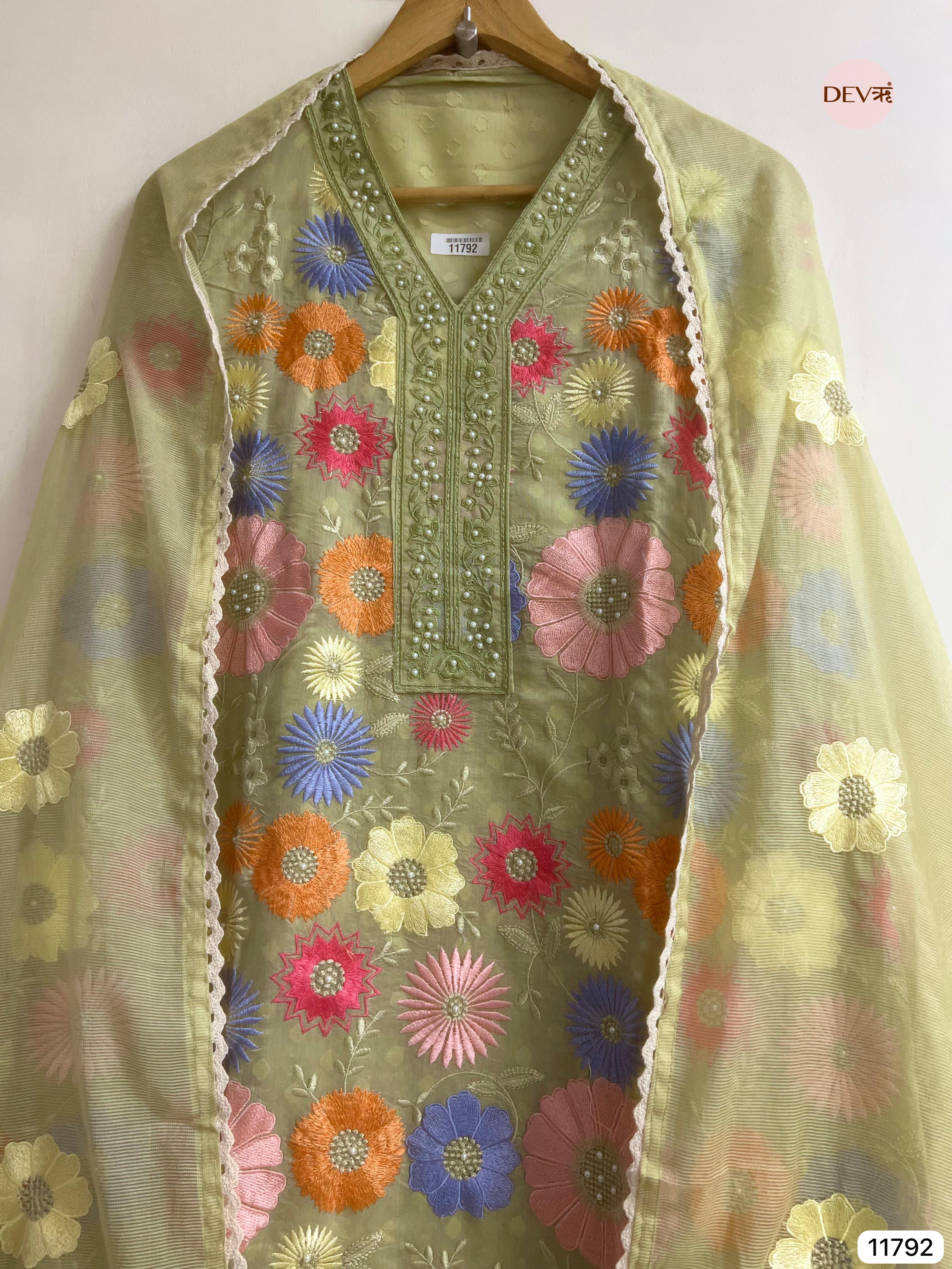 Green Mul Chanderi unstitched embroidered -Set Of 3