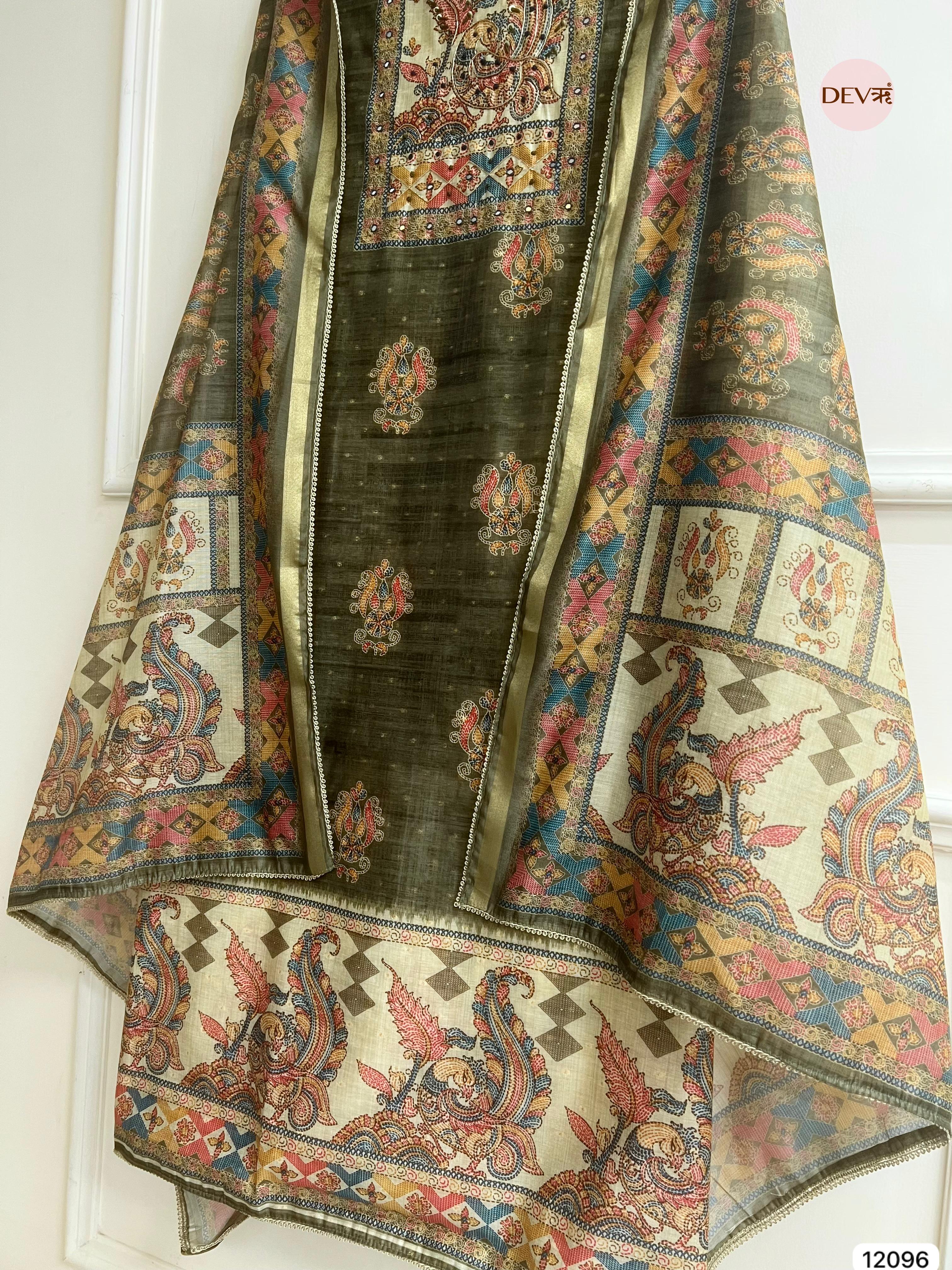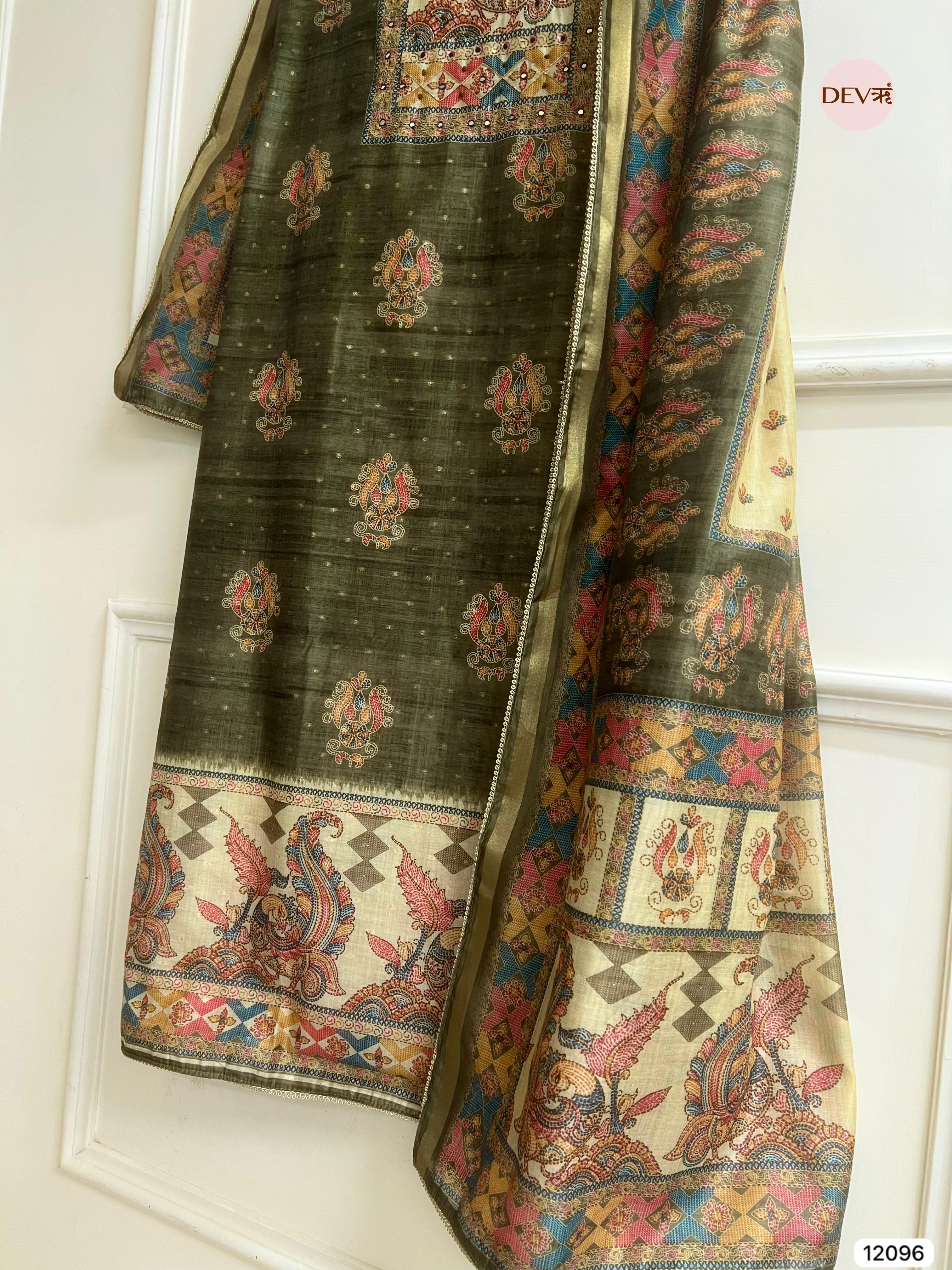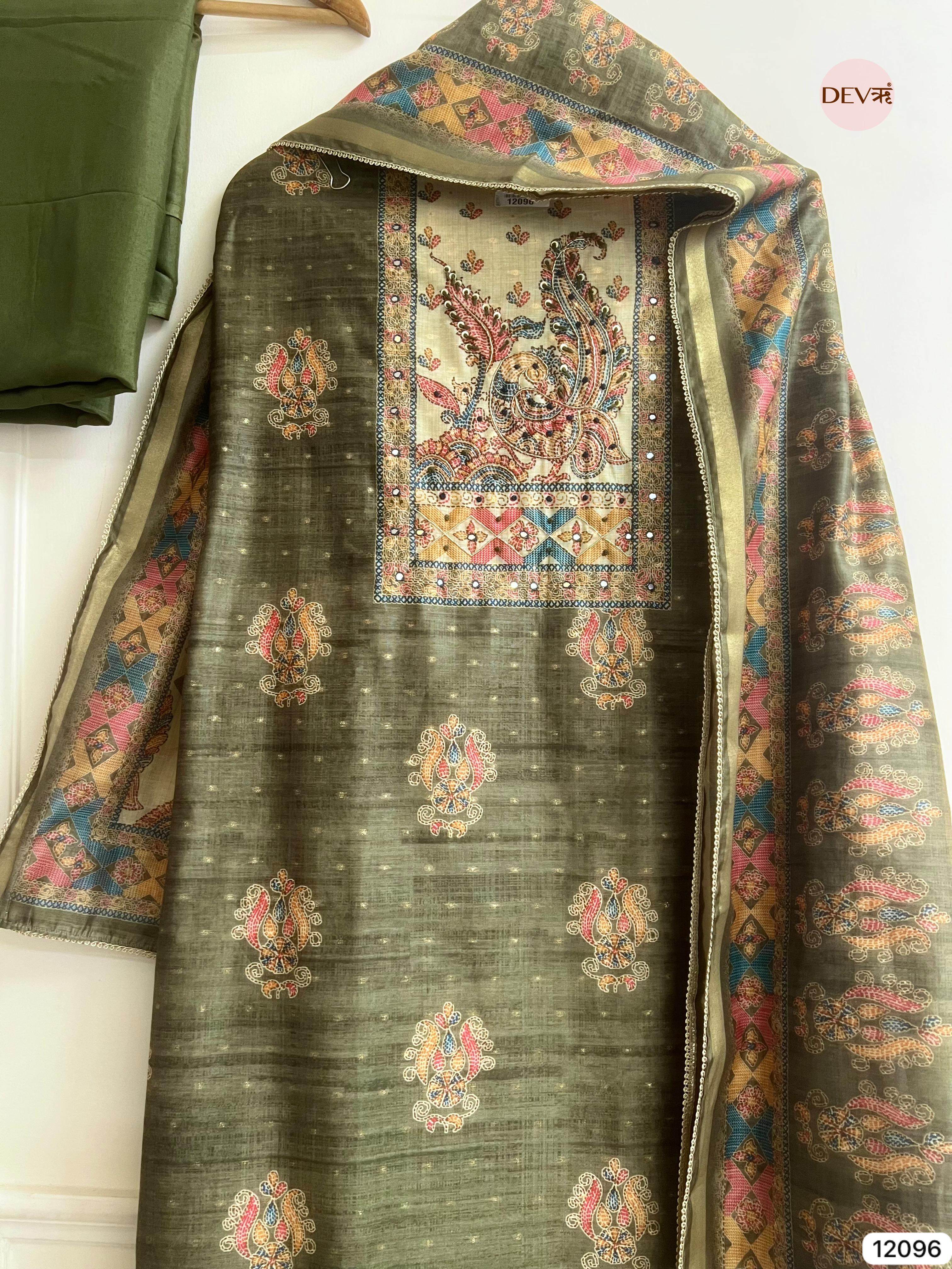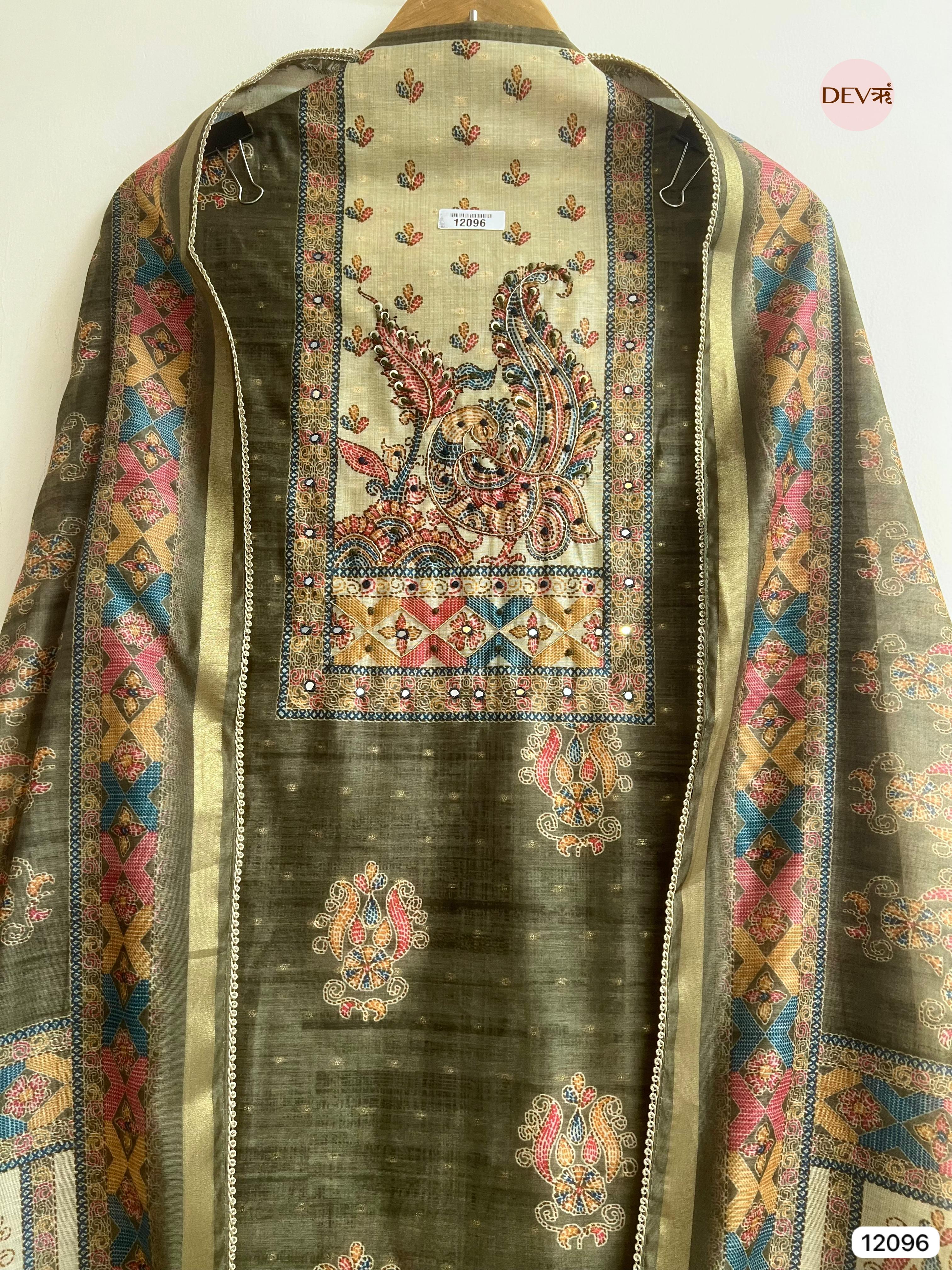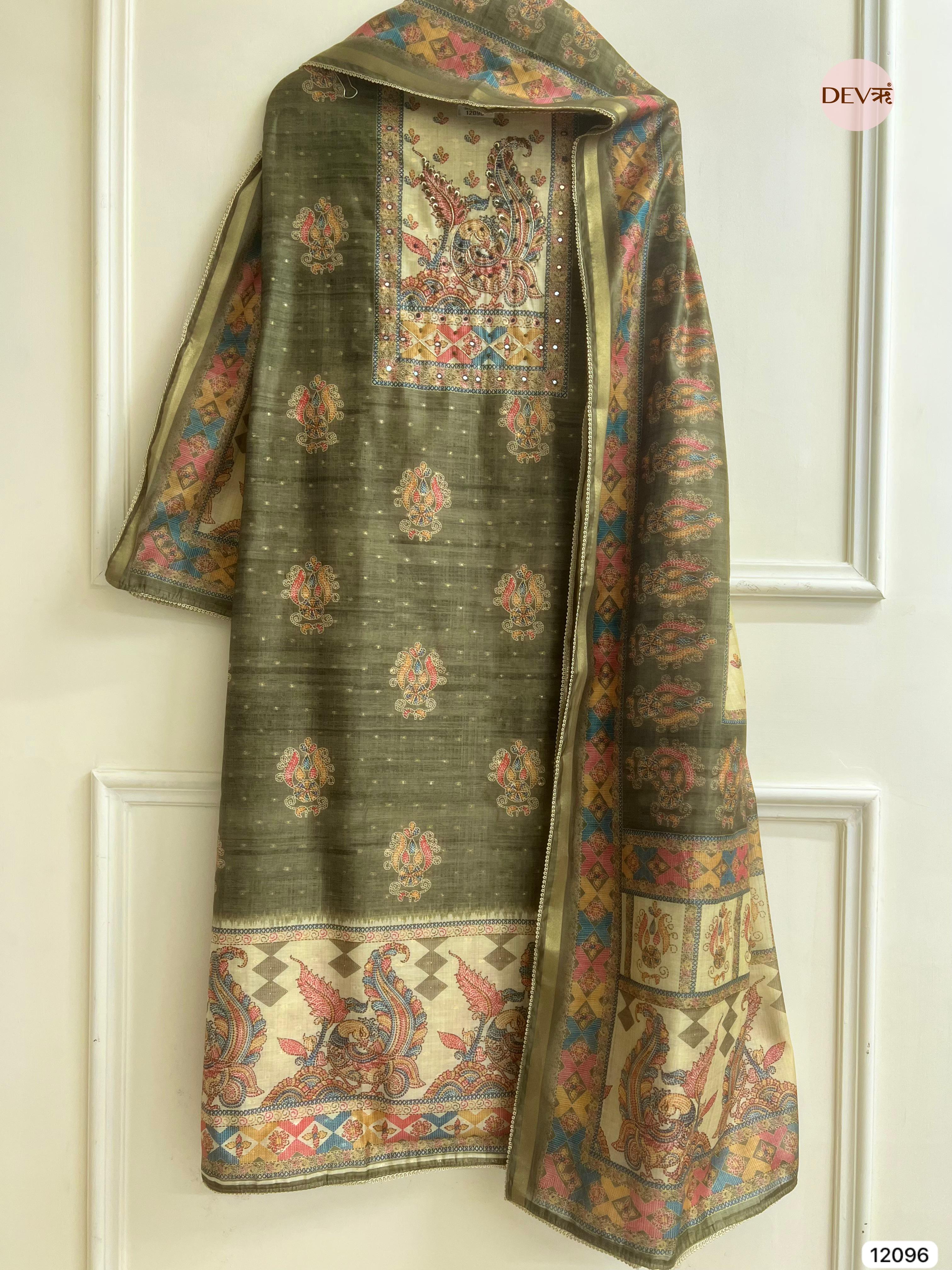 Shirt - Tusser khadi silk printed unstitched hand embroidered