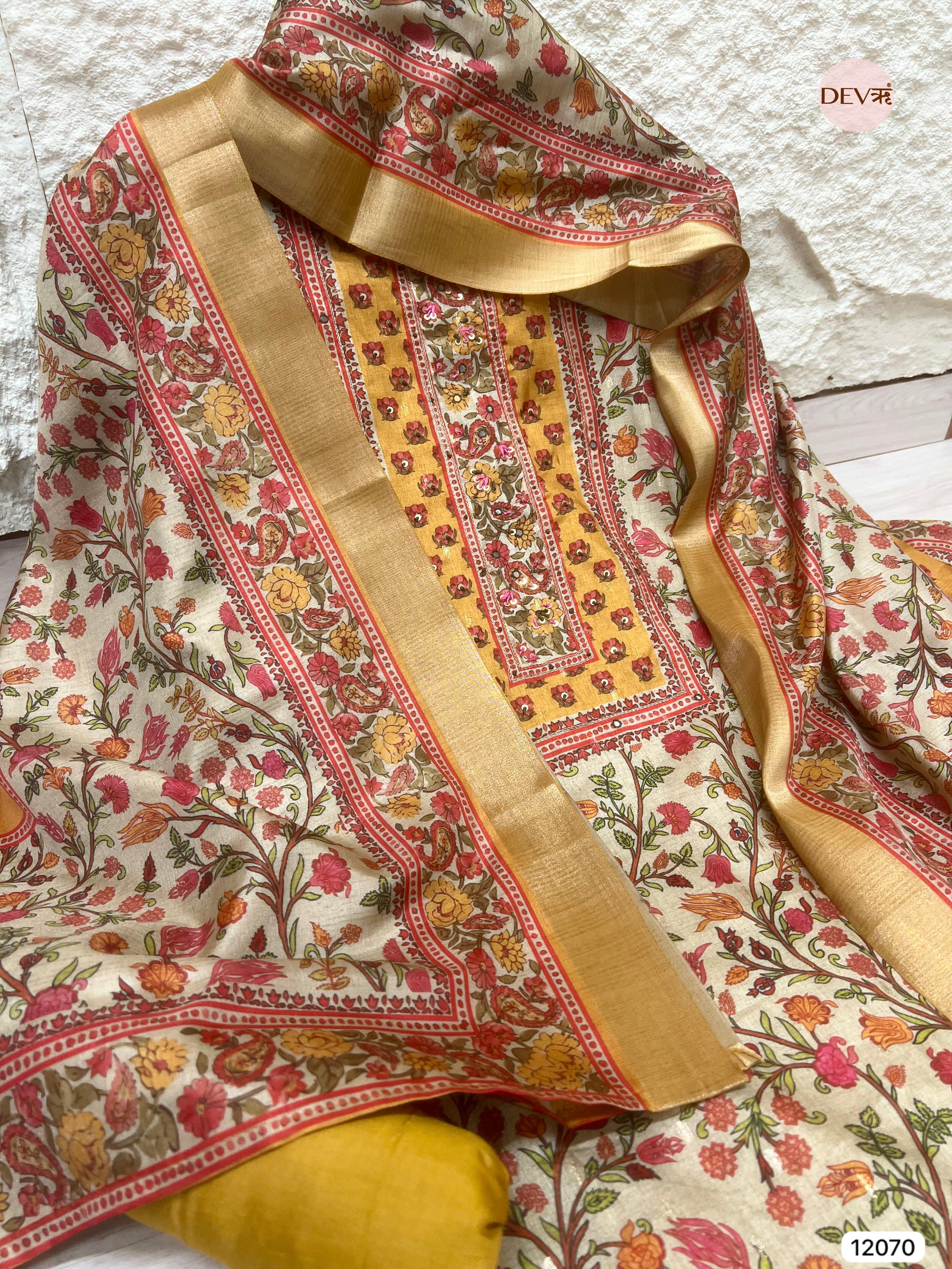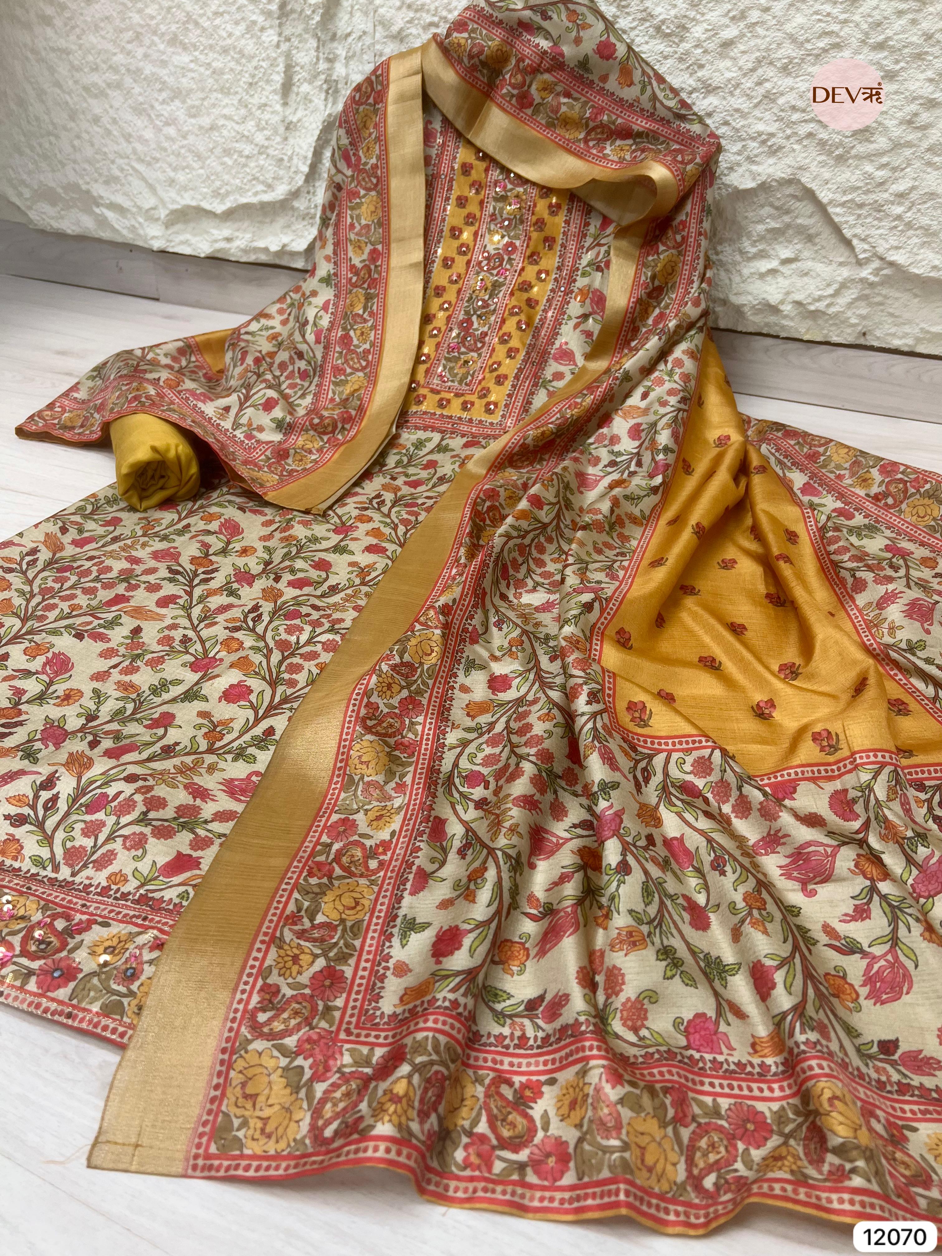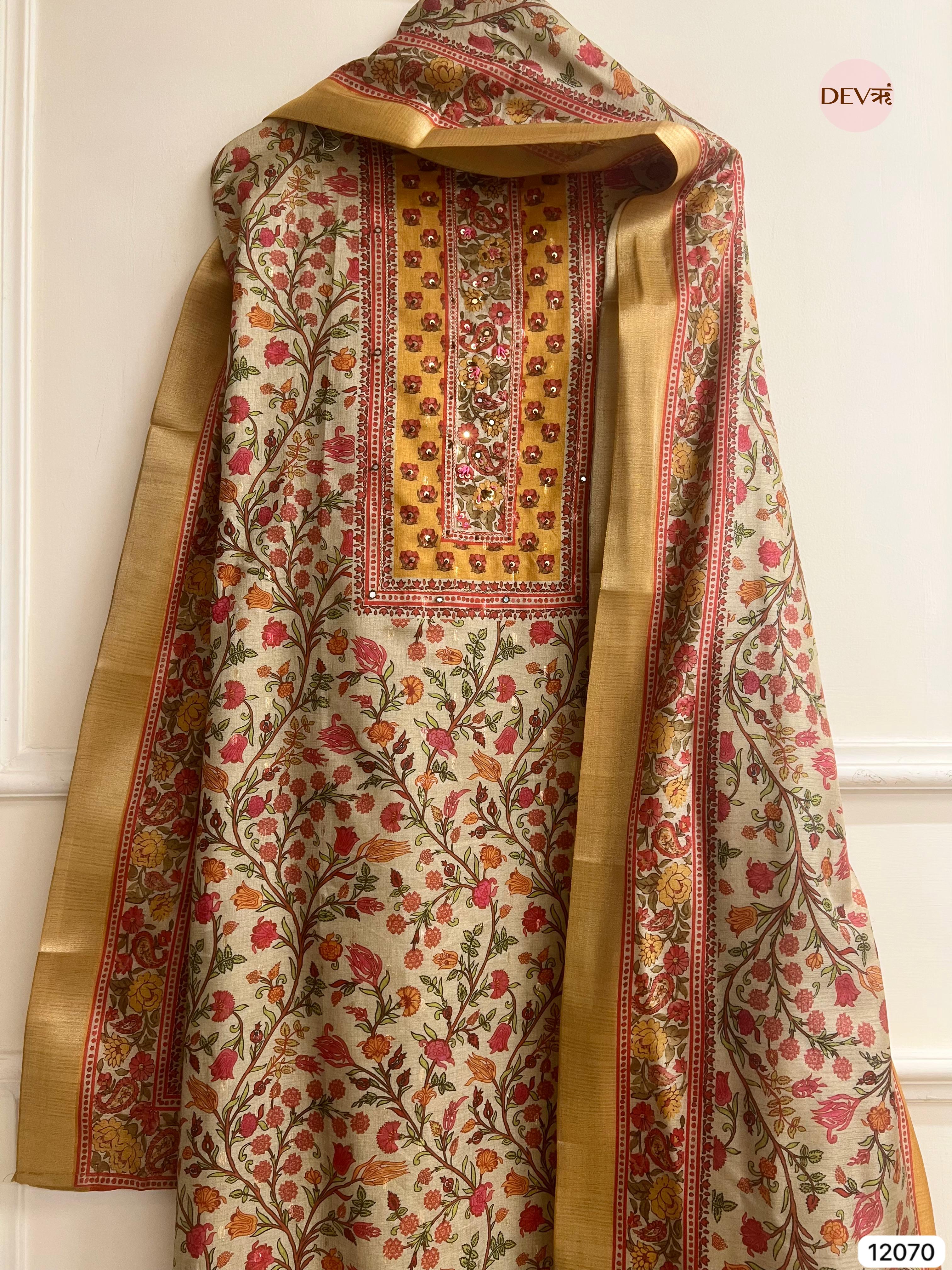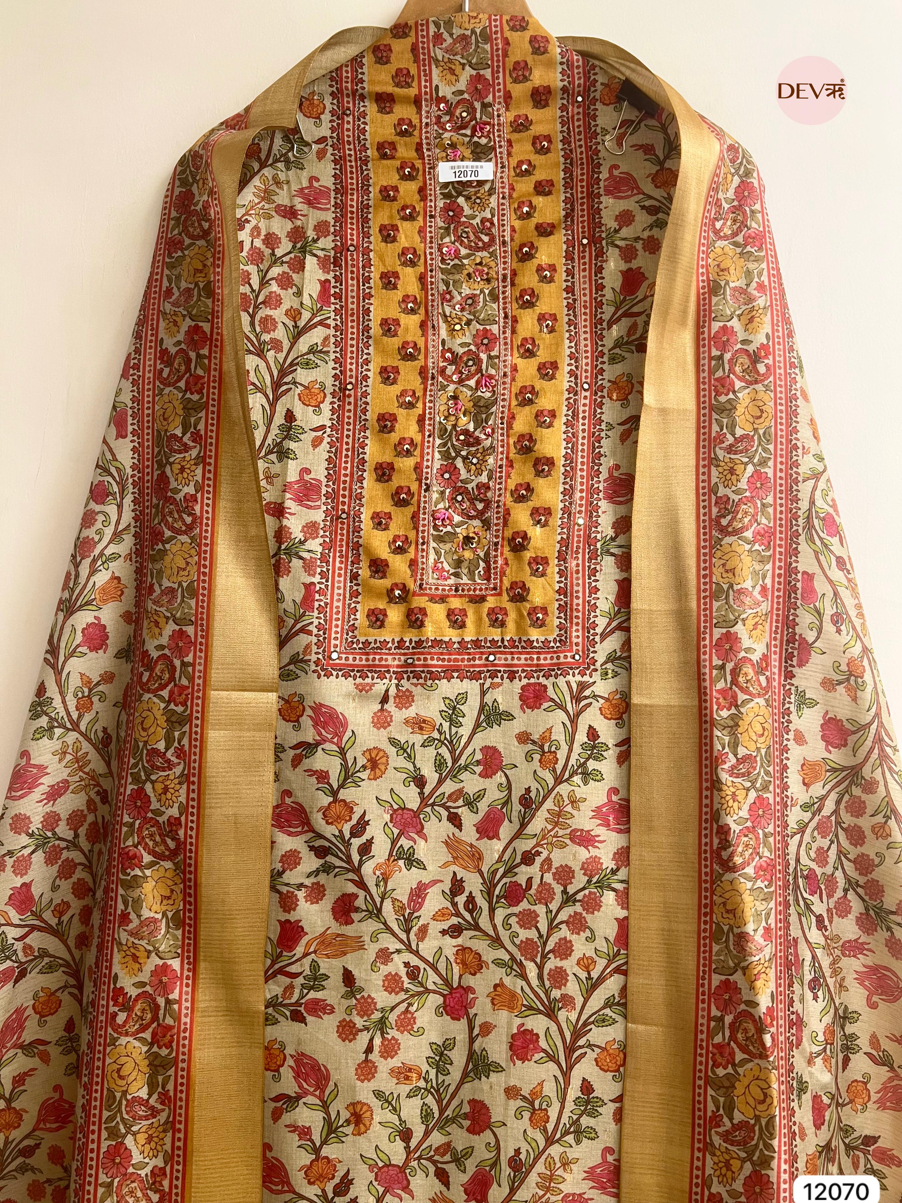 Shirt - Tusser khadi silk printed unstitched hand embroidered