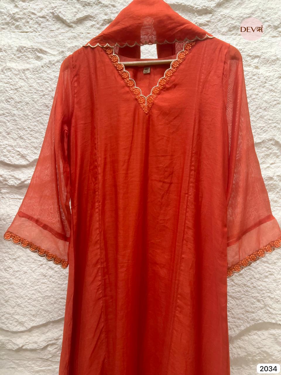 A warm coral-toned ensemble highlighted with elegant lacework along the neckline, sleeves, and hem. The mul chanderi fabric offers graceful movement and a subtle shimmer, complemented by a matching embroidered dupatta. A timeless silhouette crafted for effortless sophistication.